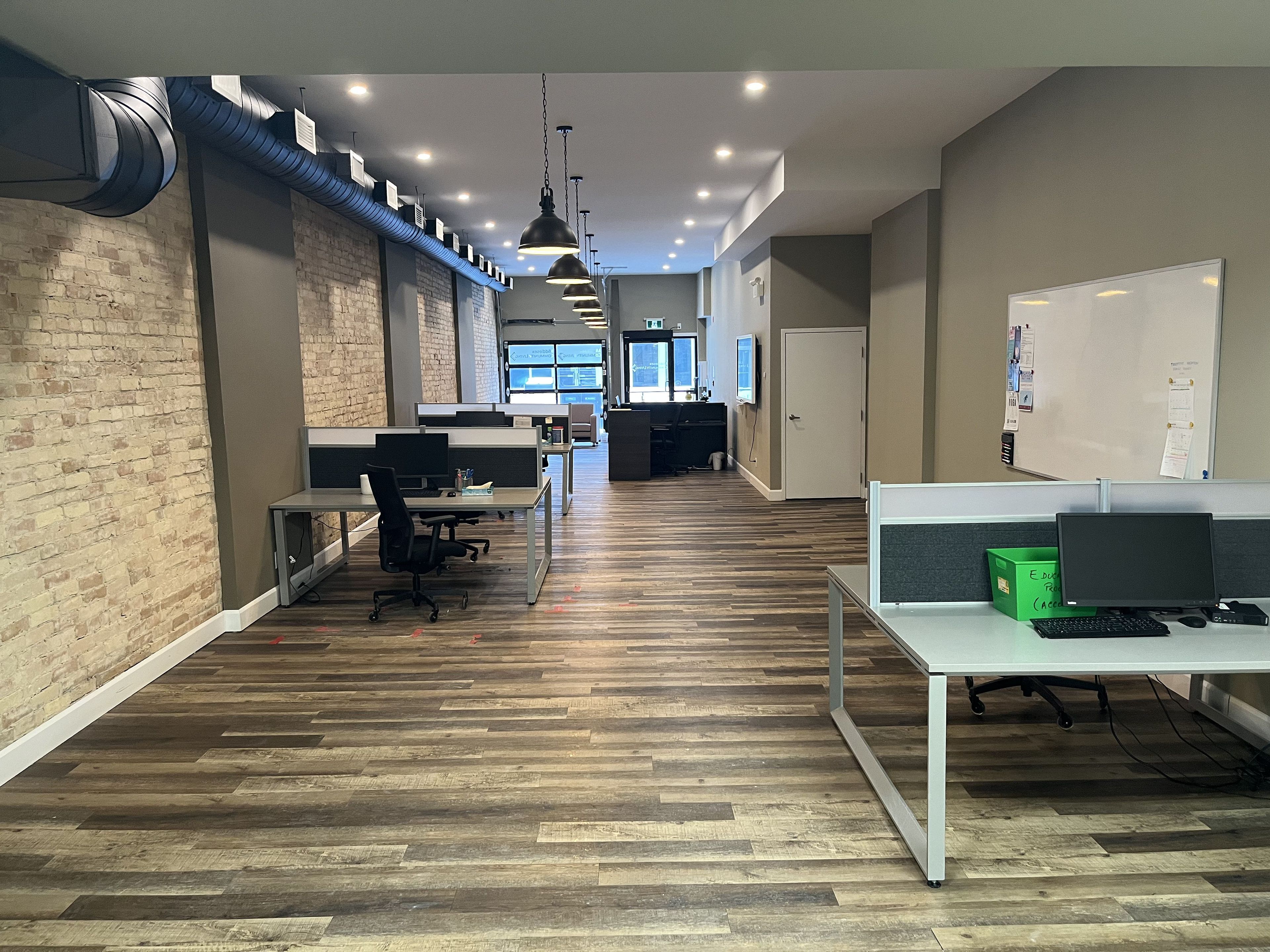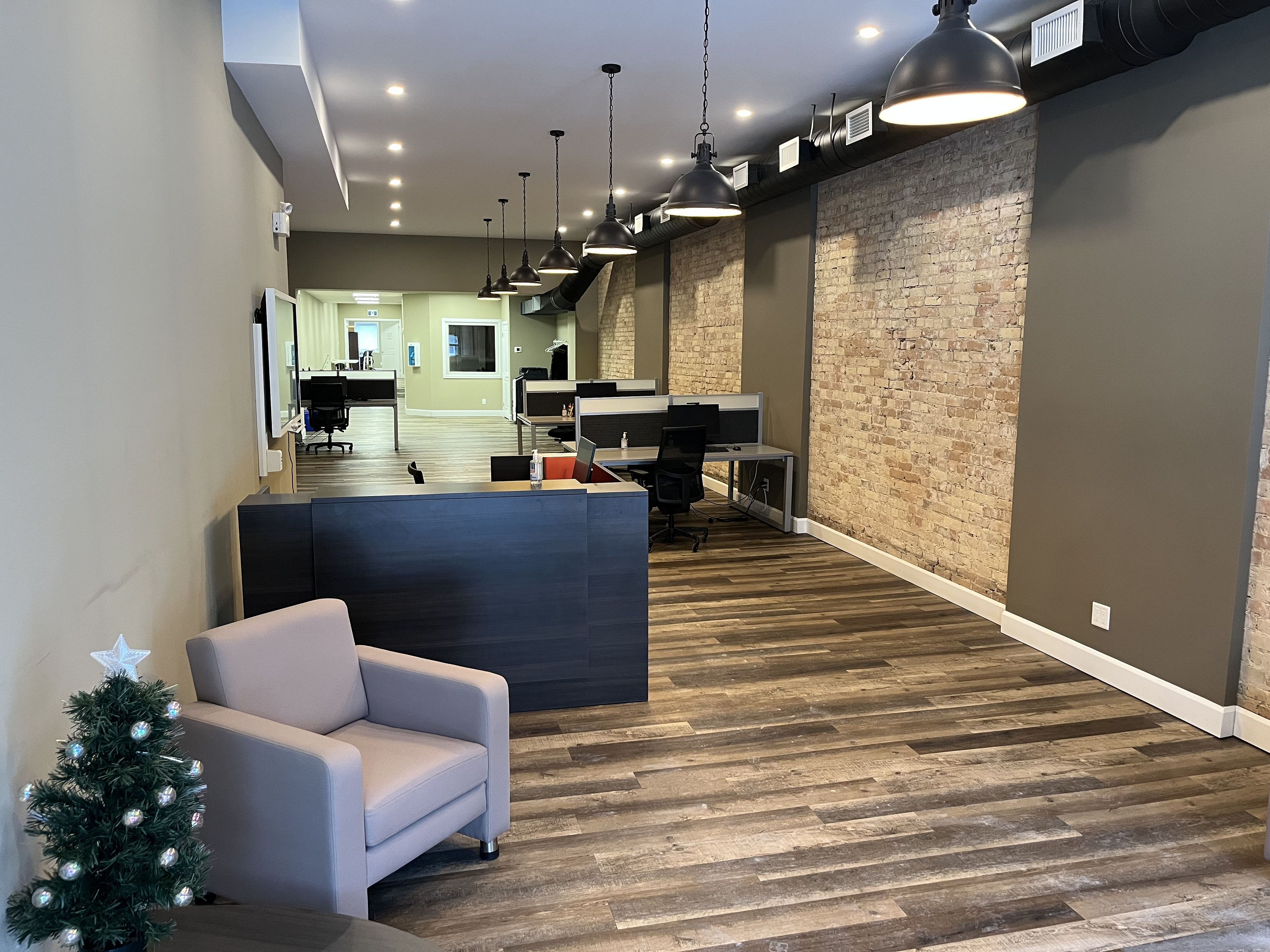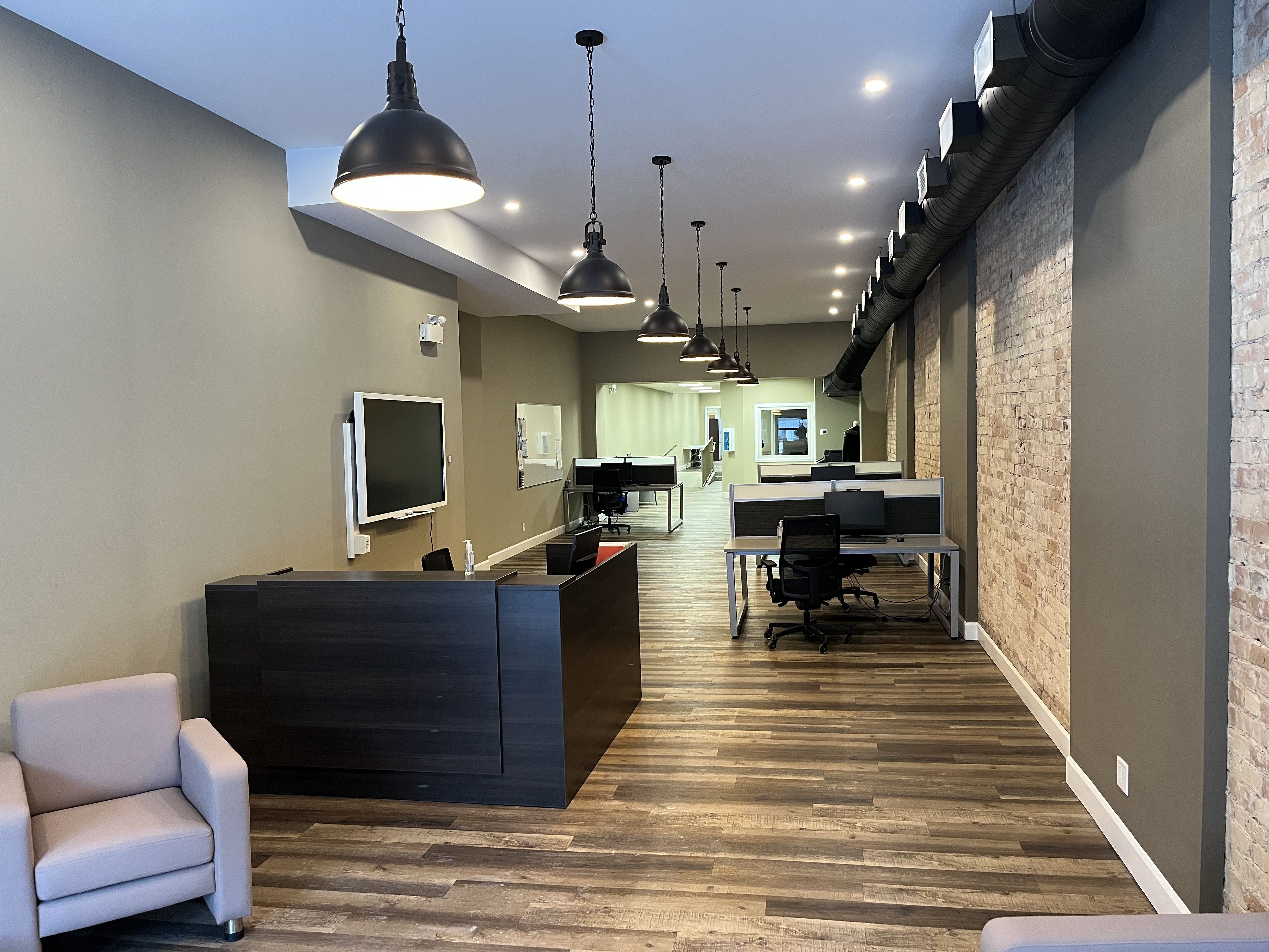 • Modern, open concept layout with exposed brick and updated lighting.