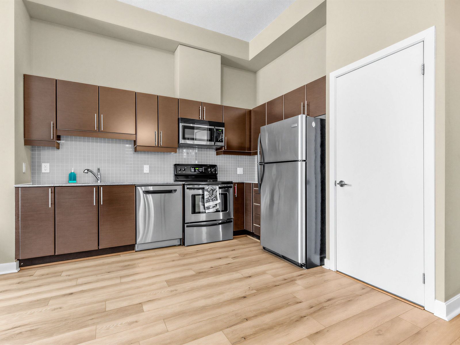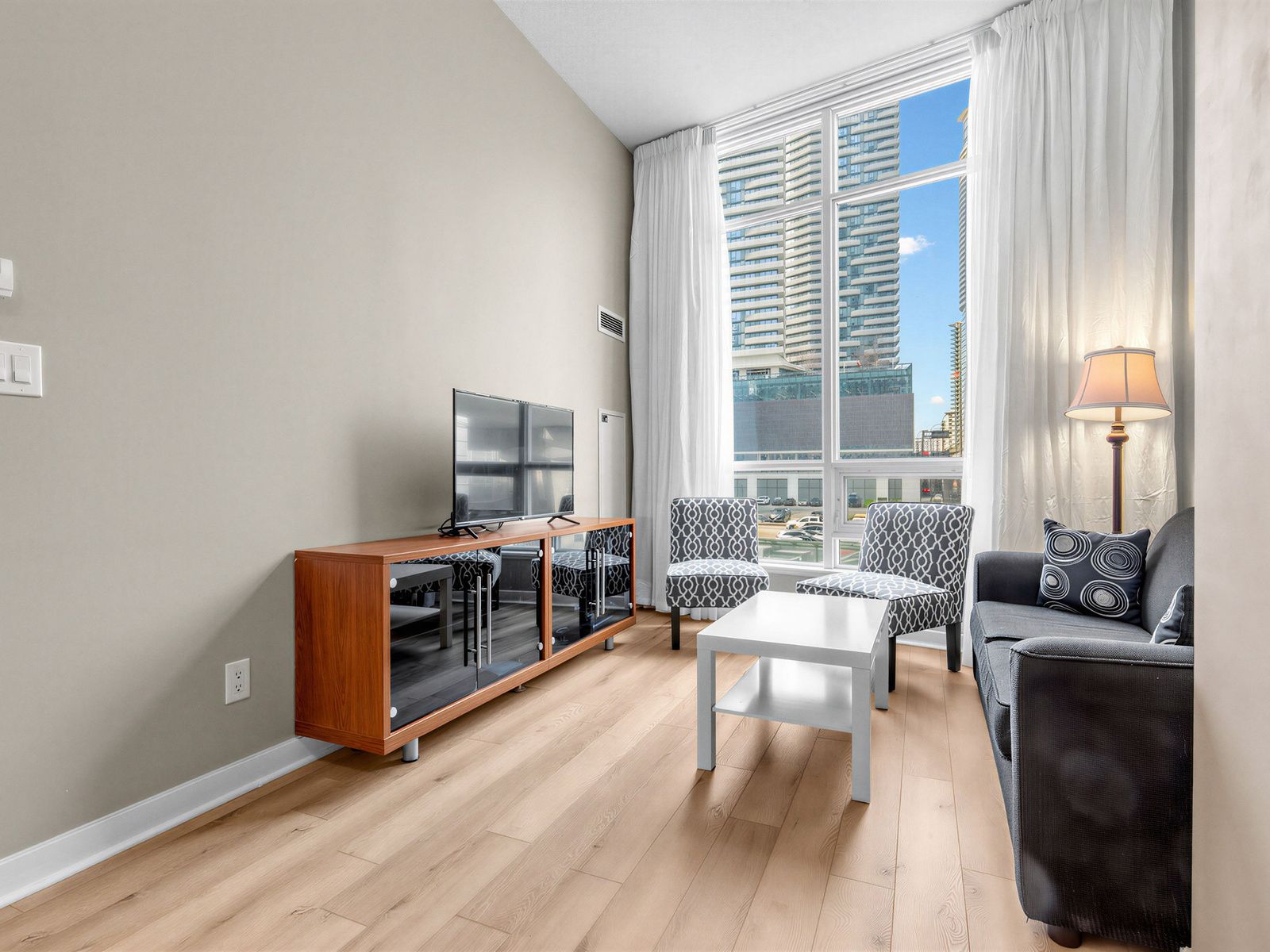 • Loft-style 1+Den unit with high ceilings and floor-to-ceiling windows.