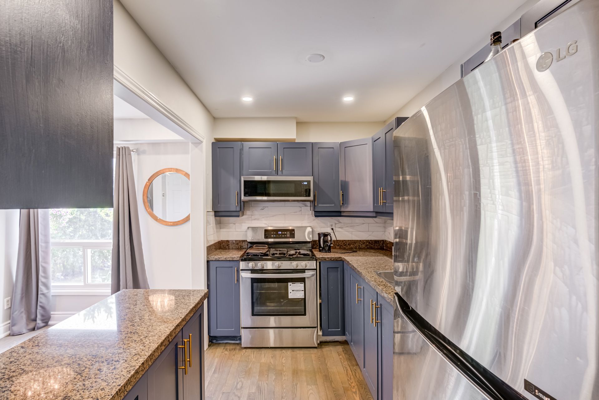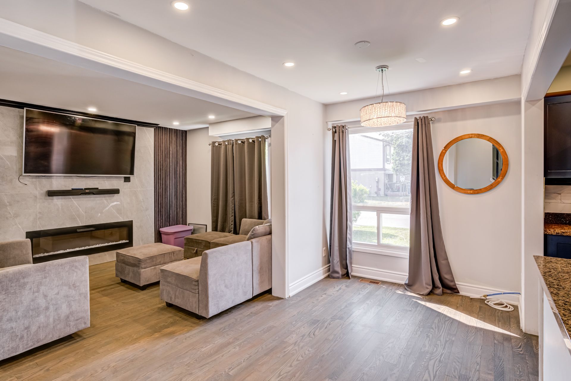 • Renovated kitchen and living room with modern features and smooth ceilings.