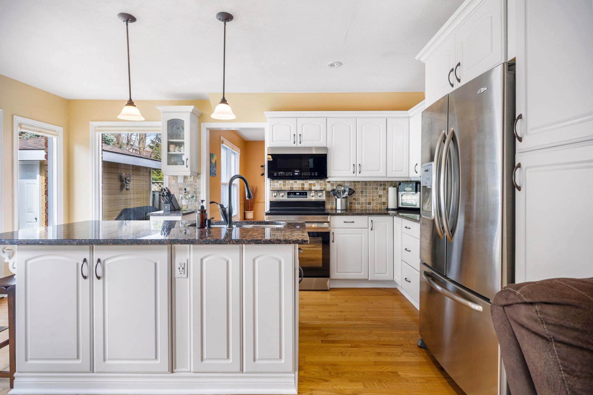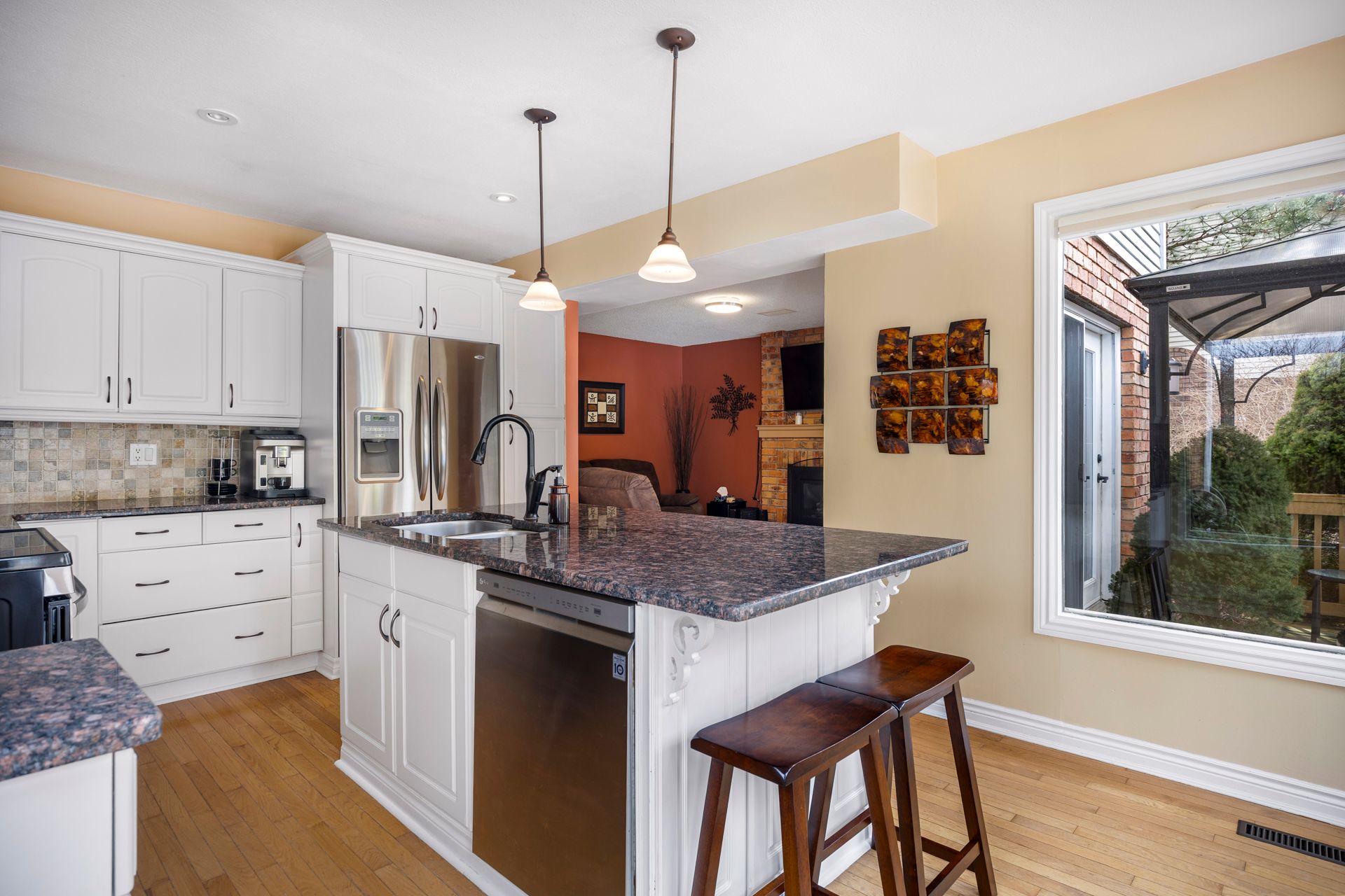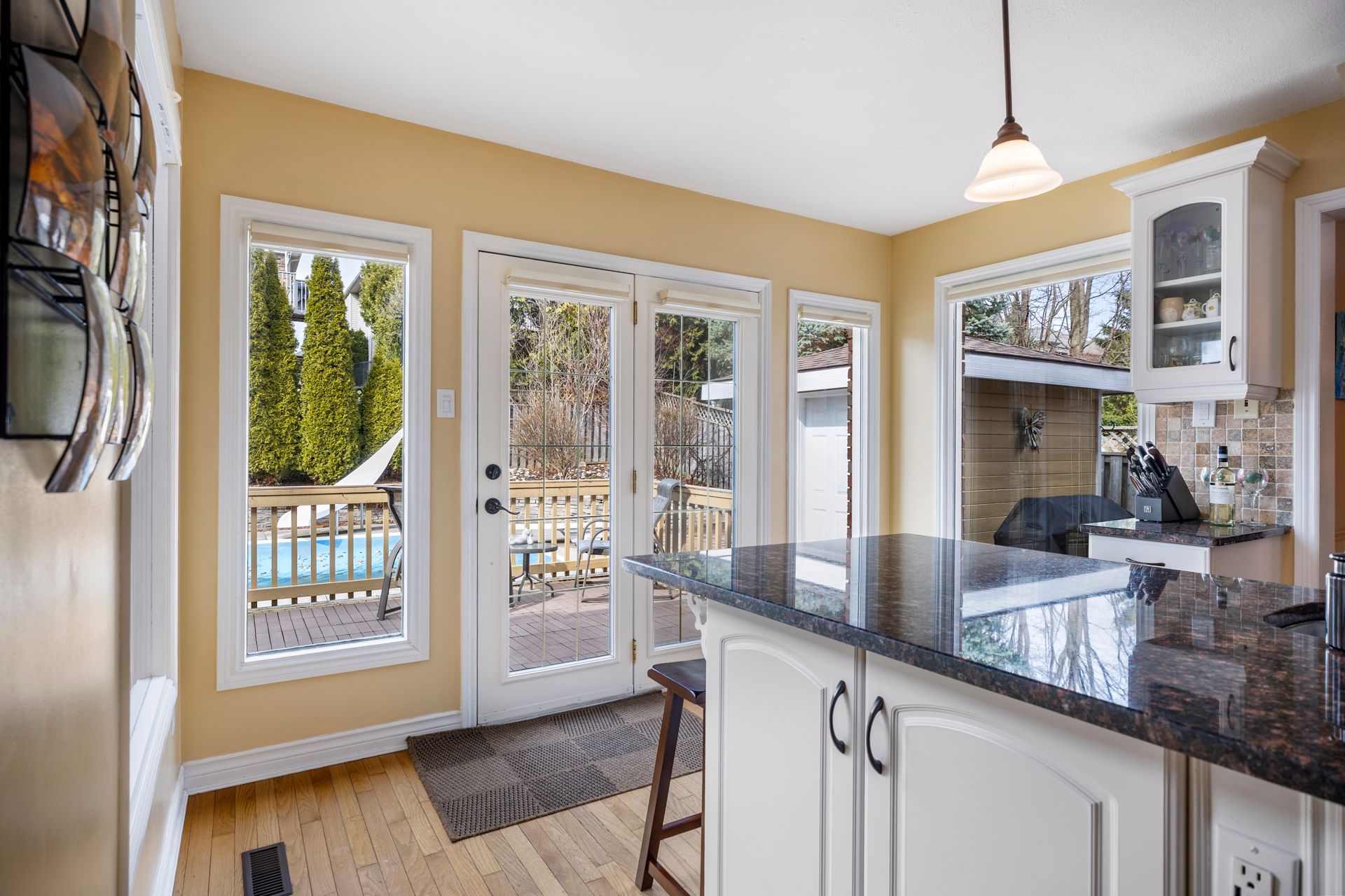 • Bright kitchen with granite counters and open family room.