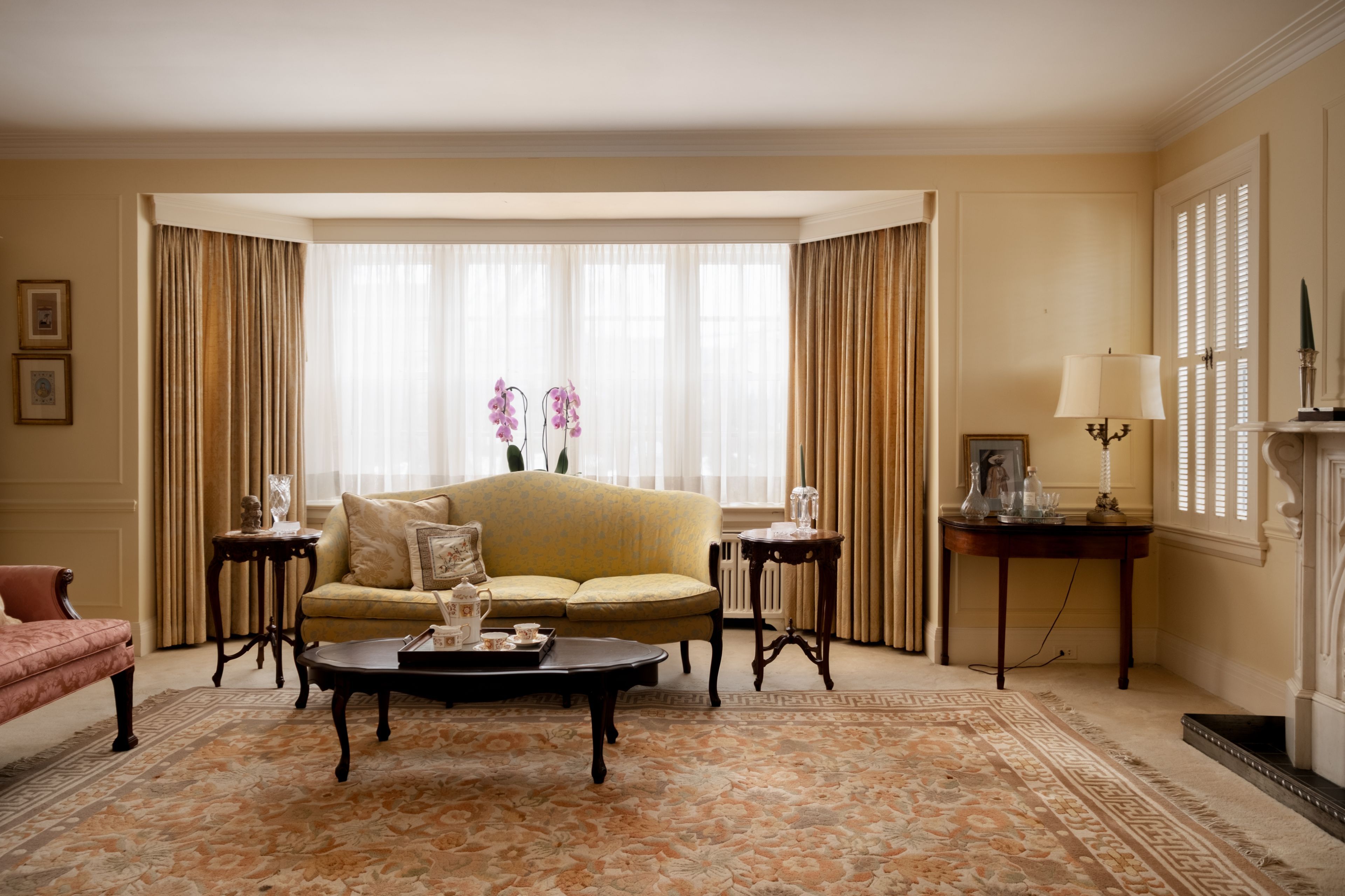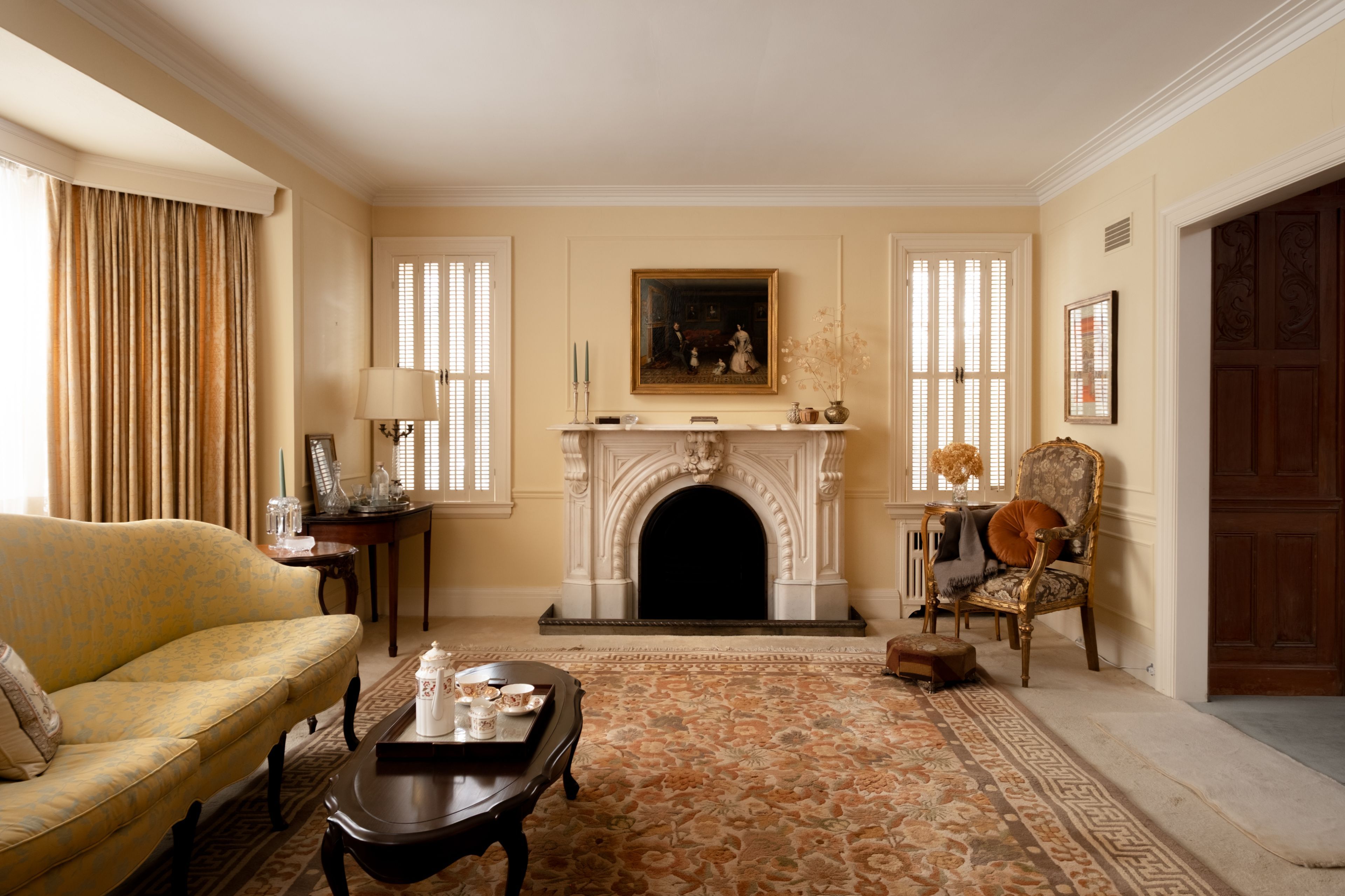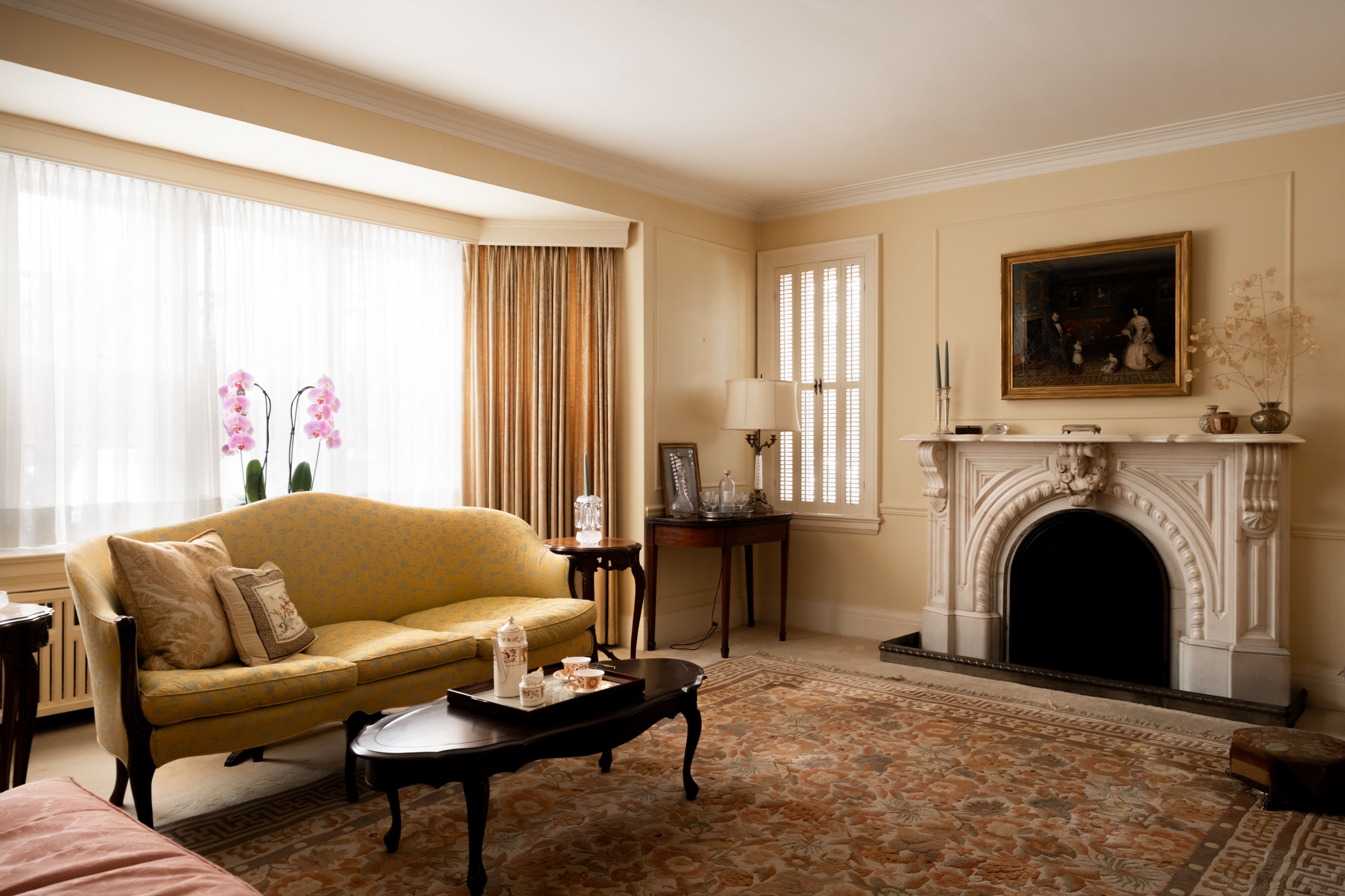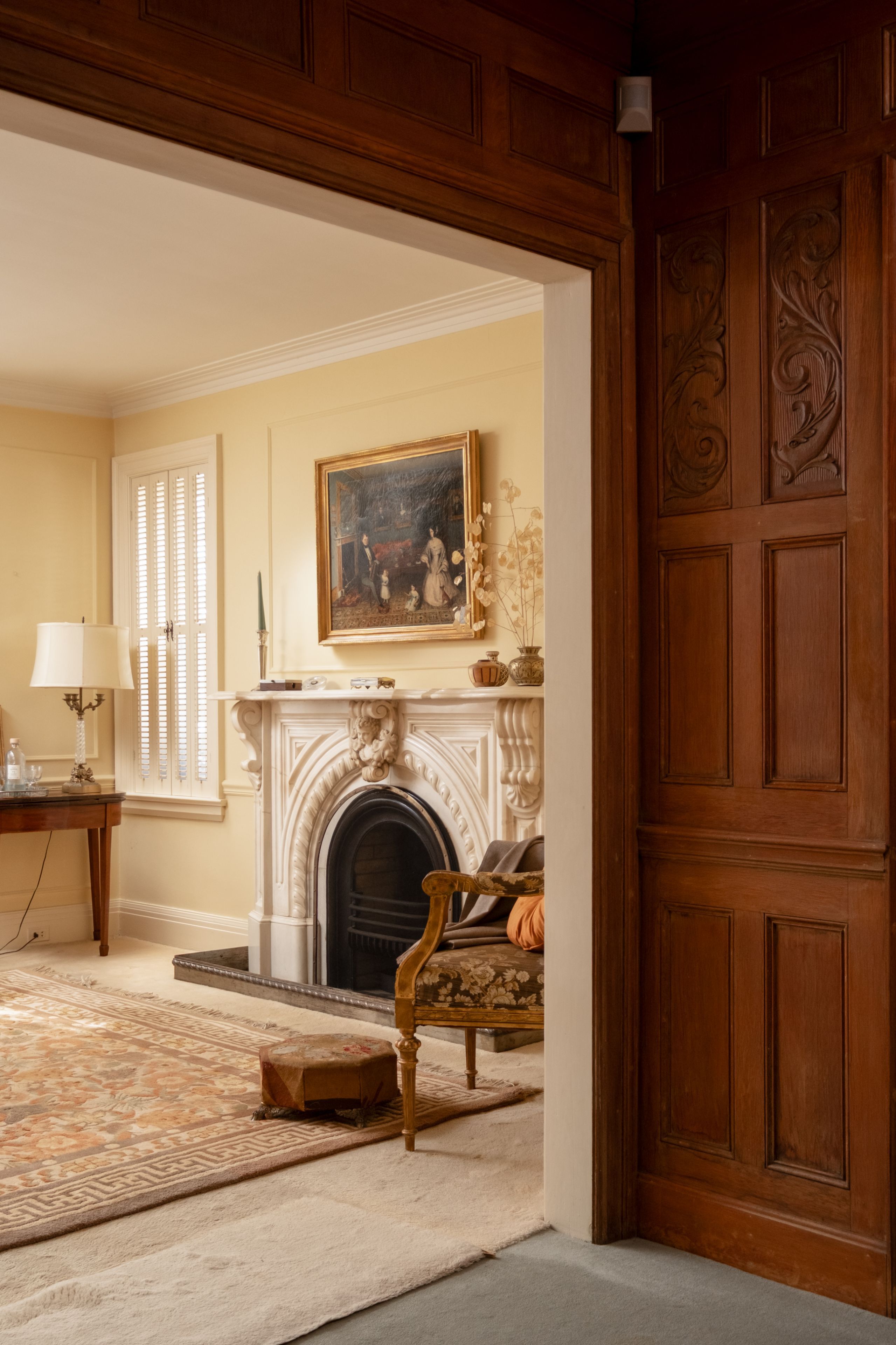 • Vintage marble fireplace in the living room adds character and warmth.