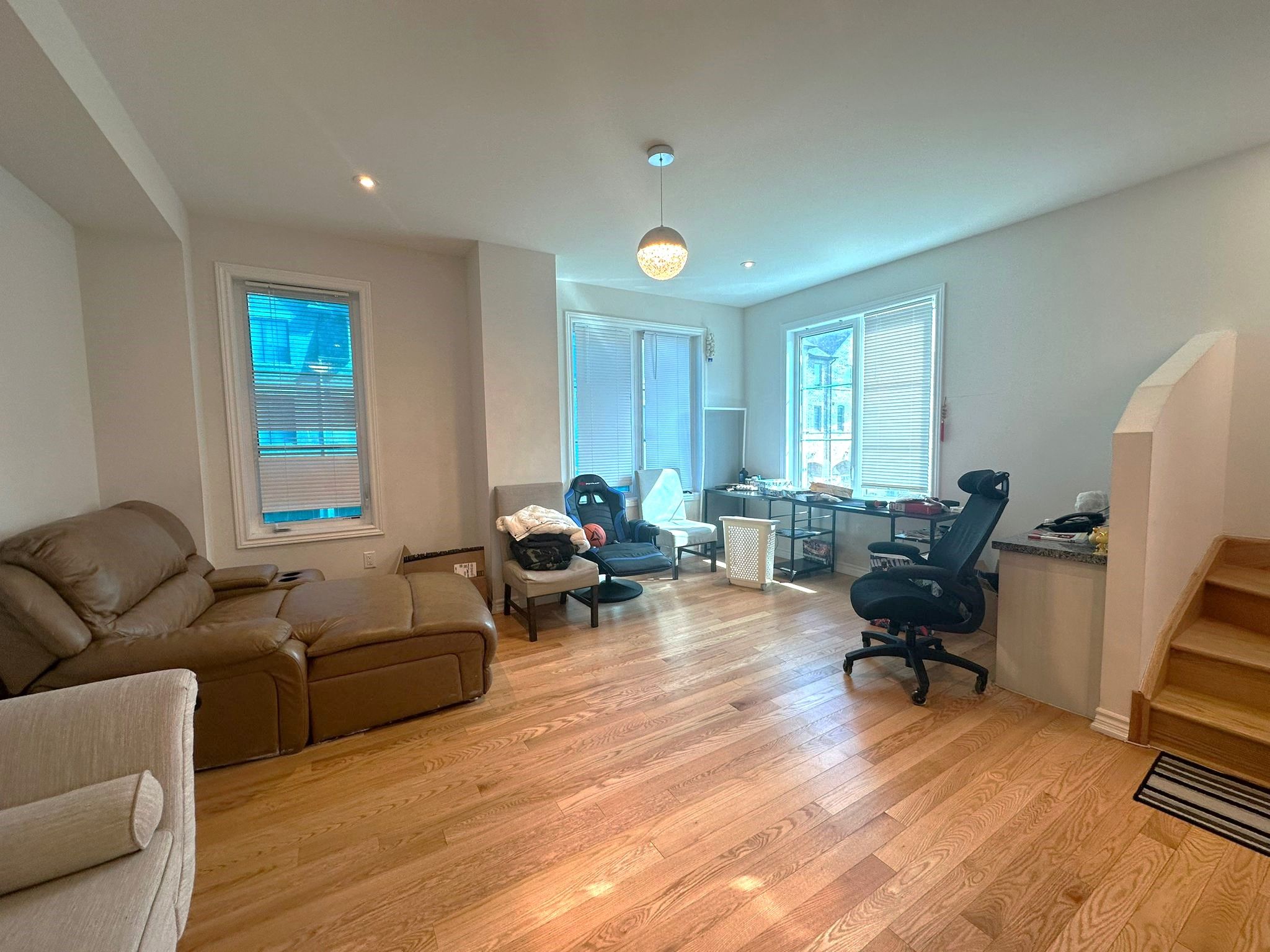 Welcome to a stunning freehold corner townhouse in the heart of the highly sought-after brampton east community. This beautifully maintained home features 3+1 bedrooms and 4 bathrooms, offering ample space for growing families or multi-generational living. The ground level includes a flexible living area with a walk-out to the backyard, ideal for a family room, home office, or guest suite. Step up to the main floor, where you'll find a bright and open layout enhanced by oak hardwood flooring and 9-foot ceilings. The upgraded kitchen is a true highlight, complete with stainless steel appliances, granite countertops, and access to a private upper deck, perfect for enjoying your morning coffee or unwinding in the evening. The primary bedroom serves as a peaceful retreat, featuring large windows, a walk-in closet, and a modern 3-piece ensuite with double sinks and a sleek stone countertop. For added convenience, the laundry room is located on the upper floor, making daily chores a breeze. Ideally located, this home is just minutes from claireville conservation area, gore meadows community centre, top-rated schools, major shopping destinations, and highways 407, 427, and 410, ensuring easy commutes and access to all amenities.
