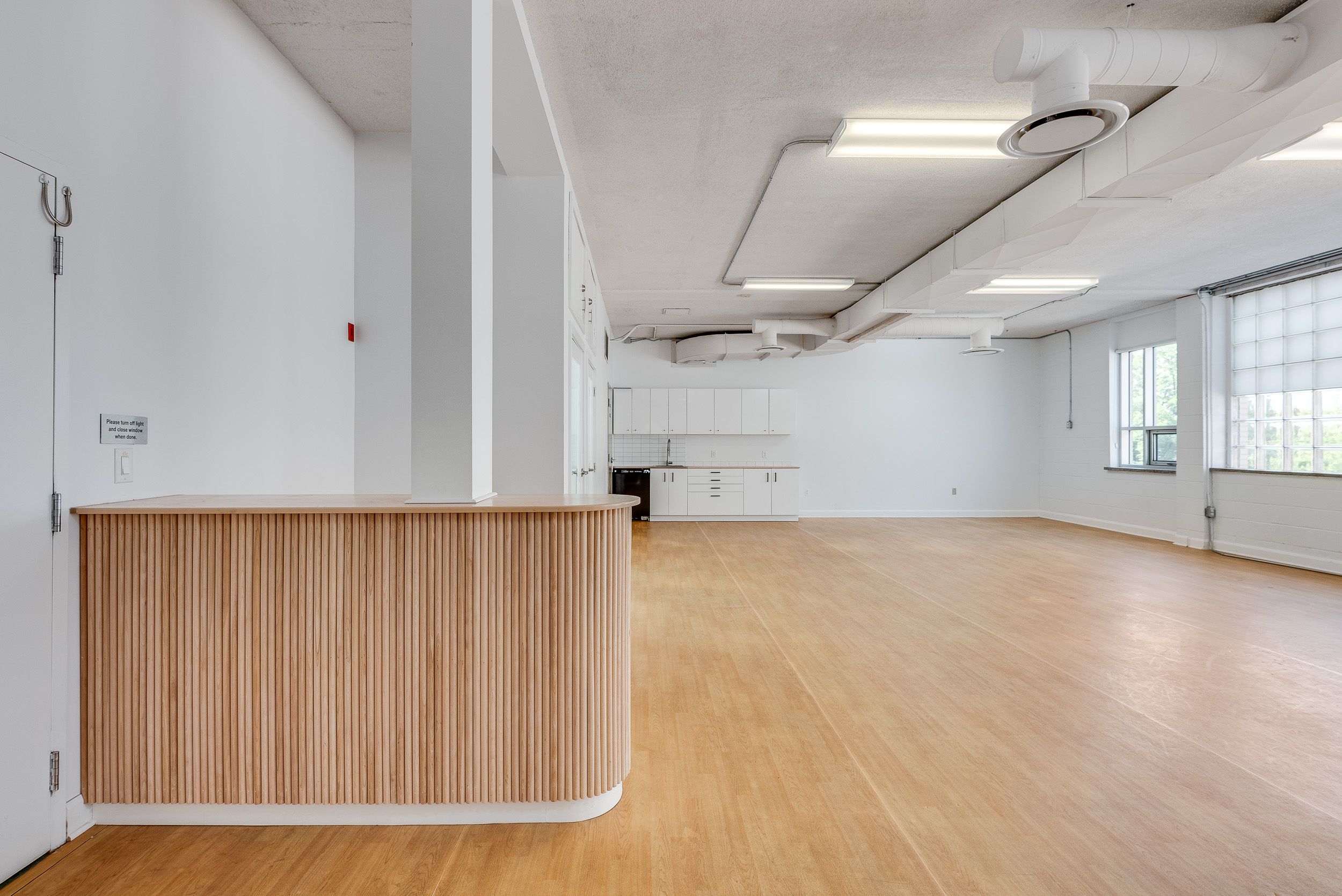 • Includes a reception area, enclosed office, and shared modern kitchen.