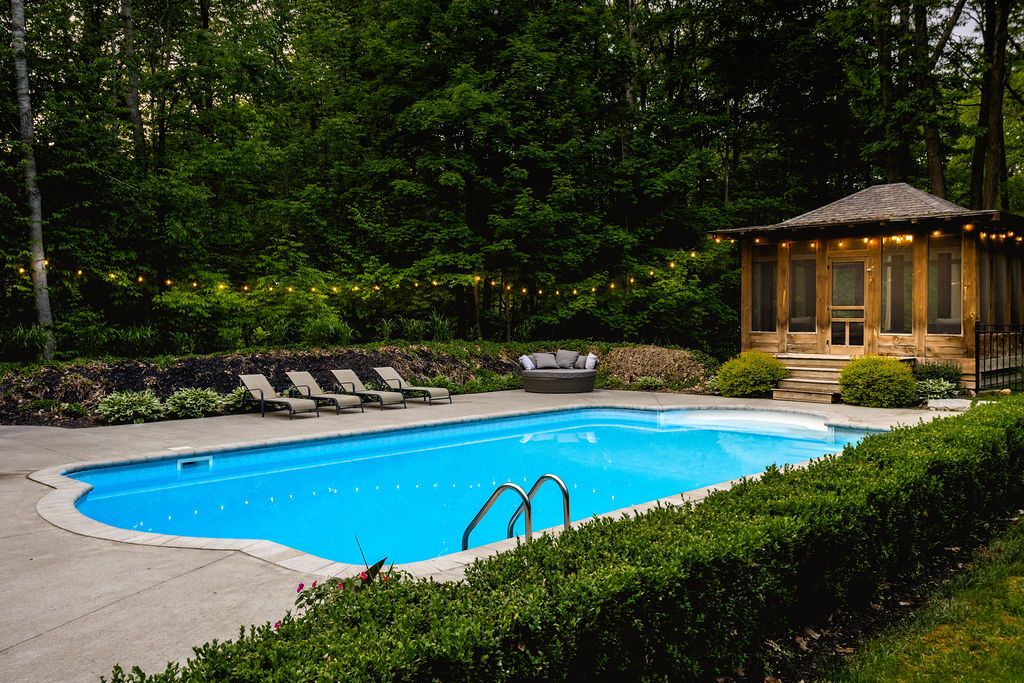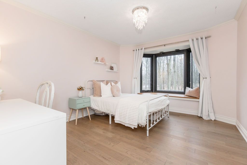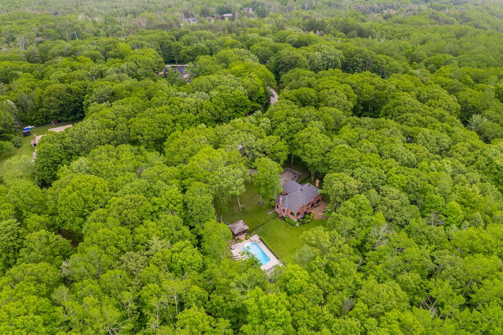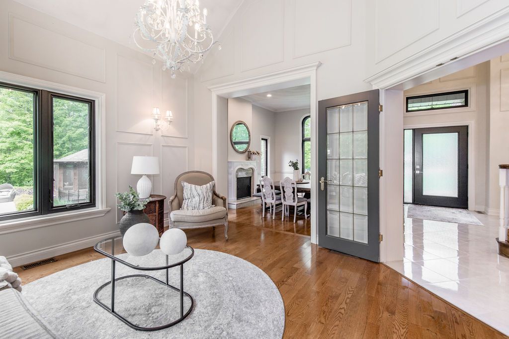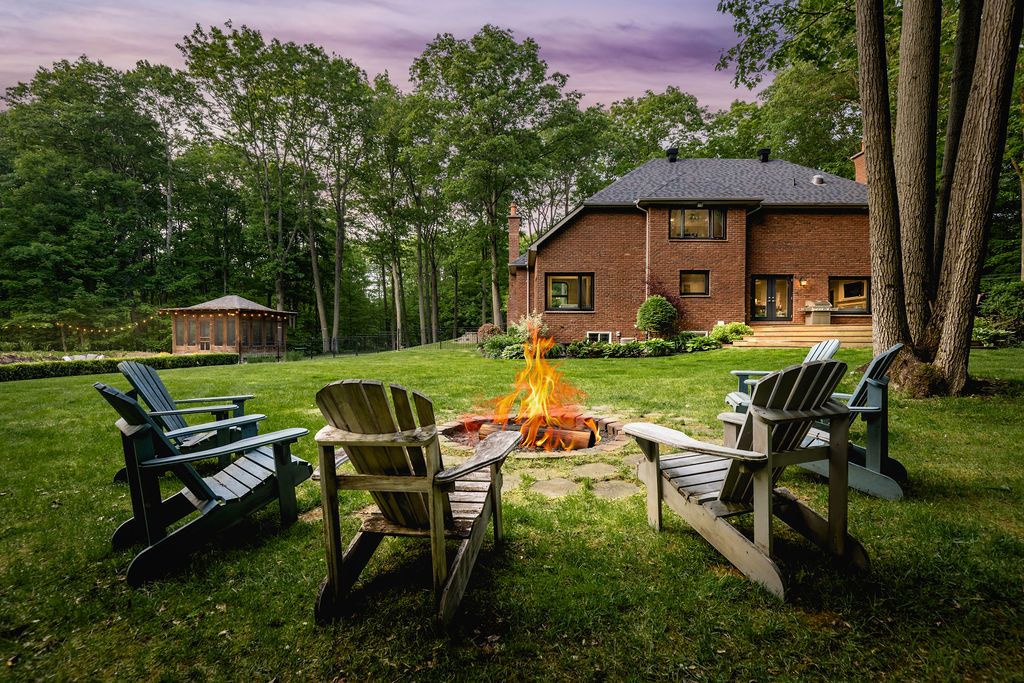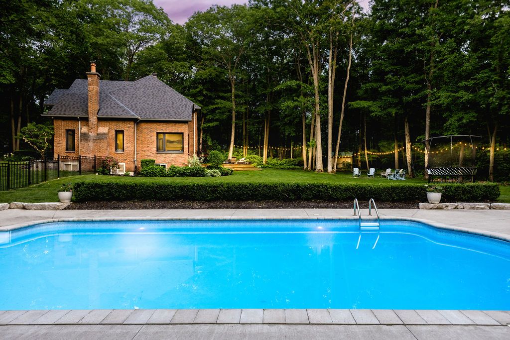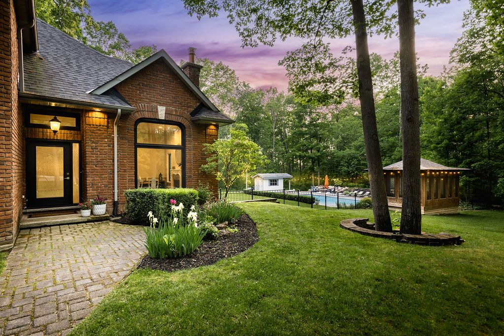 A rare offering in one of the area's most prestigious estate neighbourhoods. Tucked away in an exclusive cul-de-sac, this stunning executive home sits on a secluded 1. 52-acre lot, surrounded by mature 50 oak and maple trees. A winding driveway leads to a 2-storey home with 2,733 sq ft above grade + 1,500 sq ft finished basement. A true backyard oasis + personal retreat features a 20 x 40 saltwater pool '19, powered pool house, and an 18' beam gazebo, all surrounded by lush landscaping and wrought iron fencing. A hot tub and tool shed complete the fully fenced yard - ideal for relaxing or entertaining. Main floor elegance is evident when you enter the home showcasing vaulted ceilings, a curved staircase, and elegant wainscoting. The formal dining room has 14' ceilings, a wood-burning fireplace, and floor-to-ceiling windows. A main floor office, powder room, and open-concept kitchen with granite counters, built-ins, and a sunken family room with a wood-burning fireplace create a perfect flow. French doors lead to a large deck with scenic views. The upper level offers a refined retreat, highlighted by new hardwood flooring and a stunning hardwood staircase. The spacious primary suite offers double walk-in closets and a spa-like 5-pc ensuite with quartz, soaker tub, heated floors, and glass shower. Two more bedrooms share a newly renovated bath with quartz vanity, glass shower, and heated floors. Finished basement '24- bright and versatile with 10 ceilings, pot lights, wainscoting, gym, guest bedroom, and full bath with heated floors. Upgrades: furnace' 25, a/c '19, roof '21, windows/doors'22, irrigation, water softener. Trail access, minutes from golf, shops, schools, and commuter routes - this home offers the ultimate in privacy, elegance, and lifestyle. With timeless finishes, all major upgrades completed, and exceptional outdoor living, 18 mills circle is a rare find. Book your private showing and experience the lifestyle this exceptional estate provides.