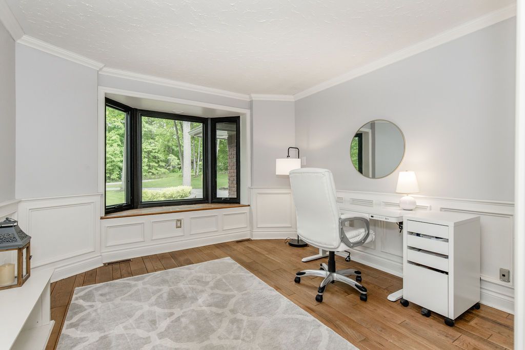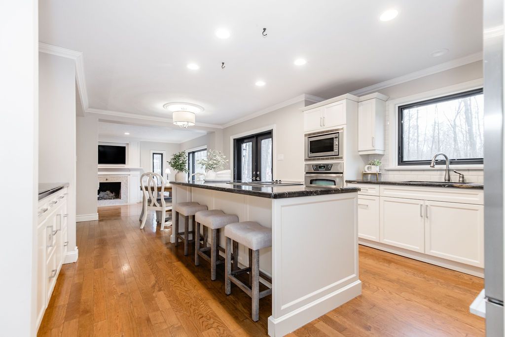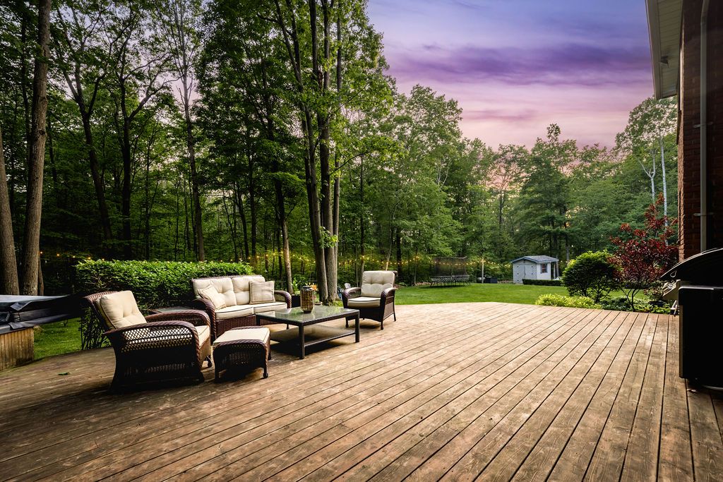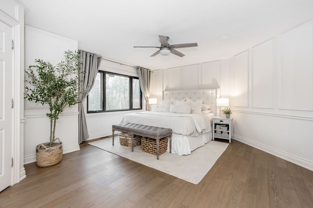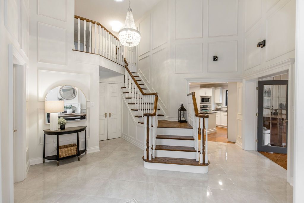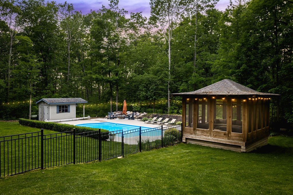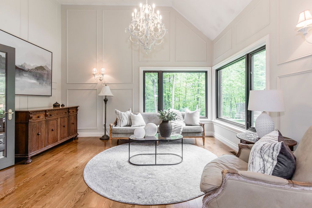 A rare offering in one of the area's most prestigious estate neighbourhoods. Tucked away in an exclusive cul-de-sac, this stunning executive home sits on a secluded 1. 52-acre lot, surrounded by mature 50 oak and maple trees. A winding driveway leads to a 2-storey home with 2,733 sq ft above grade + 1,500 sq ft finished basement. A true backyard oasis + personal retreat features a 20 x 40 saltwater pool '19, powered pool house, and an 18' beam gazebo, all surrounded by lush landscaping and wrought iron fencing. A hot tub and tool shed complete the fully fenced yard - ideal for relaxing or entertaining. Main floor elegance is evident when you enter the home showcasing vaulted ceilings, a curved staircase, and elegant wainscoting. The formal dining room has 14' ceilings, a wood-burning fireplace, and floor-to-ceiling windows. A main floor office, powder room, and open-concept kitchen with granite counters, built-ins, and a sunken family room with a wood-burning fireplace create a perfect flow. French doors lead to a large deck with scenic views. The upper level offers a refined retreat, highlighted by new hardwood flooring and a stunning hardwood staircase. The spacious primary suite offers double walk-in closets and a spa-like 5-pc ensuite with quartz, soaker tub, heated floors, and glass shower. Two more bedrooms share a newly renovated bath with quartz vanity, glass shower, and heated floors. Finished basement '24- bright and versatile with 10 ceilings, pot lights, wainscoting, gym, guest bedroom, and full bath with heated floors. Upgrades: furnace' 25, a/c '19, roof '21, windows/doors'22, irrigation, water softener. Trail access, minutes from golf, shops, schools, and commuter routes - this home offers the ultimate in privacy, elegance, and lifestyle. With timeless finishes, all major upgrades completed, and exceptional outdoor living, 18 mills circle is a rare find. Book your private showing and experience the lifestyle this exceptional estate provides.