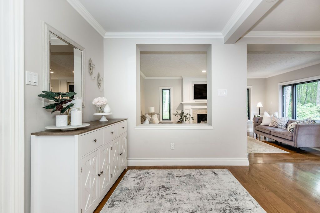 • Elegant main floor with vaulted ceilings and a cozy fireplace.