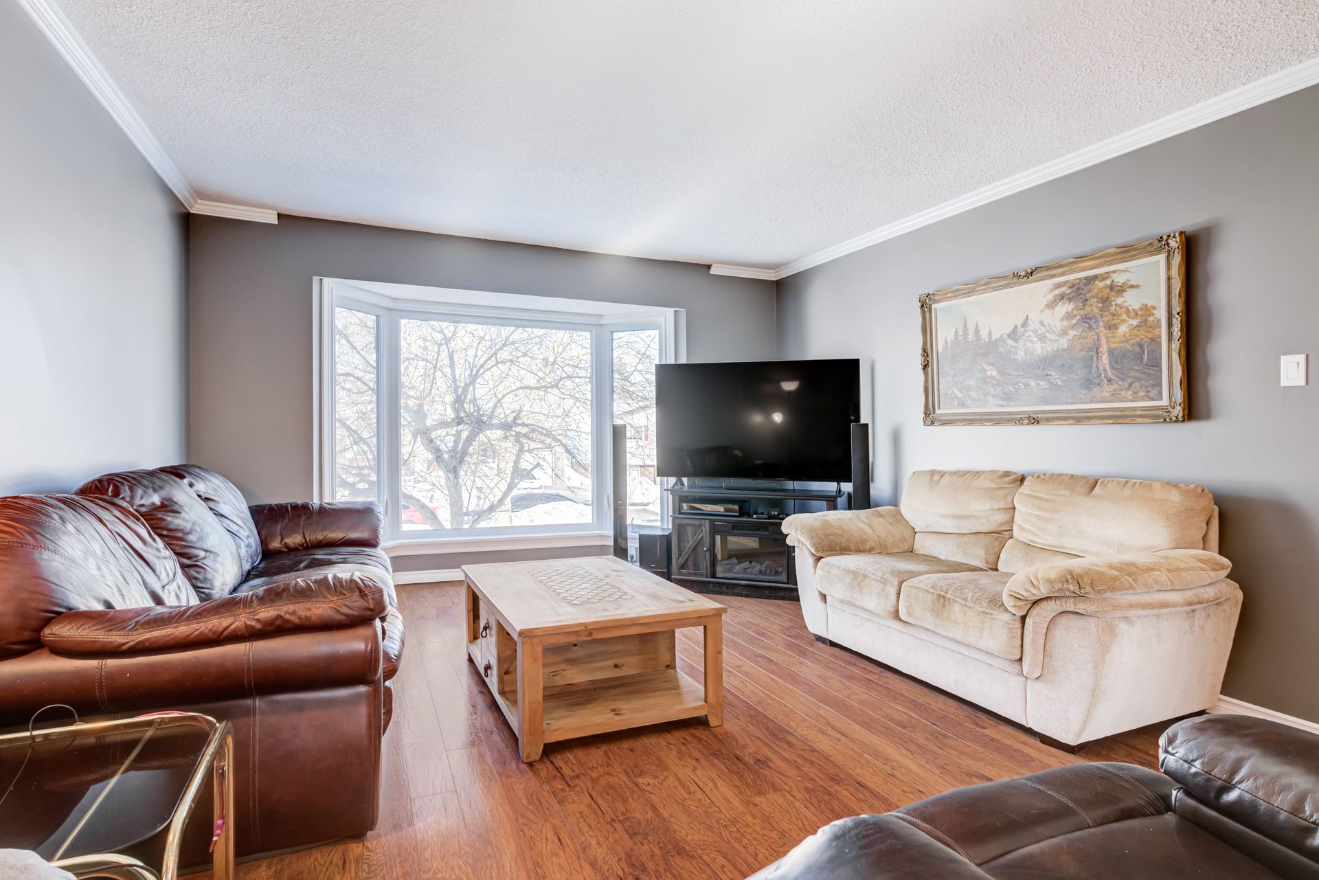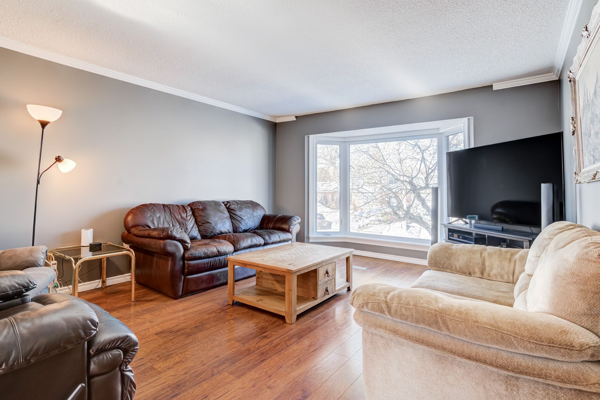 • Bright living room with a large bay window for natural light.