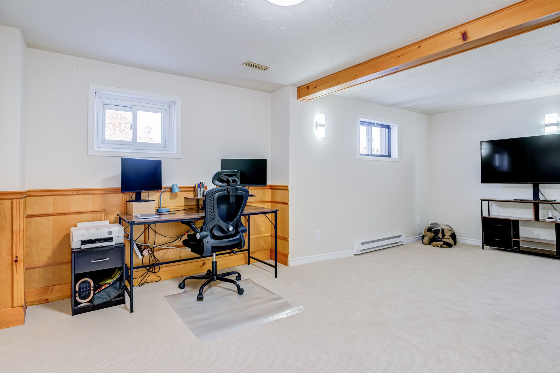 • Finished lower level with a cozy gas fireplace and office space.