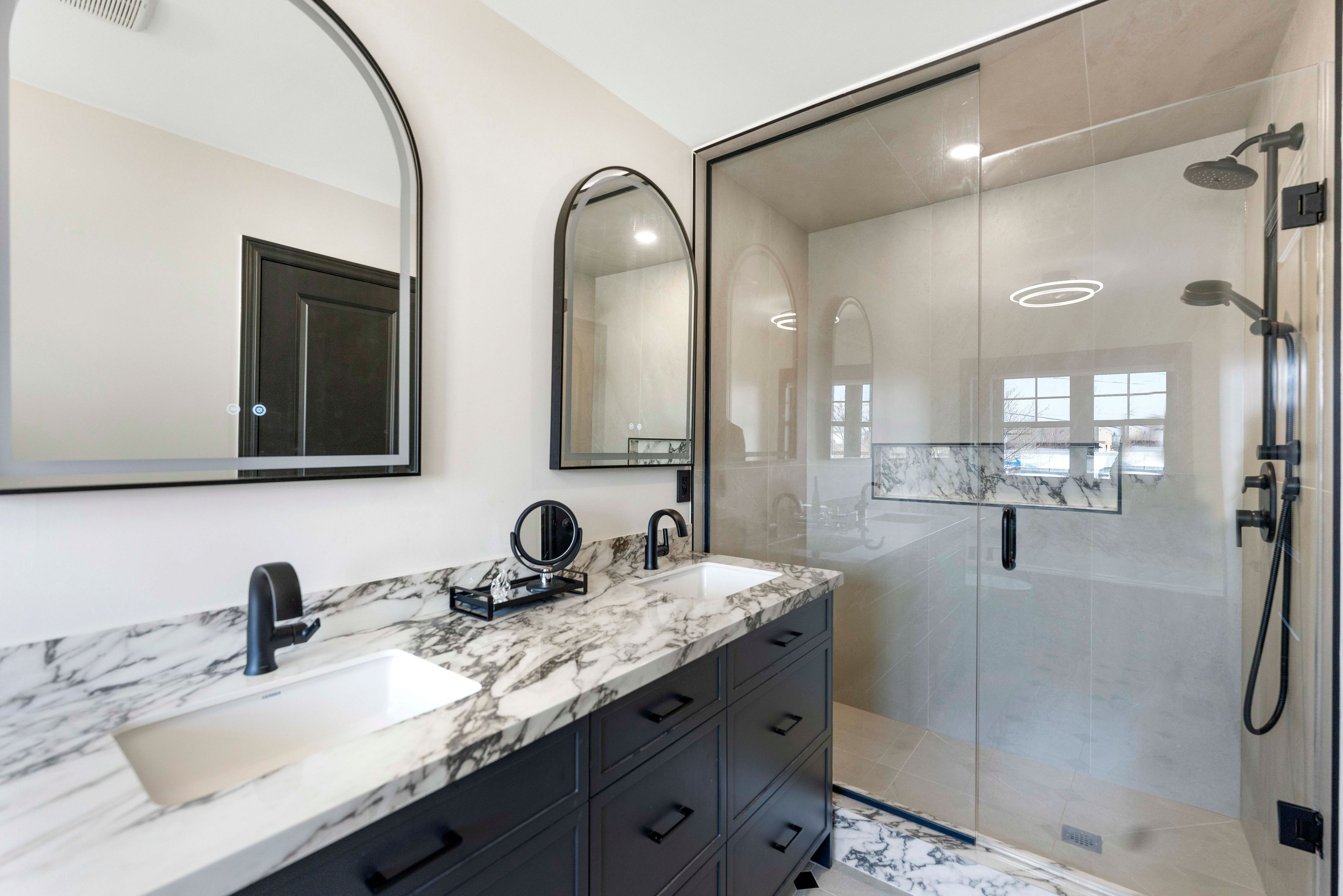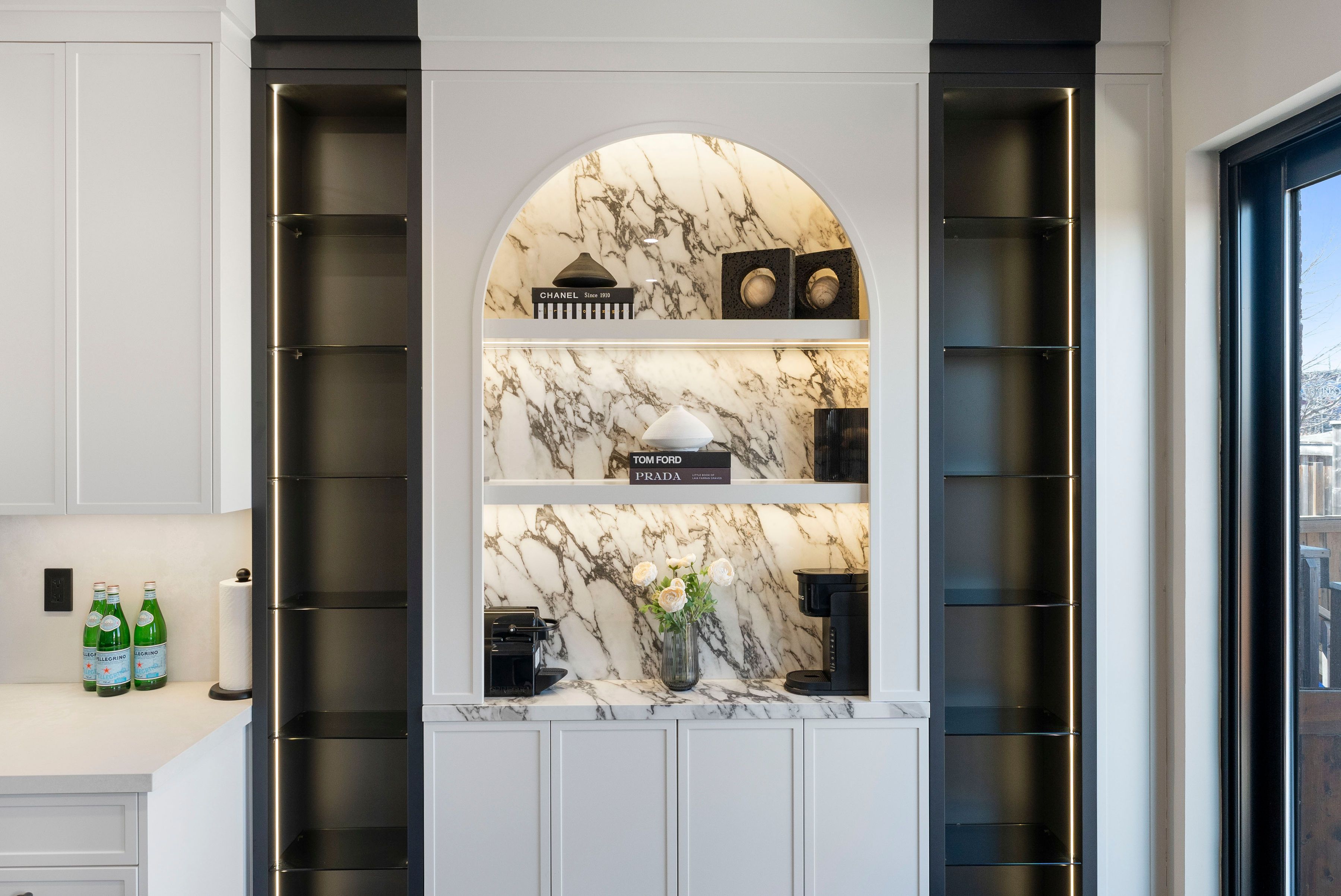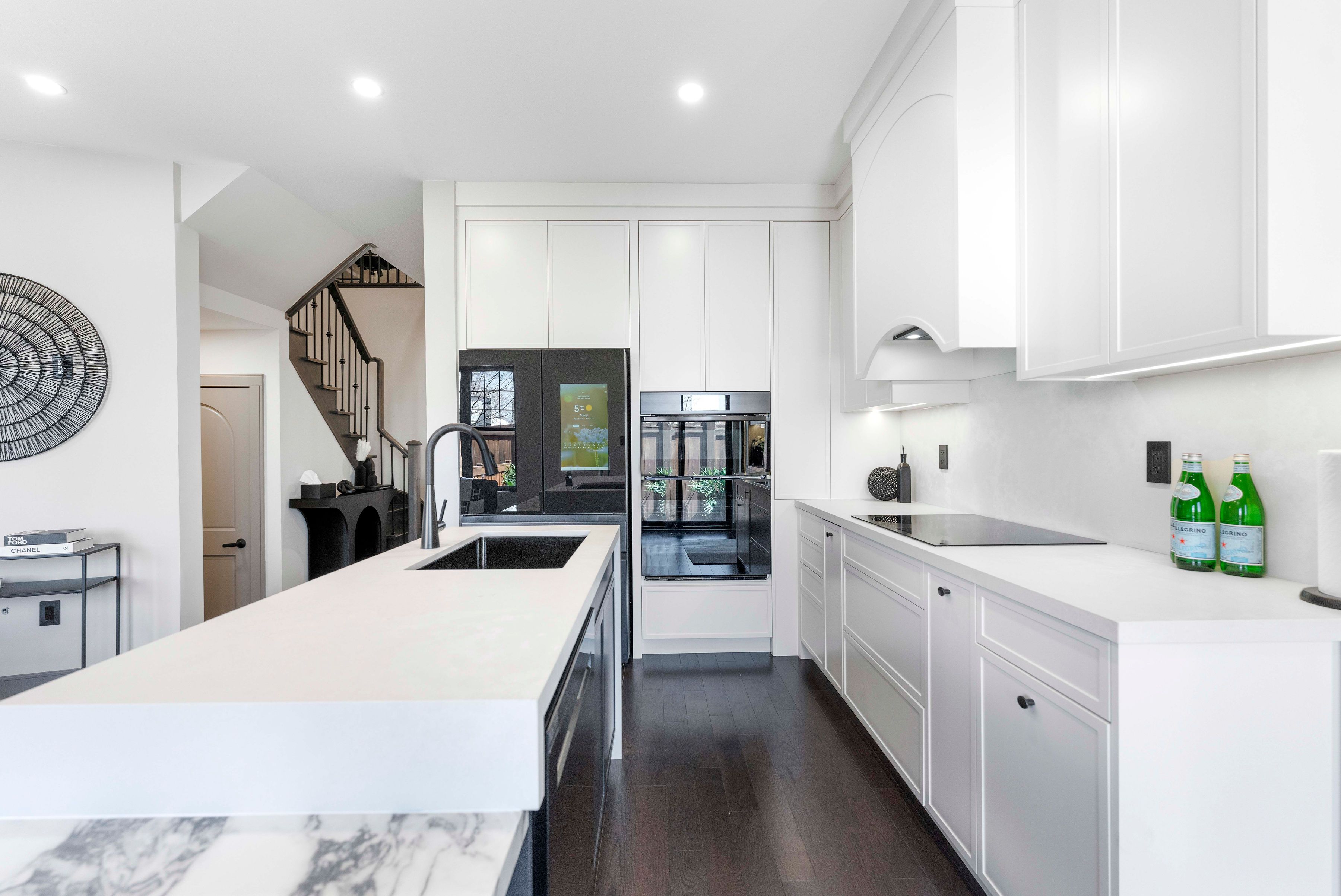 • Custom chef's kitchen with high-end countertops and black stainless appliances.
