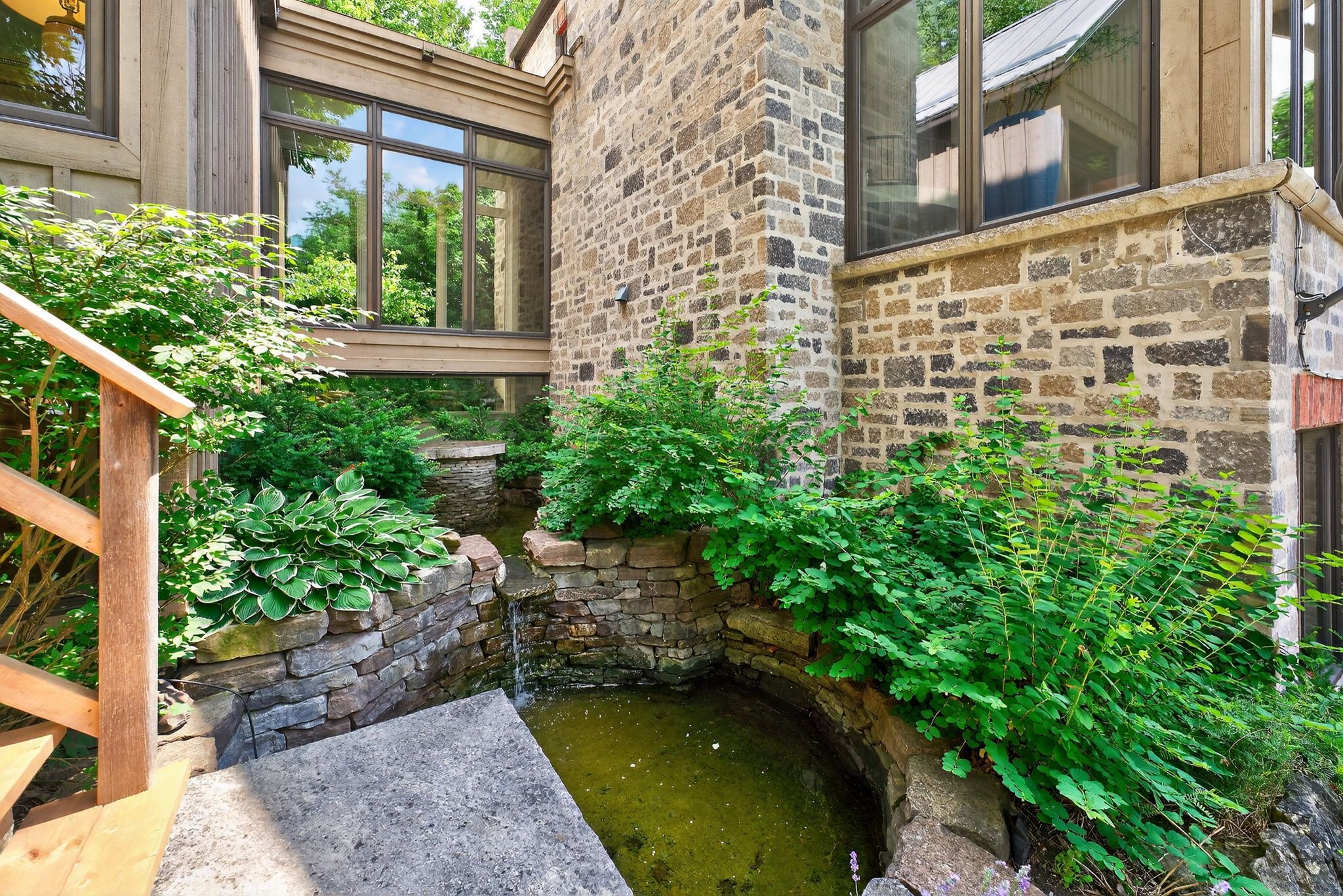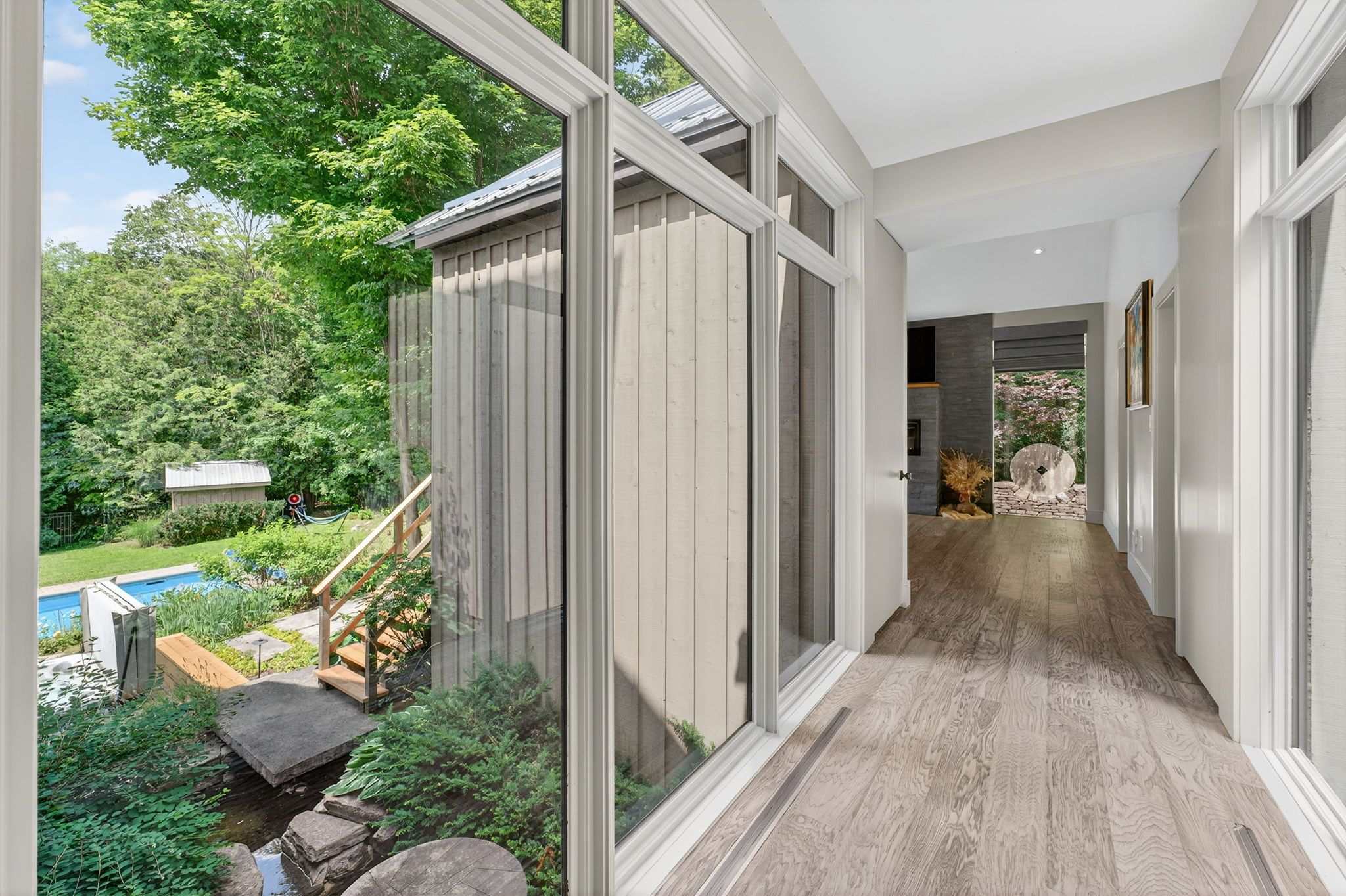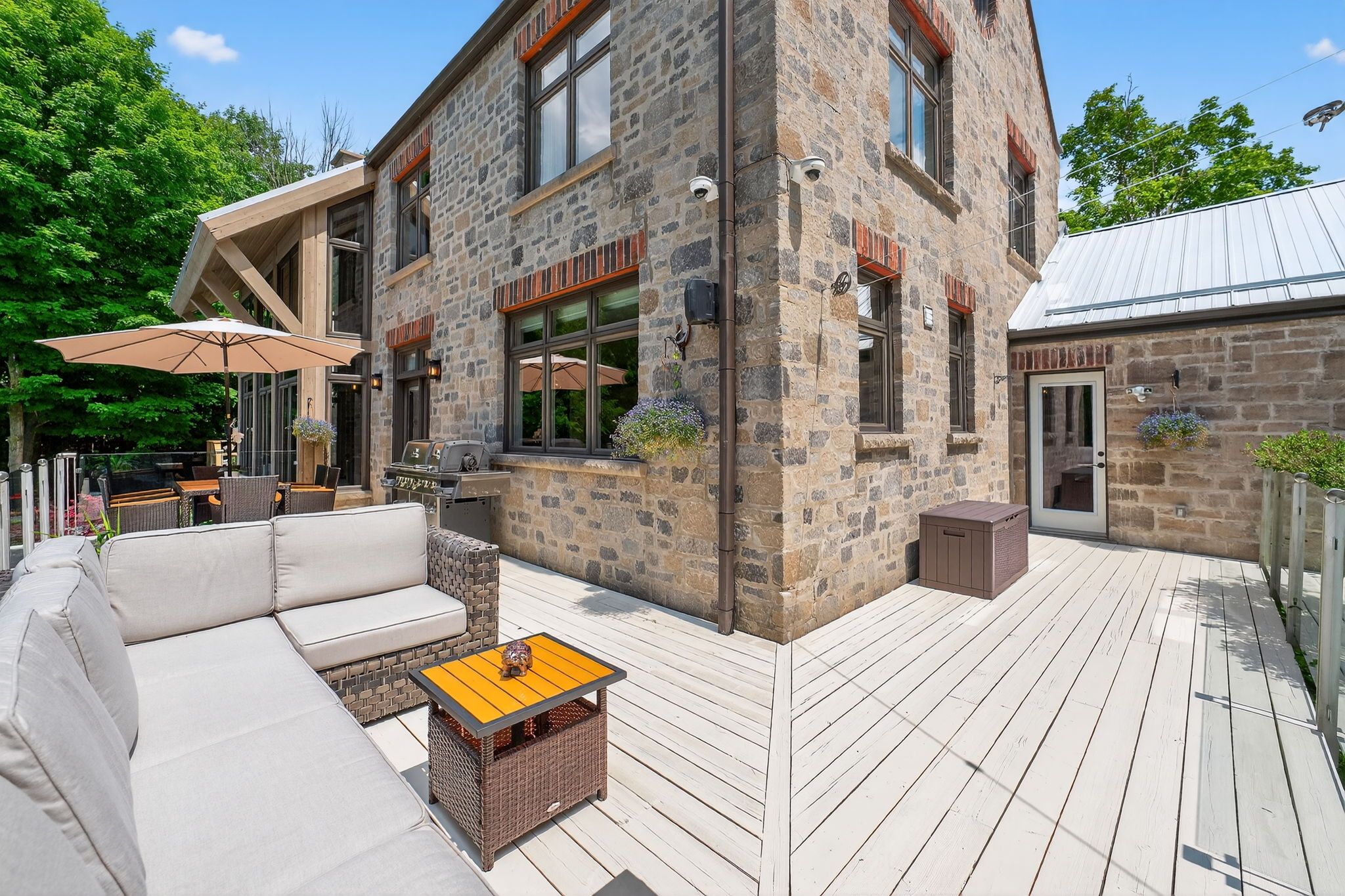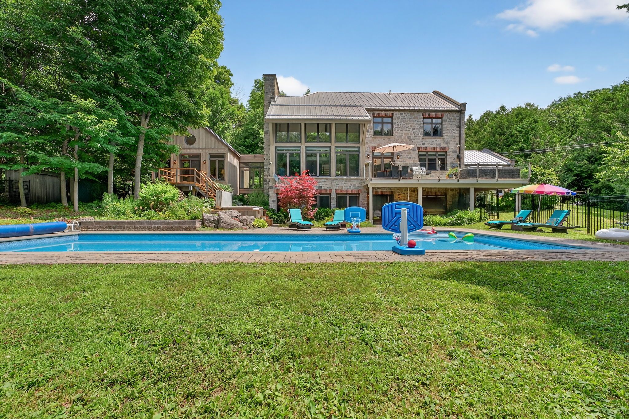 Tucked on a quiet crescent, this extraordinary 2. 79-acre estate offers an exquisite blend of refined living and natural serenity. Inspired by an old mill design, the stone-and-mortar exterior exudes timeless character and craftsmanship. Surrounded by mature trees, the grounds feel like a private resort complete with a heated saltwater pool, hot tub, tranquil decorative pond, and a forested fire pit area. Meandering trails lead directly to the grand river, making this a rare lifestyle opportunity. With over 4,500 sq ft of finished space, the interior is equally exceptional. Vaulted ceilings, hardwood flooring, and expansive windows create a bright, airy feel throughout. The chefs kitchen is a standout, featuring premium appliances, a centre island with breakfast bar, and a charming built-in window bench. The dining room, enhanced by a custom buffet, opens to an entertainment-sized deck for effortless indoor-outdoor flow. In the great room, floor-to-ceiling windows and a stone fireplace make a bold yet inviting statement. A private interior bridge leads to the main-level primary suite - a private sanctuary with spa-like five-piece ensuite, fireplace, walk-in closet, and its own secluded deck overlooking the backyard. The upper level offers three additional bedrooms, a five-piece bathroom, and a loft with views of the great room below. The finished walkout lower level is designed for entertaining, complete with a custom wet bar, two wine fridges, keg fridge, propane fireplace, in-floor heating, and oversized windows. A gym (optional 5th bedroom), private office, stylish bathroom, and cold storage add to the homes versatility. Every element of this property has been curated with intention, offering a lifestyle of quiet luxury, comfort, and connection to nature.