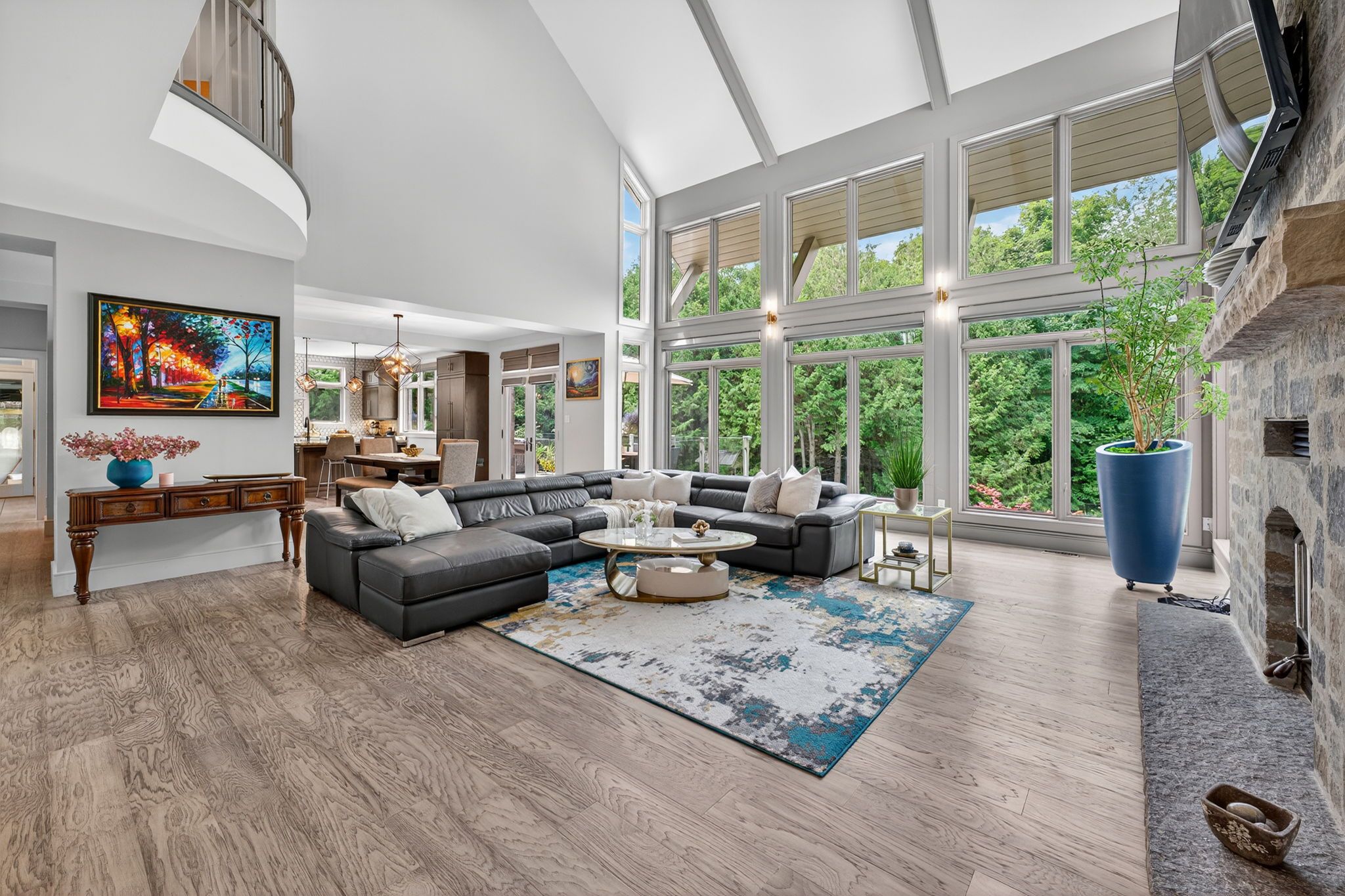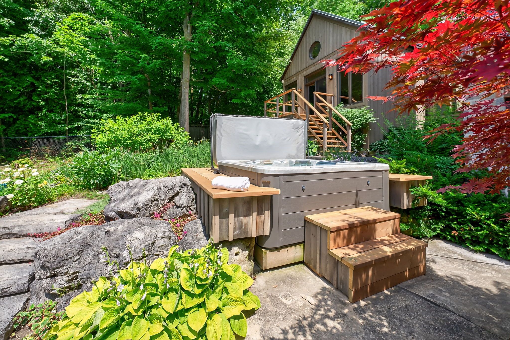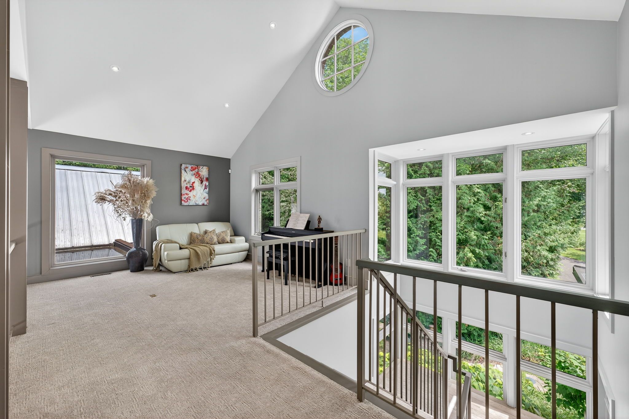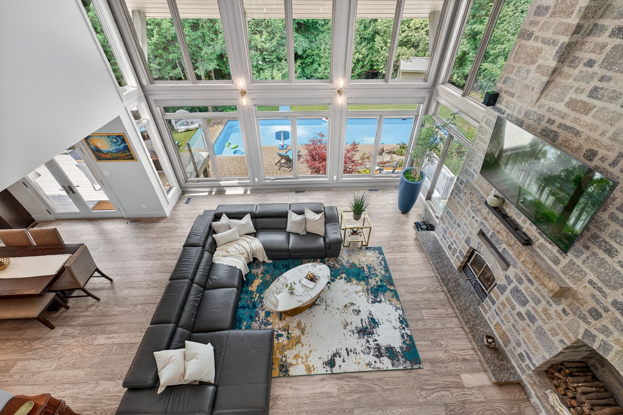 Tucked on a quiet crescent, this extraordinary 2. 79-acre estate offers an exquisite blend of refined living and natural serenity. Inspired by an old mill design, the stone-and-mortar exterior exudes timeless character and craftsmanship. Surrounded by mature trees, the grounds feel like a private resort complete with a heated saltwater pool, hot tub, tranquil decorative pond, and a forested fire pit area. Meandering trails lead directly to the grand river, making this a rare lifestyle opportunity. With over 4,500 sq ft of finished space, the interior is equally exceptional. Vaulted ceilings, hardwood flooring, and expansive windows create a bright, airy feel throughout. The chefs kitchen is a standout, featuring premium appliances, a centre island with breakfast bar, and a charming built-in window bench. The dining room, enhanced by a custom buffet, opens to an entertainment-sized deck for effortless indoor-outdoor flow. In the great room, floor-to-ceiling windows and a stone fireplace make a bold yet inviting statement. A private interior bridge leads to the main-level primary suite - a private sanctuary with spa-like five-piece ensuite, fireplace, walk-in closet, and its own secluded deck overlooking the backyard. The upper level offers three additional bedrooms, a five-piece bathroom, and a loft with views of the great room below. The finished walkout lower level is designed for entertaining, complete with a custom wet bar, two wine fridges, keg fridge, propane fireplace, in-floor heating, and oversized windows. A gym (optional 5th bedroom), private office, stylish bathroom, and cold storage add to the homes versatility. Every element of this property has been curated with intention, offering a lifestyle of quiet luxury, comfort, and connection to nature.
