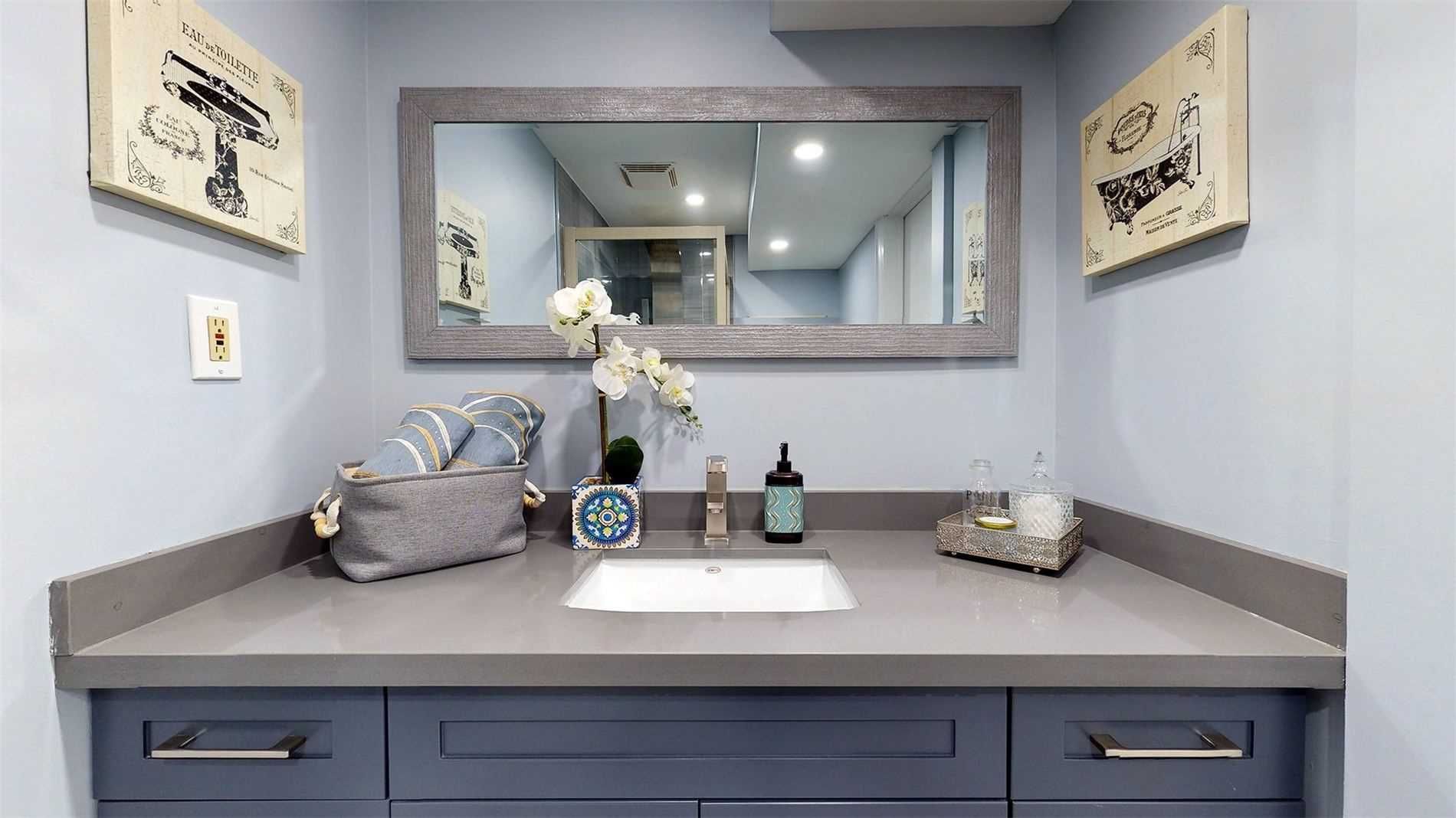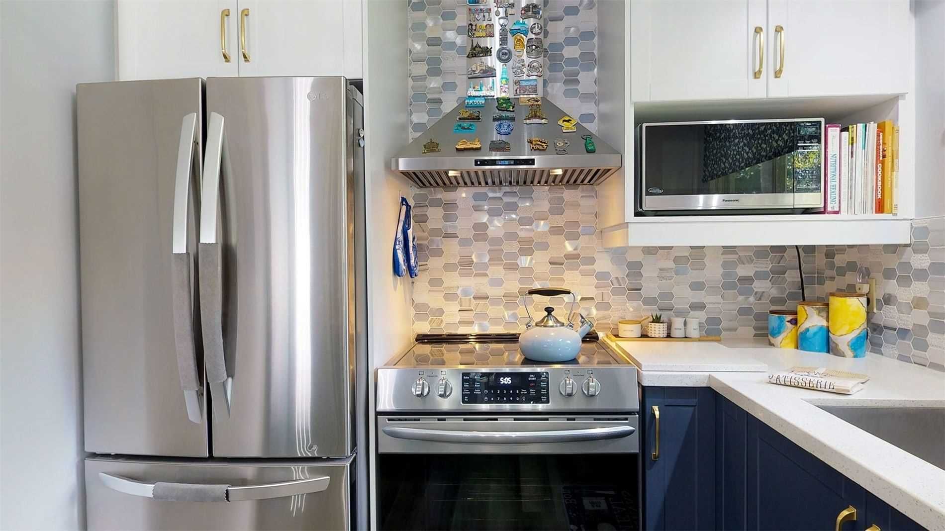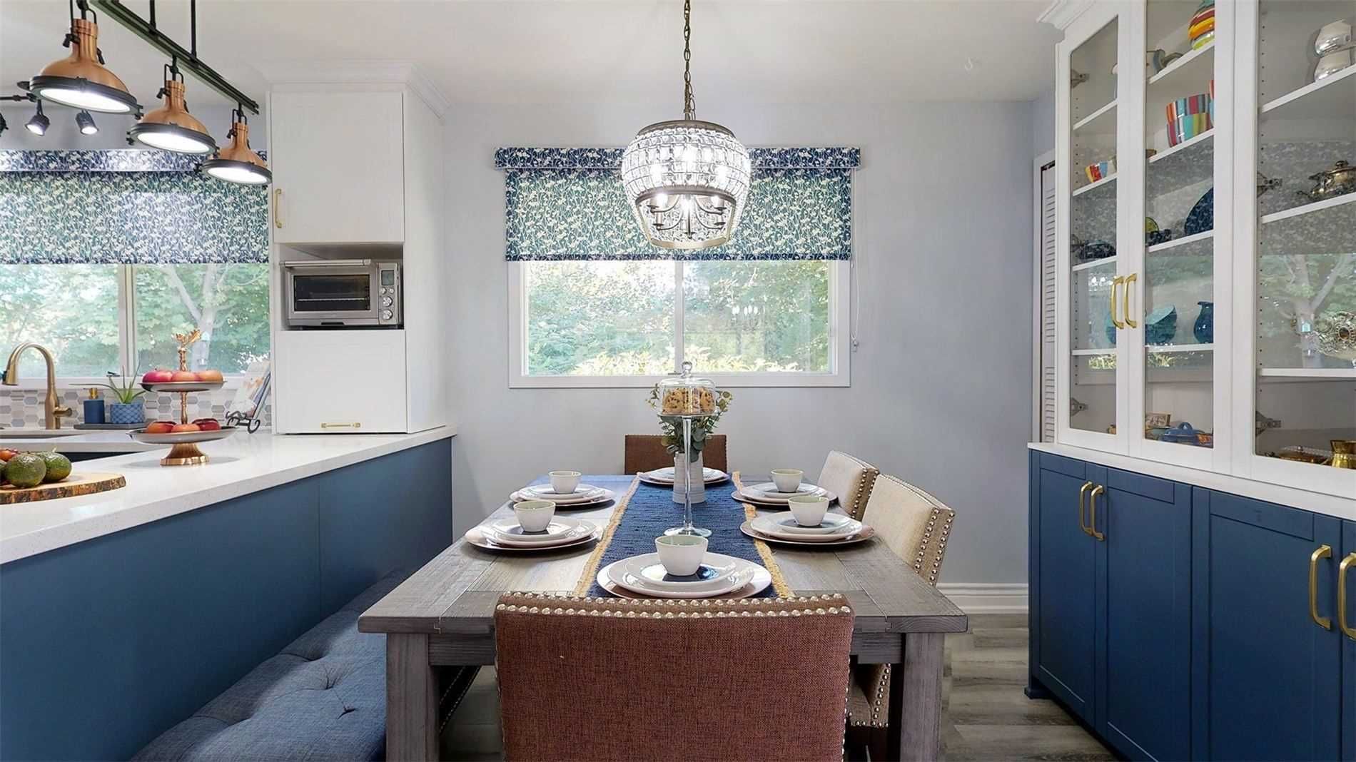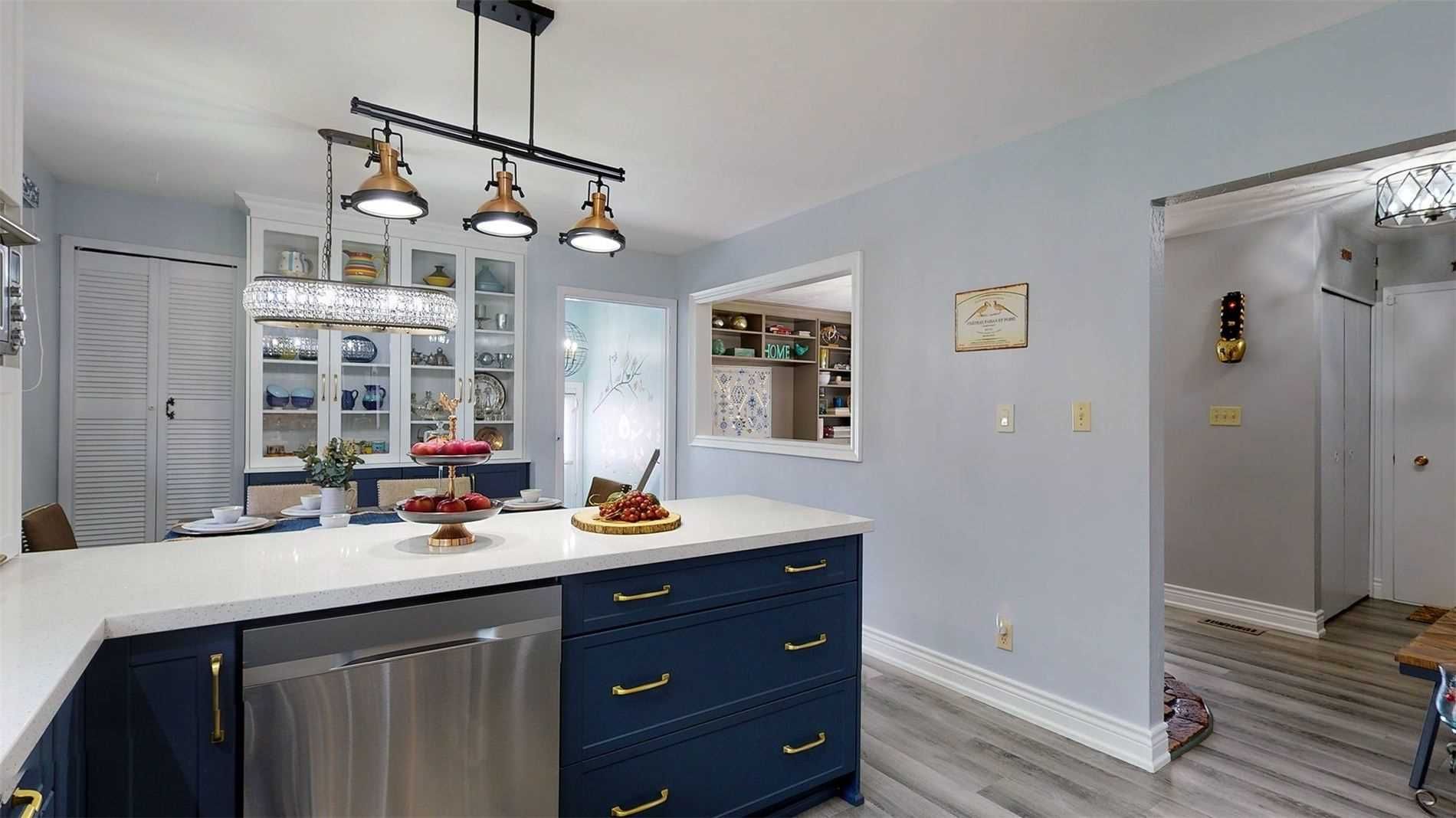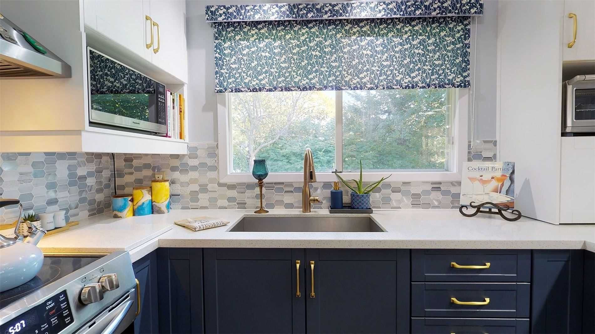 • Modern kitchen with stylish midnight-blue cabinets and quartz countertops.