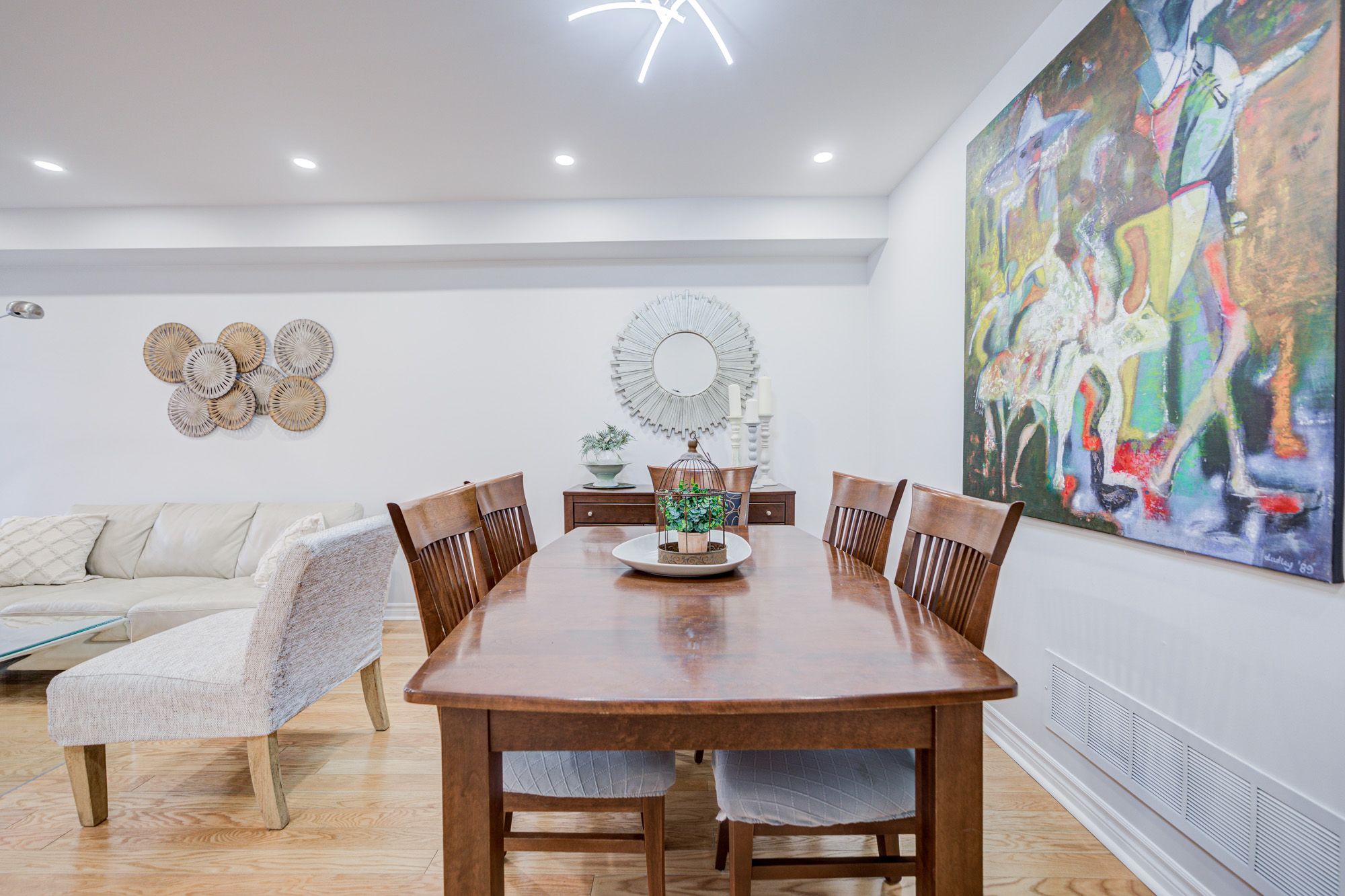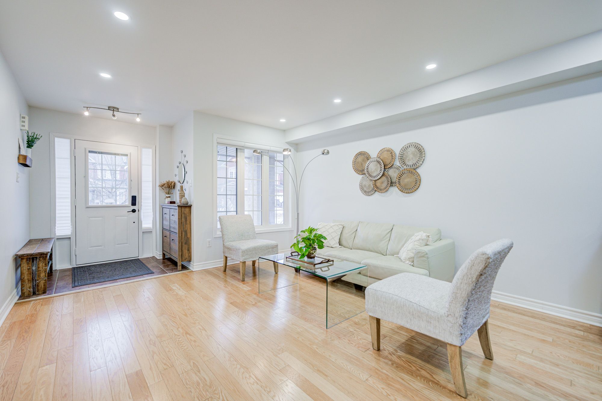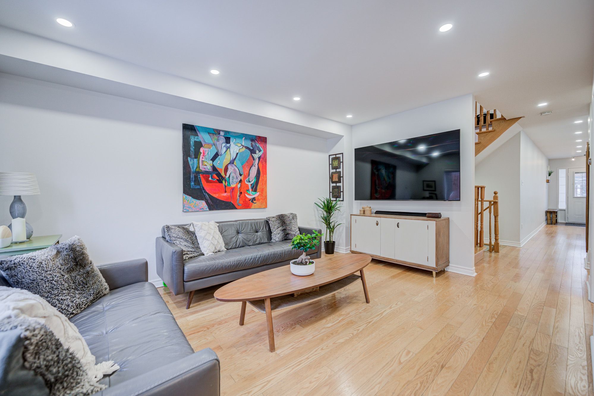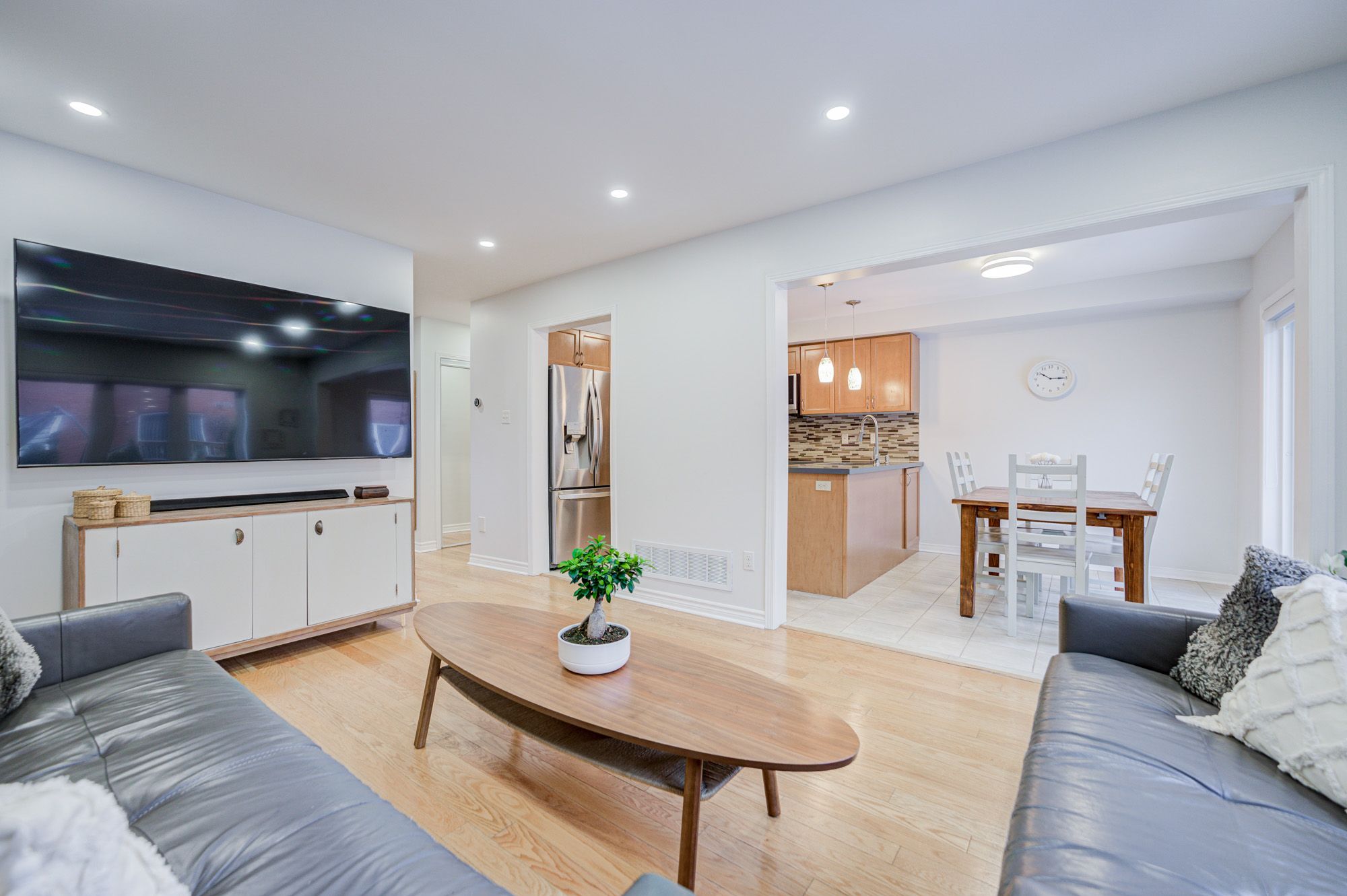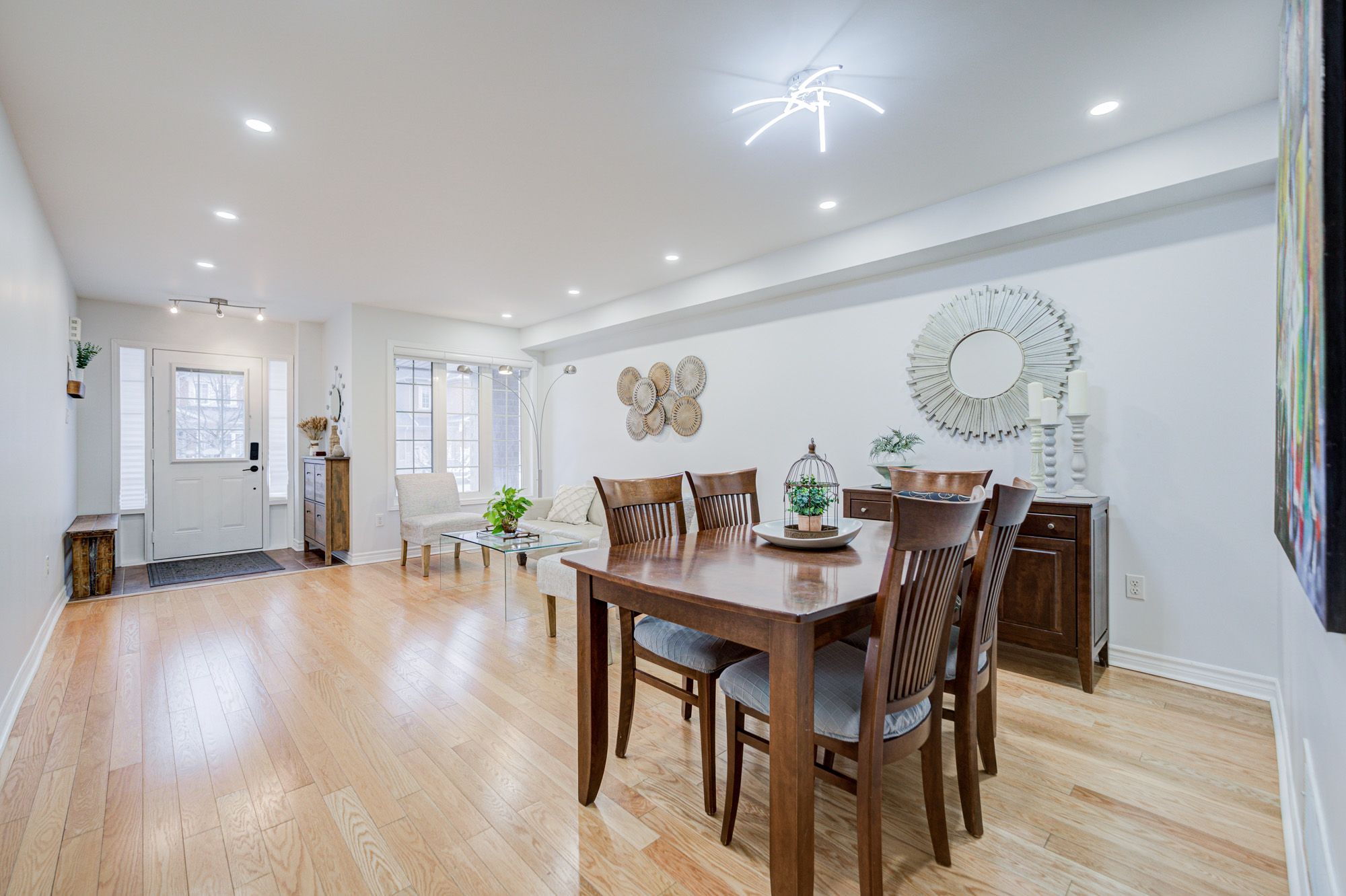 • Bright open-concept living area featuring hardwood flooring and pot lights.
