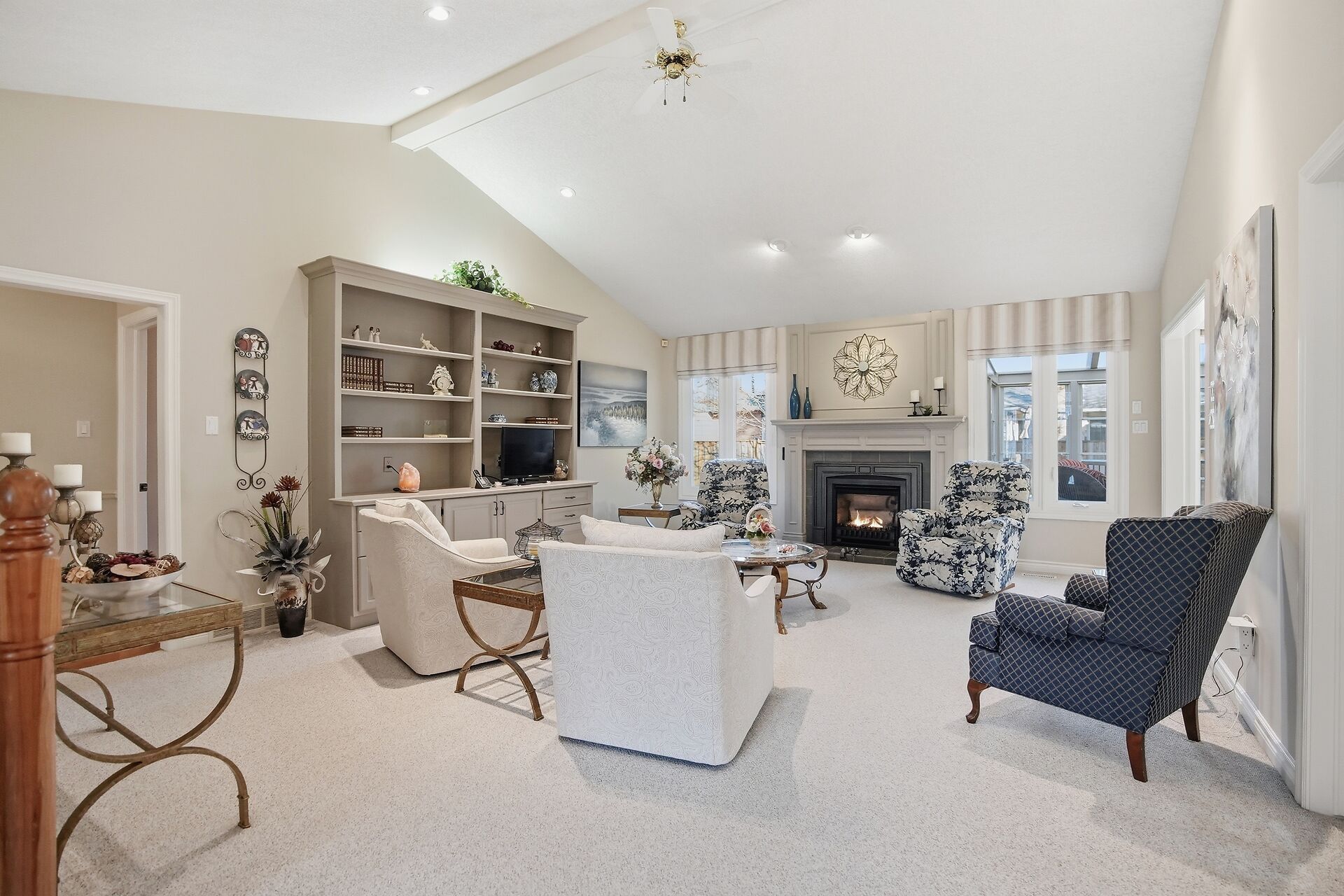 • Main living area features 12-ft vaulted ceilings and a gas fireplace.
