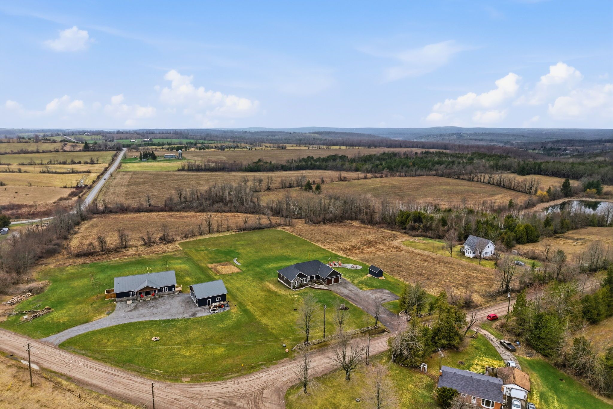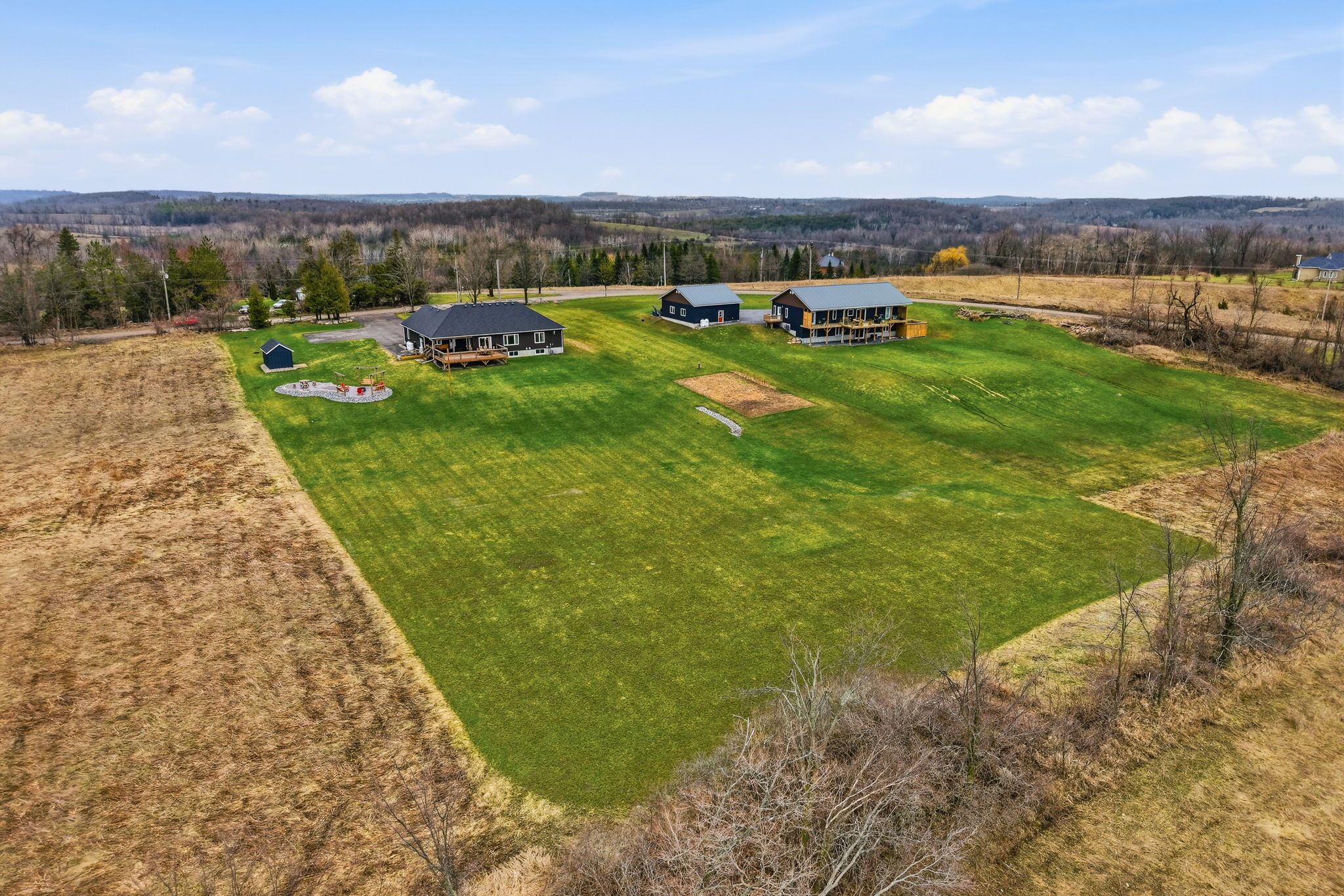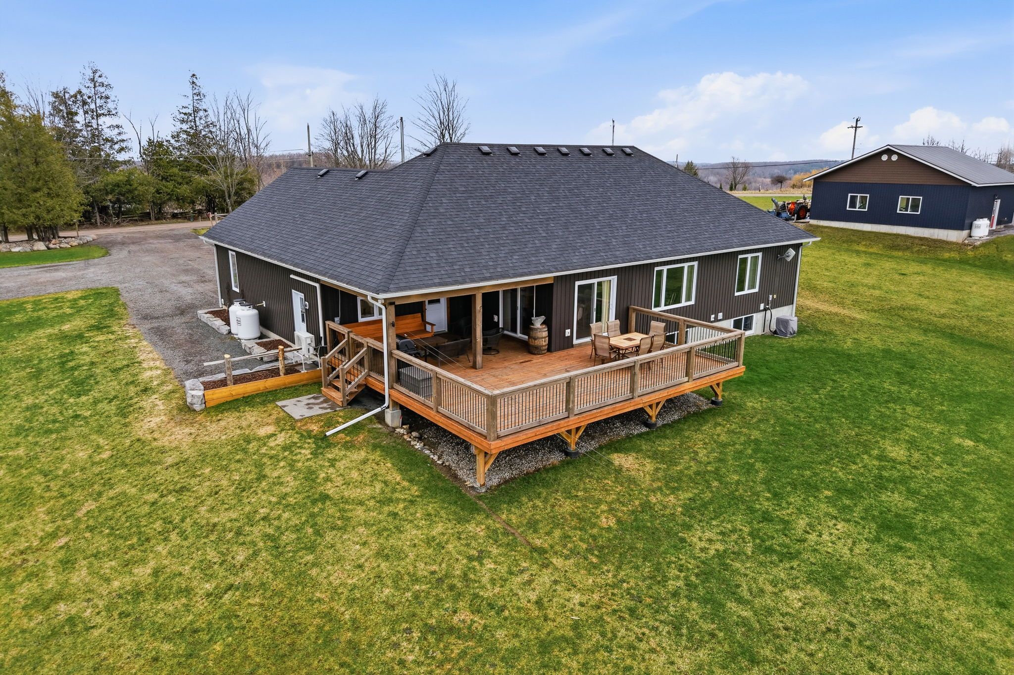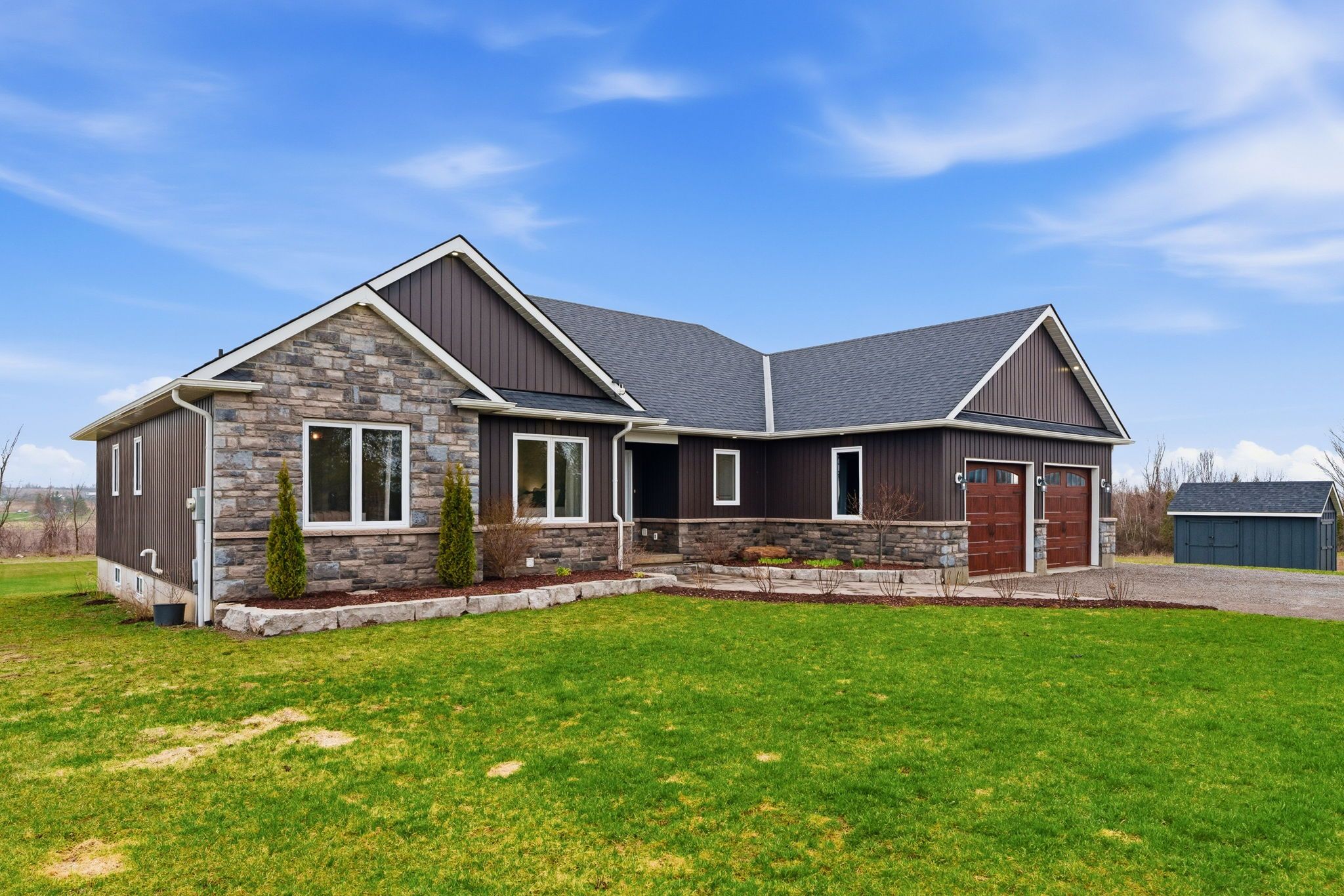 Well maintained 2020 built bungalow on 2 acres, offering a country setting with the comfort of nearby neighbours. Thoughtfully designed for main floor living with 3 bedrooms, including a primary with 4 piece ensuite, plus a second full 4 piece bath. Main floor laundry and direct access from the attached 2 car garage add everyday convenience. Open concept kitchen, dining and living space with warm, rustic character and an easy, functional flow. The attached 2 car garage includes a separate bonus room, ideal for a home business, workshop, or hobby space. Enjoy the outdoors with a large back deck, expansive yard, and a dedicated fire pit area with built in swings. Additional shed provides practical storage for tools and equipment. A solid, move in ready home on a generous lot, offering space both inside and out.