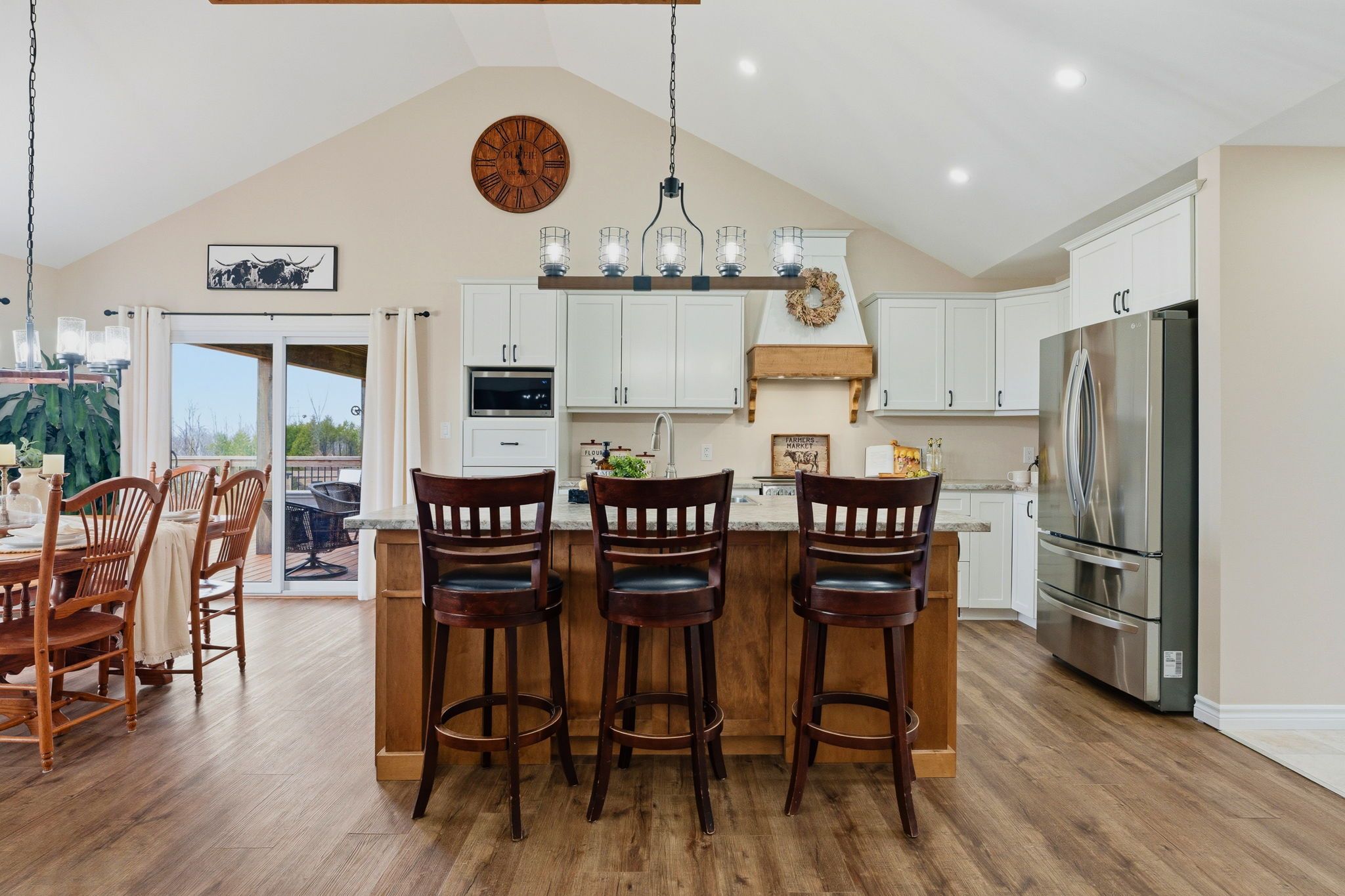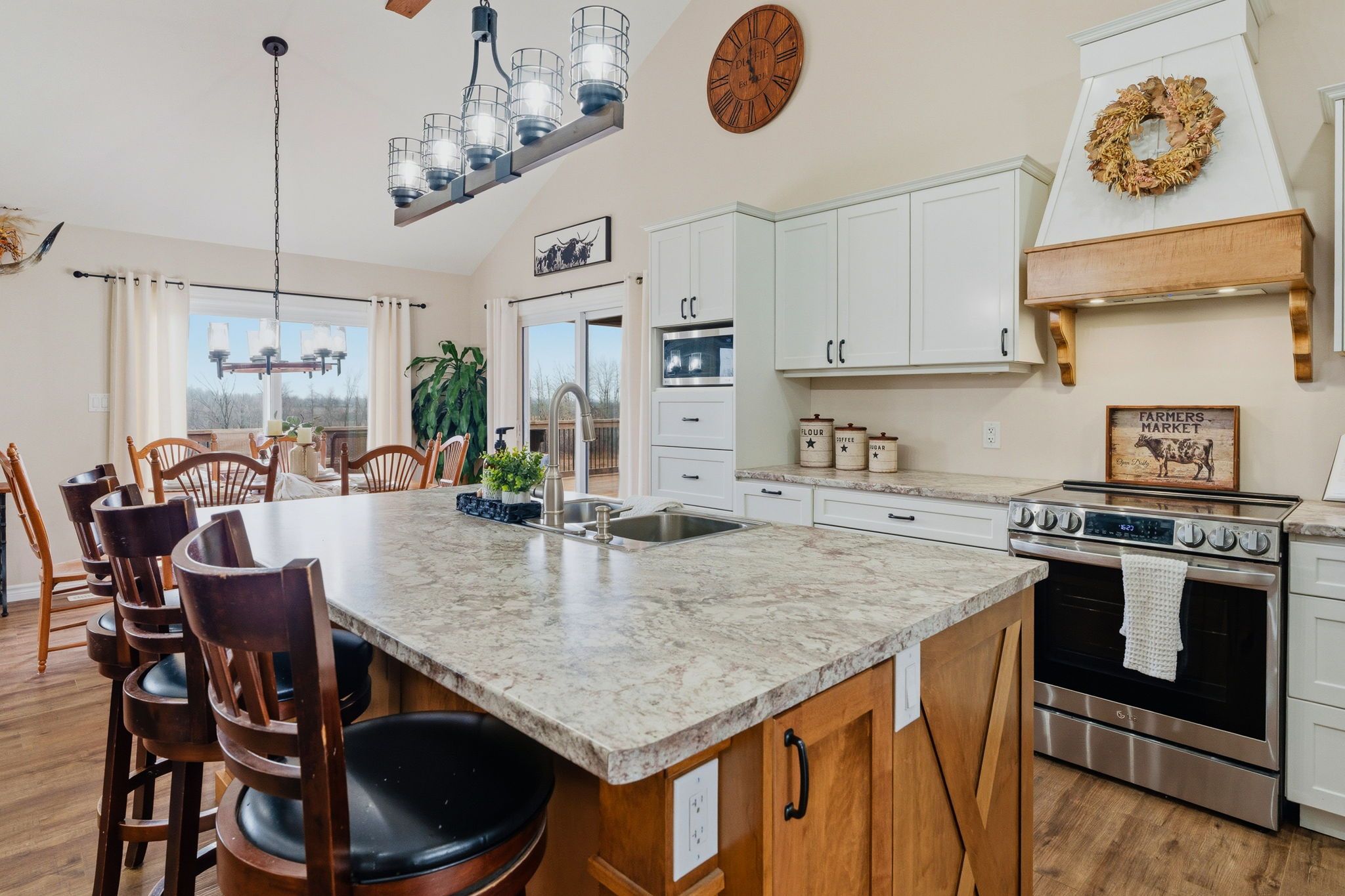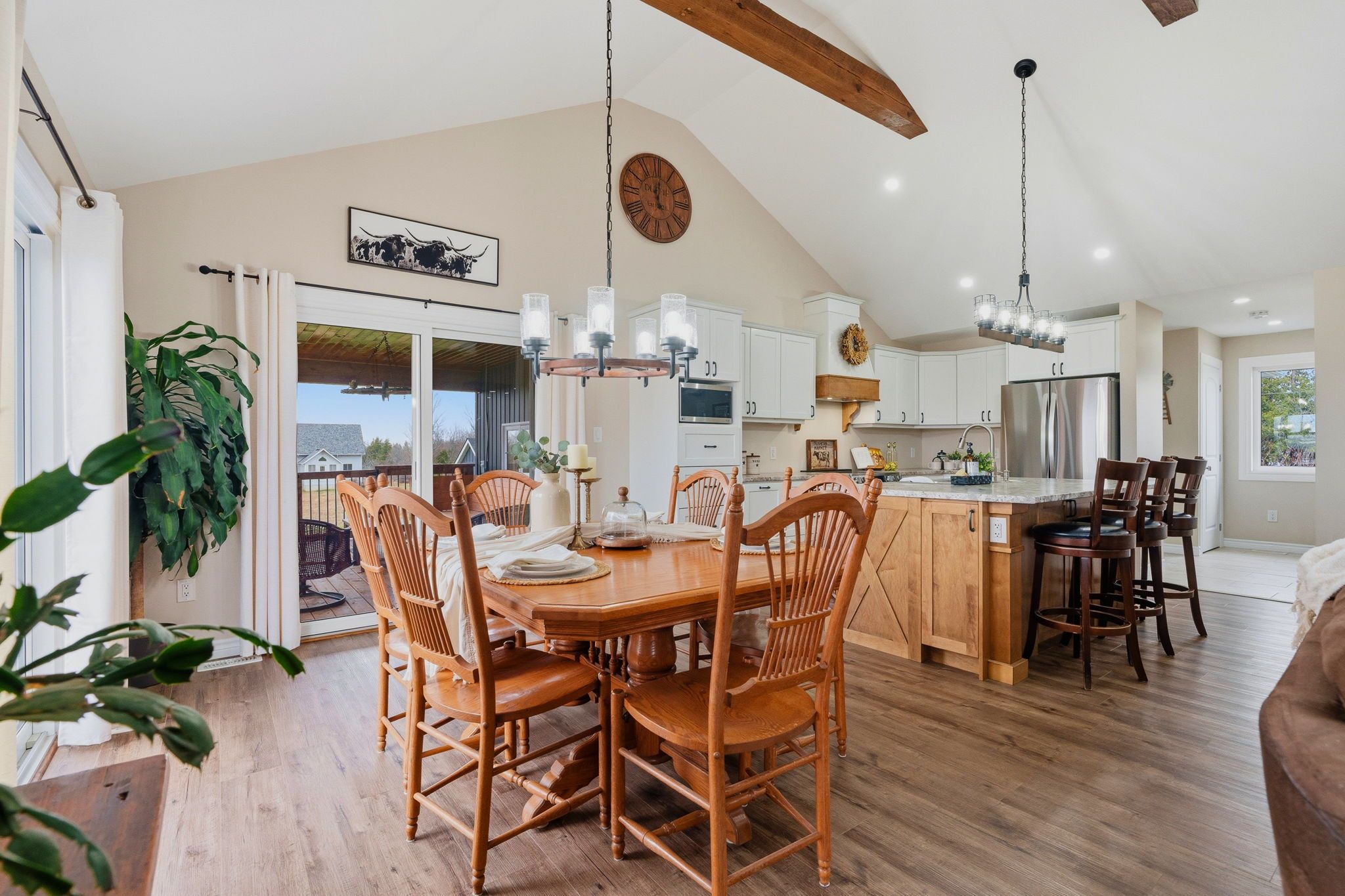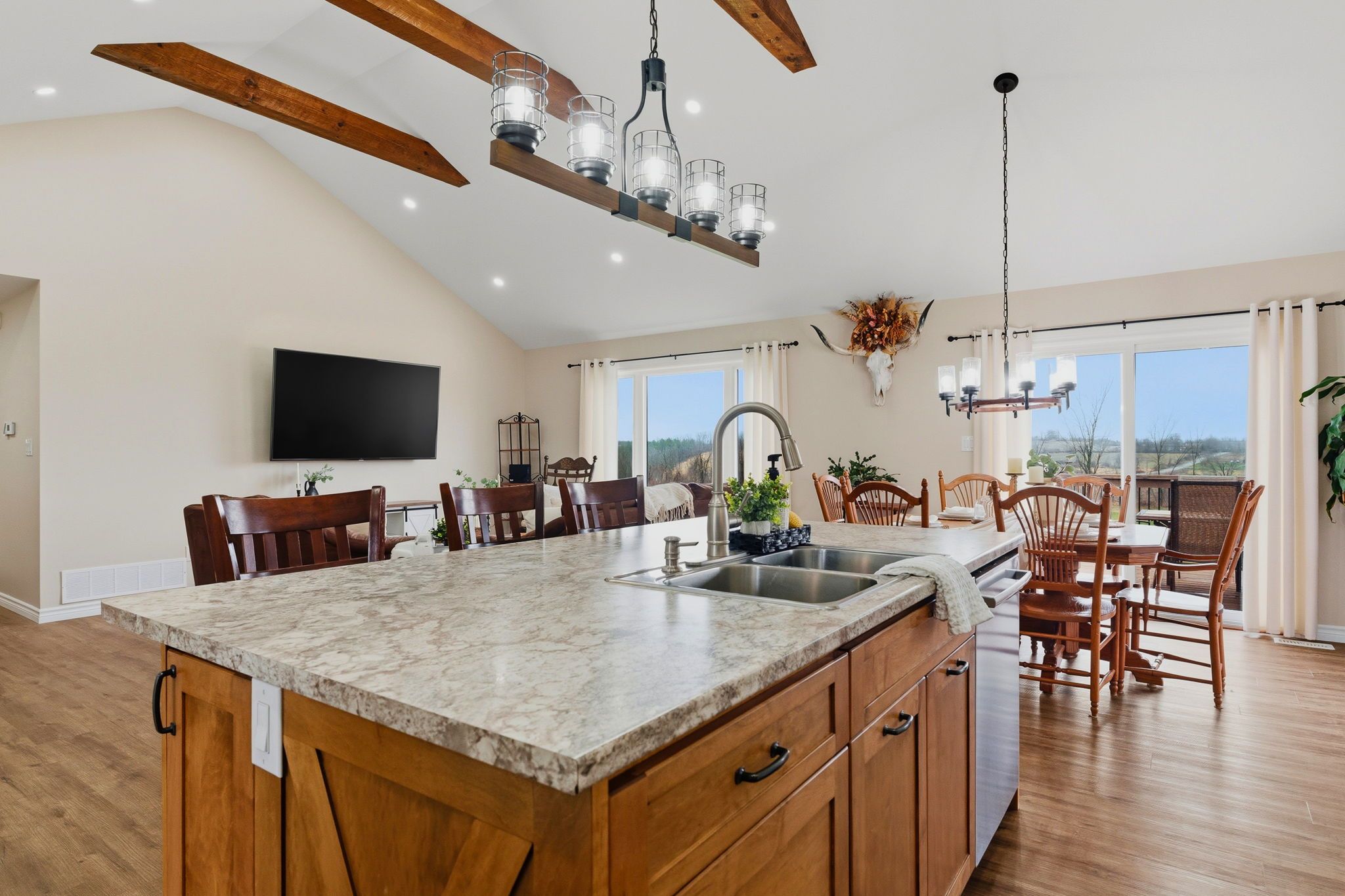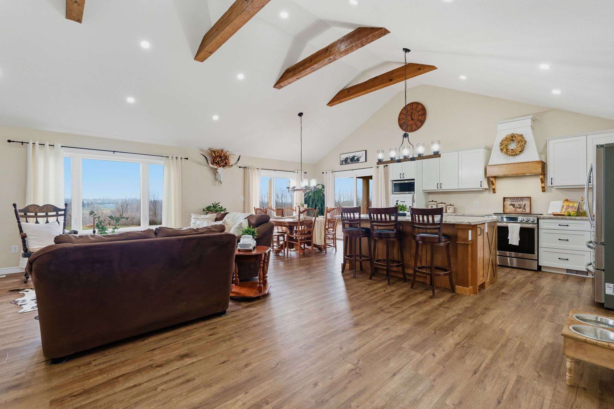 • Open concept kitchen and living area with rustic character.