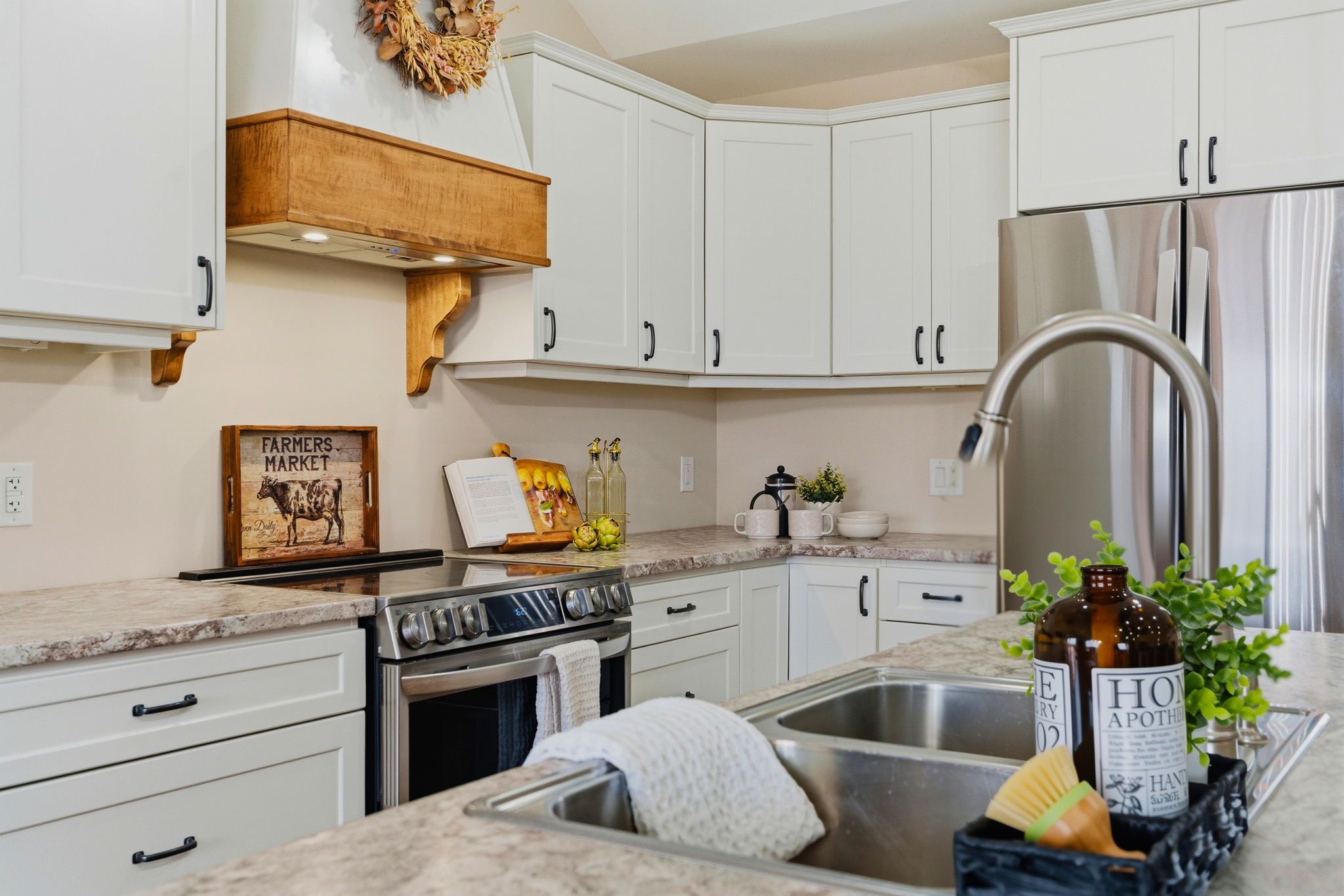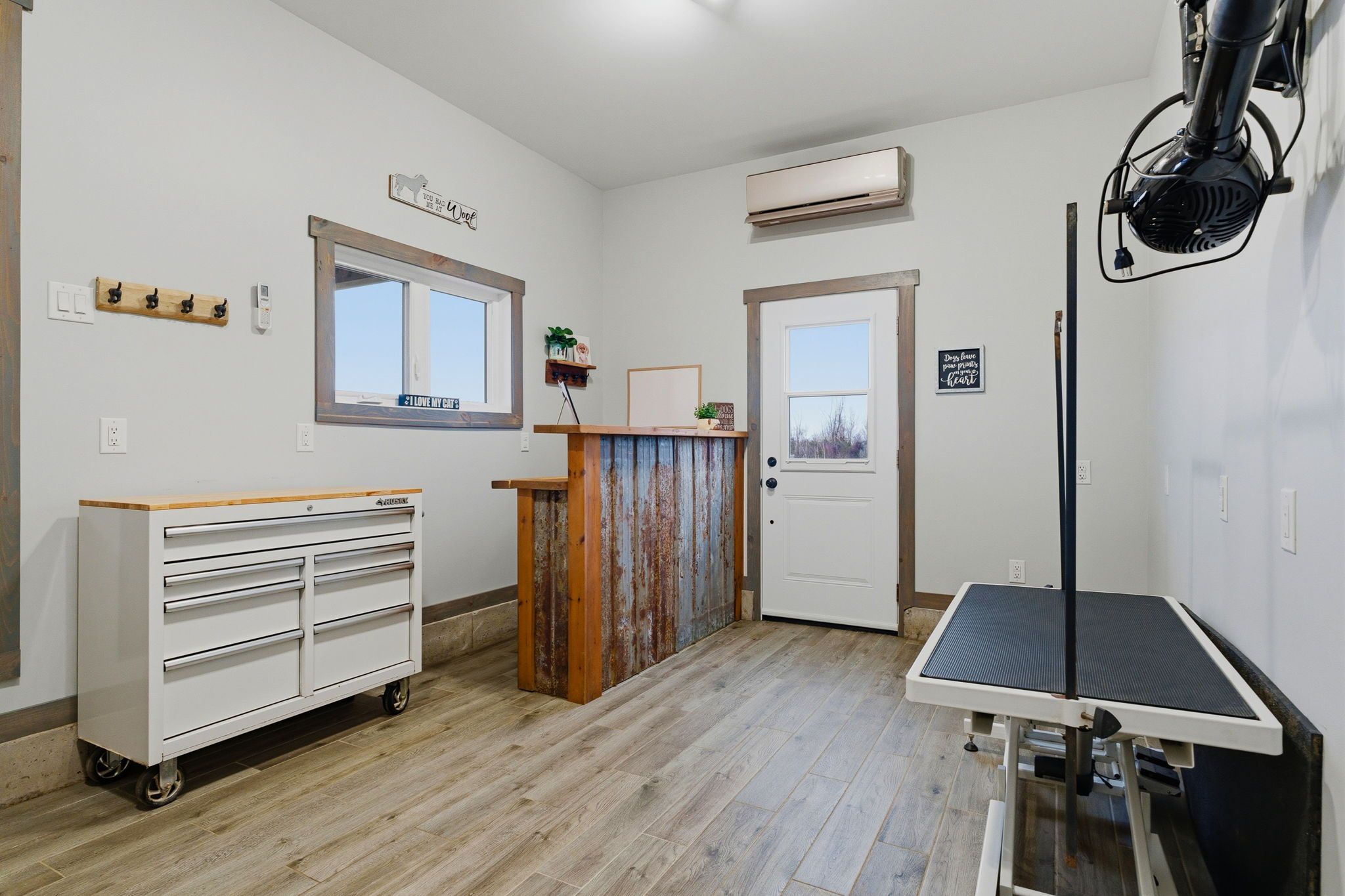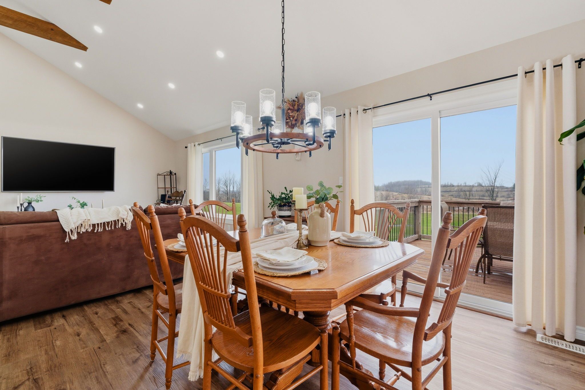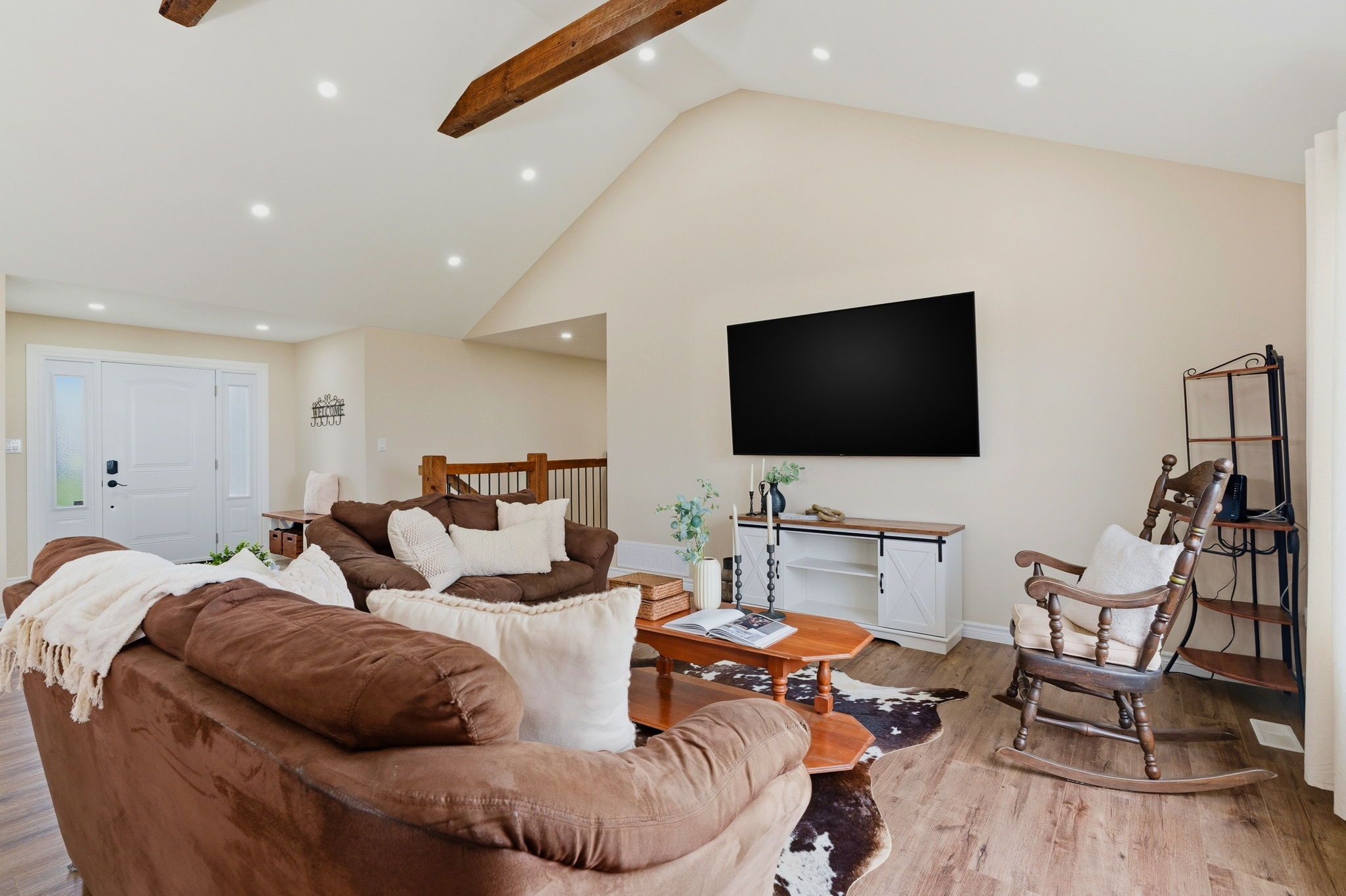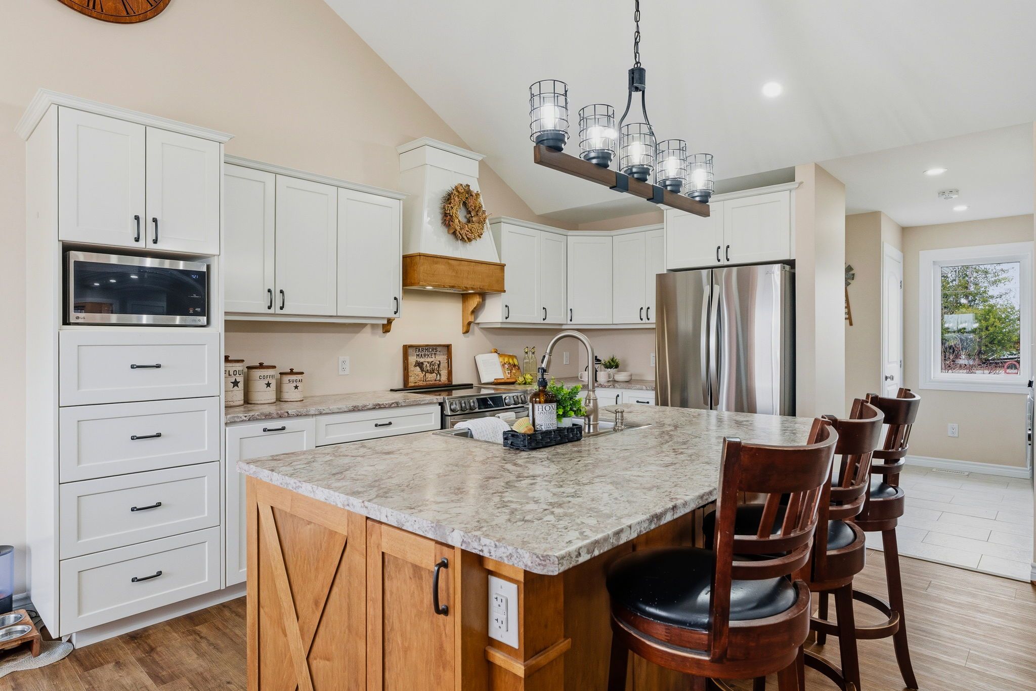 • Open concept kitchen and living area with rustic character.