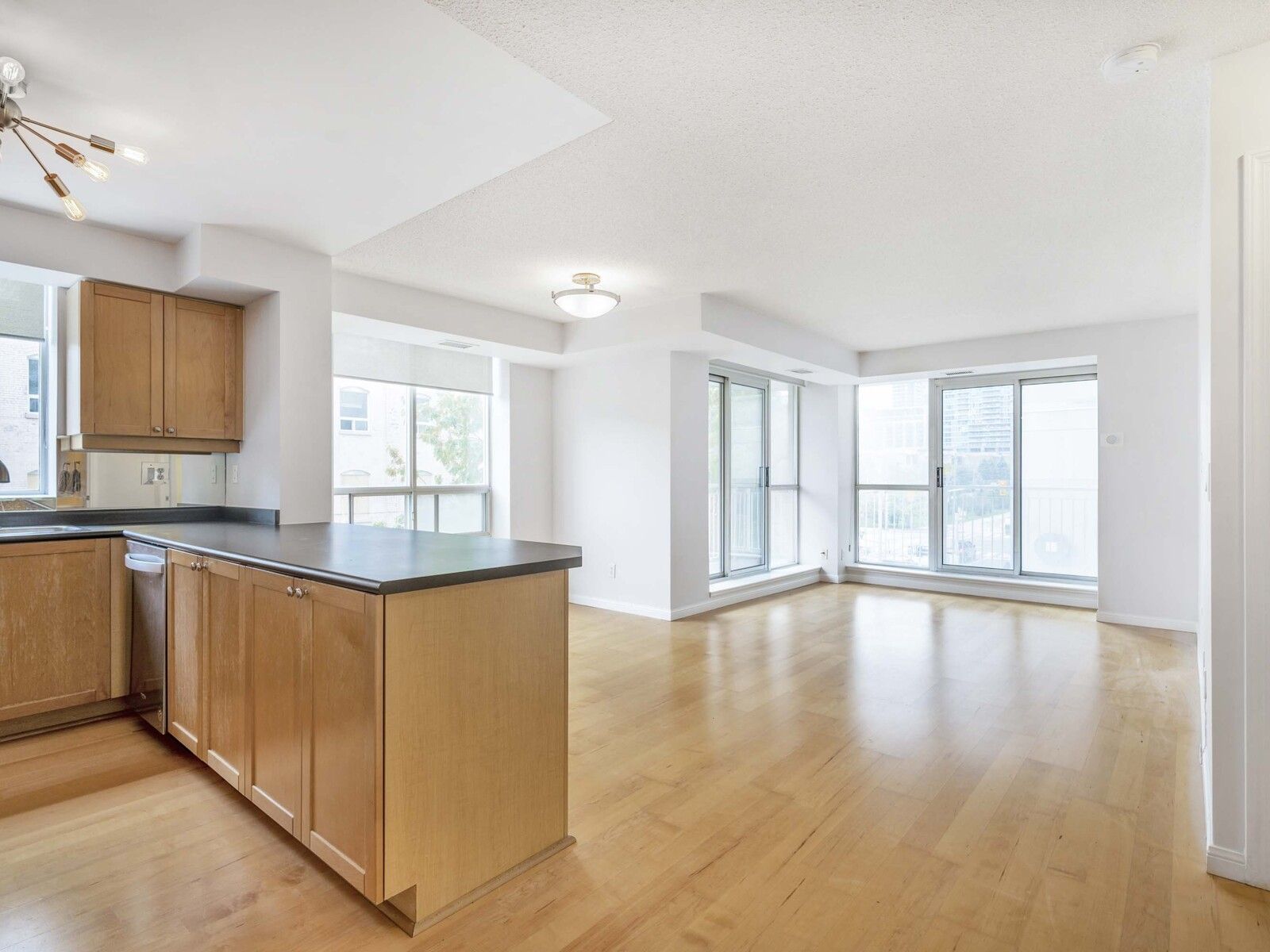 The suite life awaits at wellington square condos! Live on the sunny side in this fabulous 712 sq. Ft 1 bedroom corner suite. Located in one of king west village's most sought-after boutique buildings. Featuring southwest exposure and a wraparound balcony, this bright, airy suite is made for easy living and elevated entertaining. Step into a spacious open-concept living/dining area that flows seamlessly to the balcony-perfect for morning coffee or sunset cocktails. The modern kitchen features stainless steel appliances, wood cabinetry, a breakfast bar, and a bonus full-size pantry. The generous bedroom includes a walk-in closet, while the 4-piece bath, in-suite laundry, and stylish laminate floors throughout complete the picture. Unbeatable location: baby steps to trinity bellwoods, stanley park, the well, liberty village, queen west, ossington, the lakeshore & garrison crossing. Super-convenient ttc access! Building perks include a stunning rooftop terrace with bbqs and cn tower views, a gym, party room, games room, visitor parking & bike storage. 1 parking & 1 locker included.