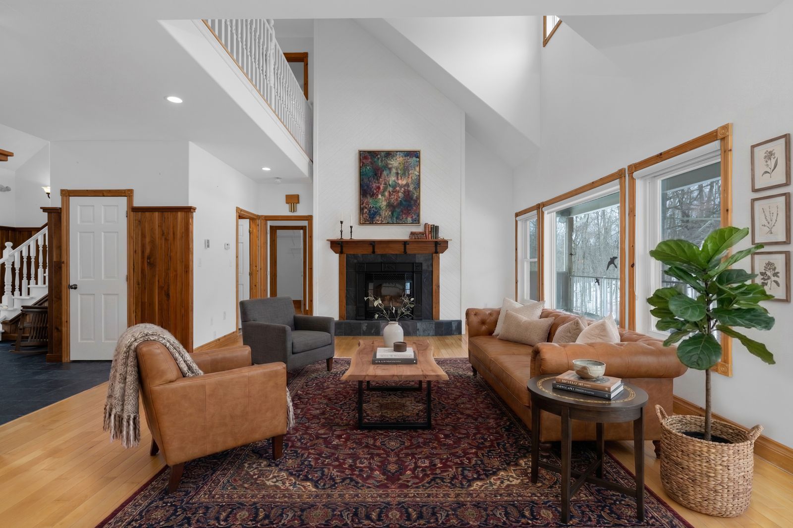 Meticulously kept 4000+ sq ft estate on 1. 33 acres with a walkout basement & exclusive access to 52 acres! Set on 1. 33 acres in a prestigious estate neighbourhood in sought-after horseshoe valley, this well-maintained 2-storey home enjoys a treed setting with no homes directly in front or behind. A peaceful cul-de-sac address, lovely dormer windows, a large covered front porch, and an attached 2-car garage give this home a memorable first impression. Enjoy exclusive access to approximately 52 acres of private land for trillium trail residents, featuring nature trails, lookout points, open field space, and shared use of a storage shop. Hardwood flooring carries throughout the main and second level, while the combined living and dining room is defined by a soaring vaulted ceiling, oversized windows, a fireplace, and a double garden door walkout. Beautifully finished, the kitchen features quartz counters, built-in stainless steel appliances, white cabinetry with some glass inserts, a centre island, and breakfast bar seating. Main floor laundry with garage access adds function, while the main floor primary bedroom offers a private walkout to the back deck and a 5-piece ensuite with a soaker tub, separate shower, and water closet. Upstairs, 2 additional bedrooms, a full bathroom, and a loft-style family room with a gas fireplace create an upper level with plenty of character. The fully finished walkout basement with garage access and in-law potential extends the home's living space with a large rec room featuring a fireplace and double garden door walkout, along with a wet bar, bedroom, full bathroom, and large storage area. A new furnace in 2026 adds peace of mind. This exceptional location places you minutes from golf courses, copeland forest, ski hills, country clubs, and vettä nordic spa, while the new horseshoe heights public school is within walking distance, and orillia and downtown barrie are both under 25 minutes away.