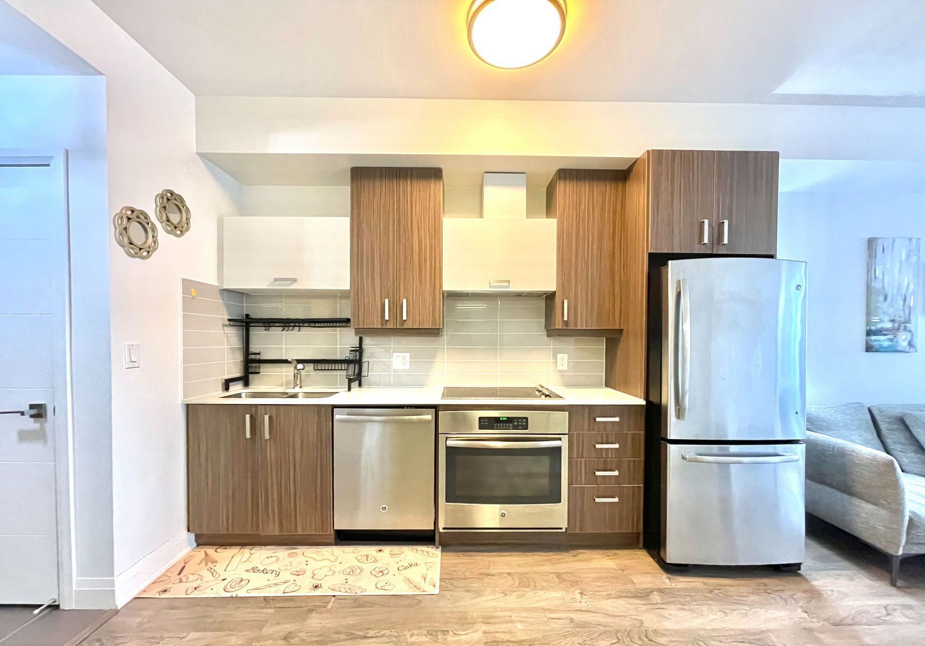 • Open concept kitchen features quartz counters and stainless steel appliances.