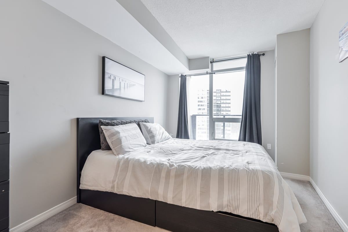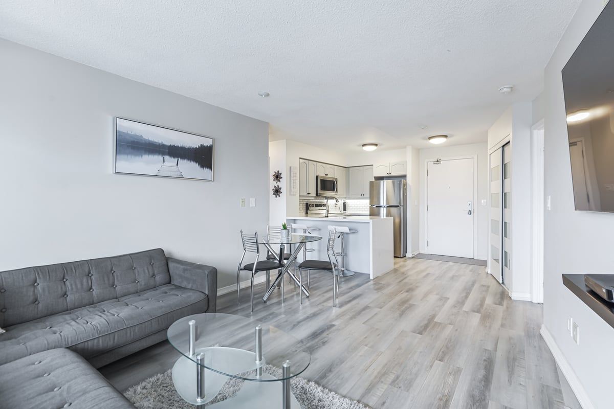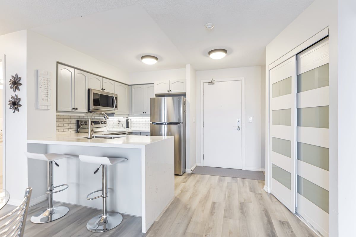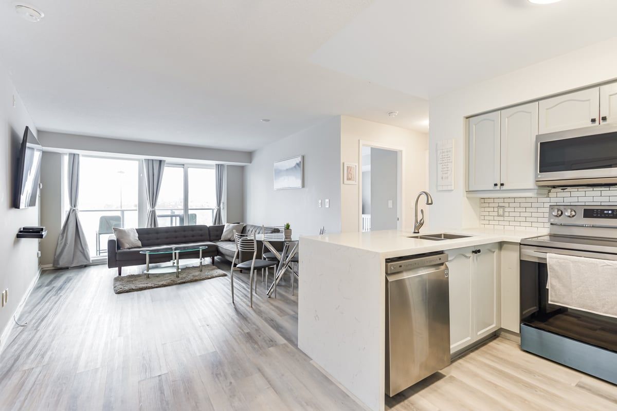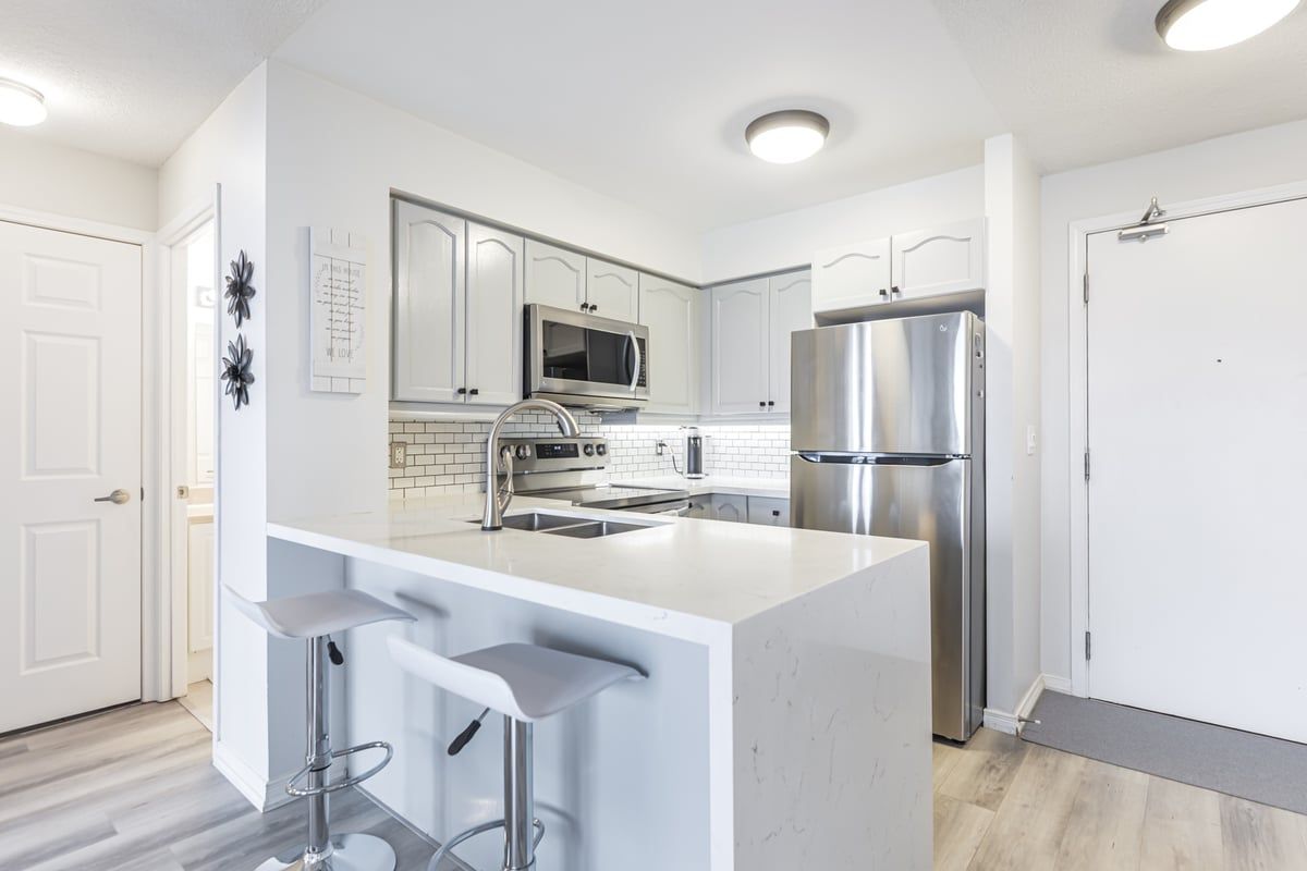 Spacious and beautifully updated 2-bedroom, 2-bath residence in sought-after bellair gardens, complete with the rare offering of two side-by-side parking spaces. Enjoy sweeping southwest skyline views from this bright, well-appointed suite, ideally located near major highways, shops, trails, the ttc, and everyday conveniences. The modern kitchen features quartz countertops, a striking waterfall island, stainless steel appliances, and a custom backsplash. A highly functional split-bedroom layout provides excellent privacy, while floor-to-ceiling windows flood the living space with natural light. Vinyl flooring throughout the living areas adds a fresh, contemporary feel, making this home ideal for comfortable everyday living and entertaining.