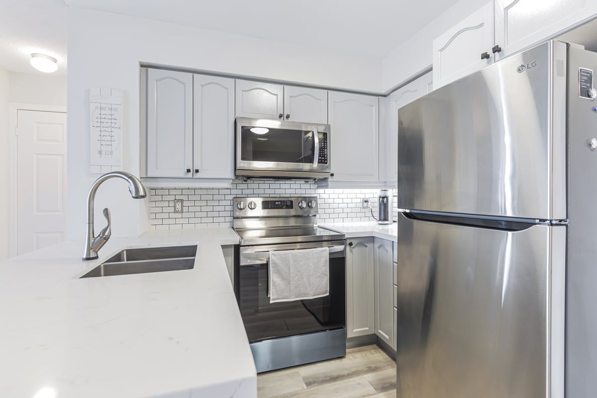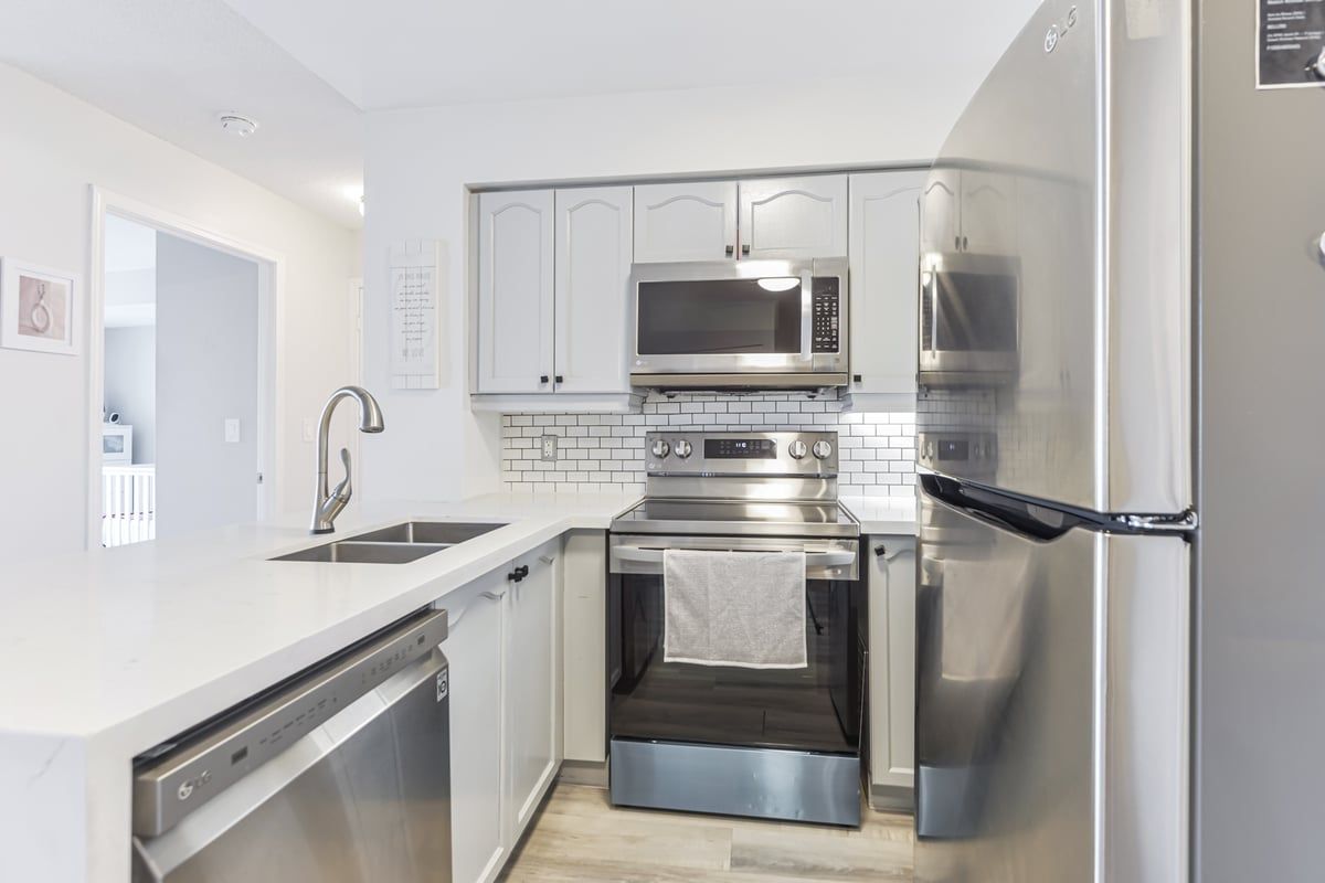 • Modern kitchen features quartz countertops and stainless steel appliances.