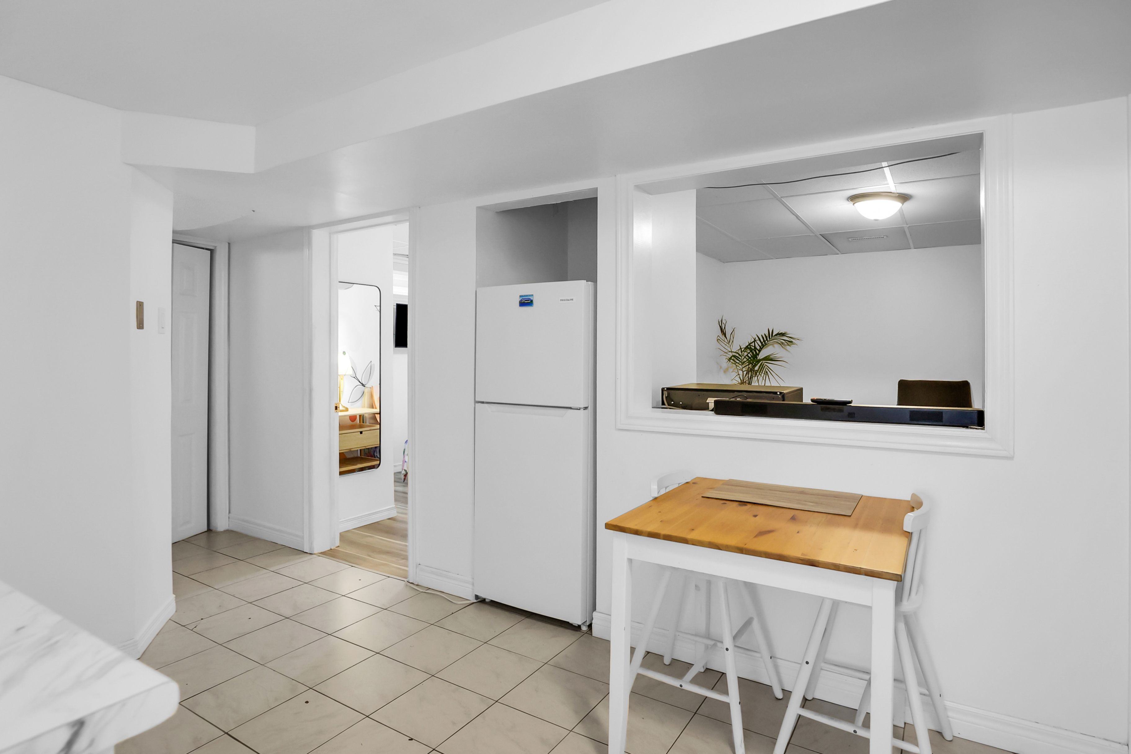 • Private entrance and spacious open-concept living space with updated flooring.