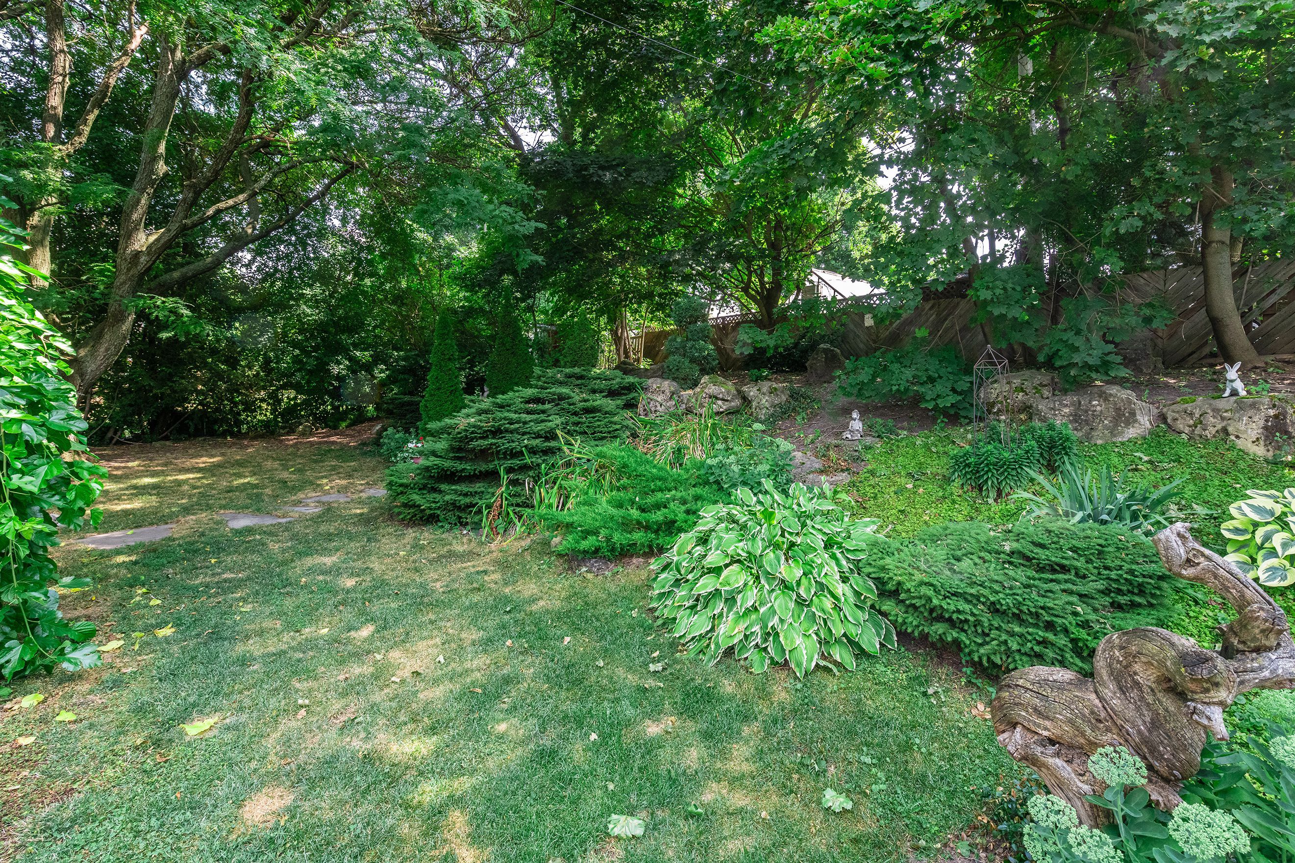 • Large backyard with mature greenery and professional stonework.