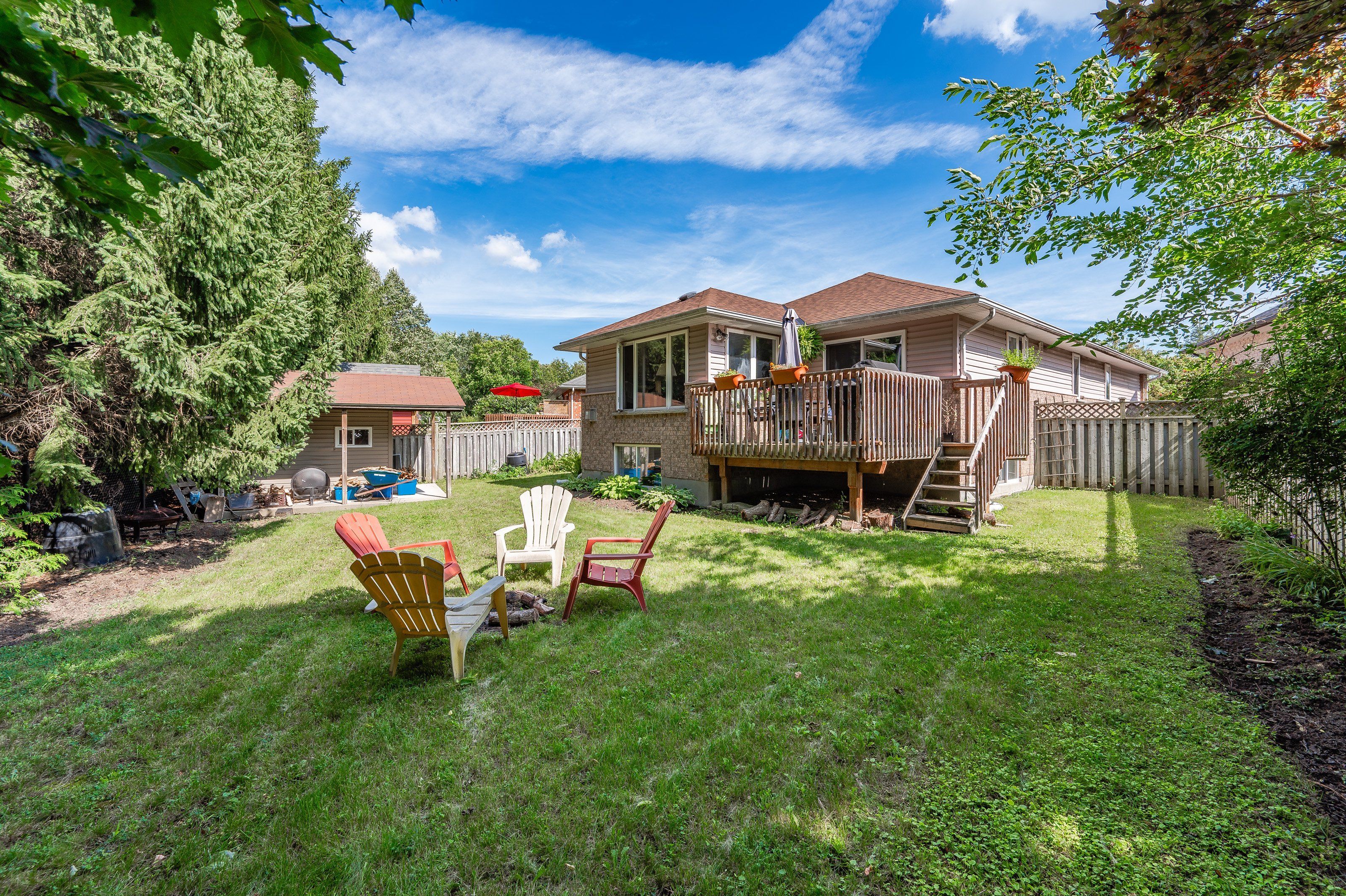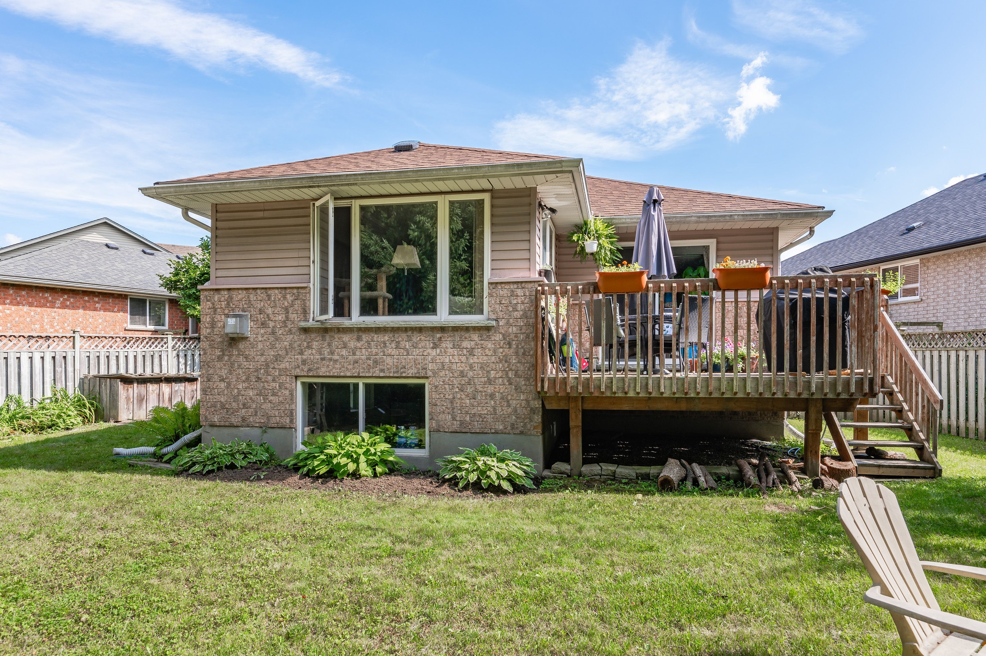 • Private deck and large pie-shaped backyard with conservation view.