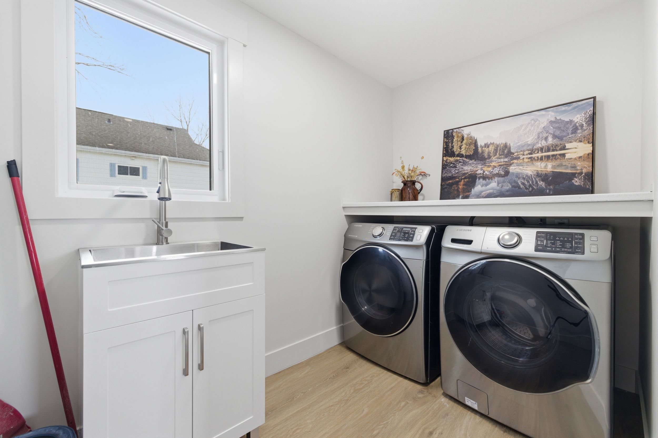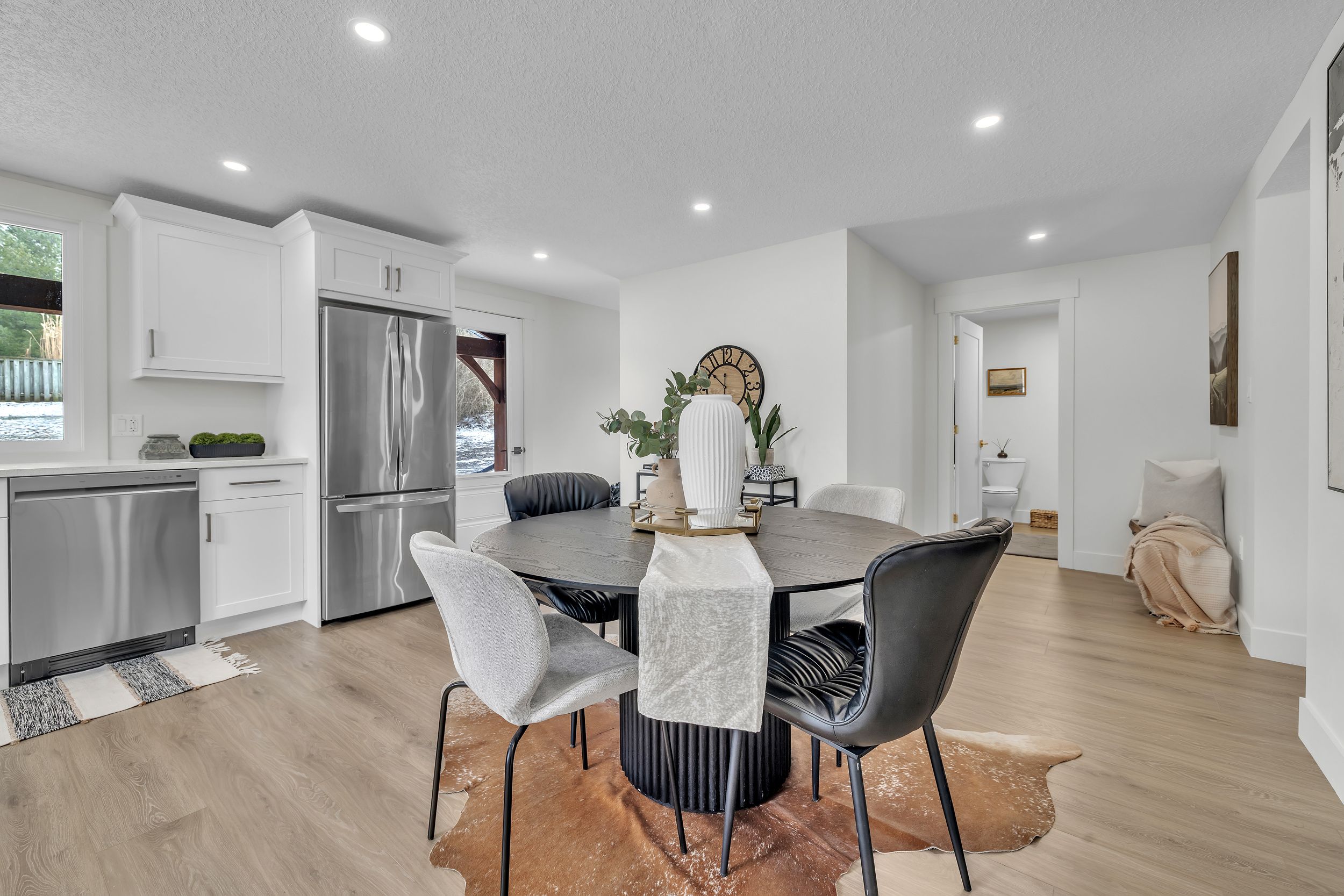 • Huge eat-in kitchen with quartz countertops and stainless steel appliances.