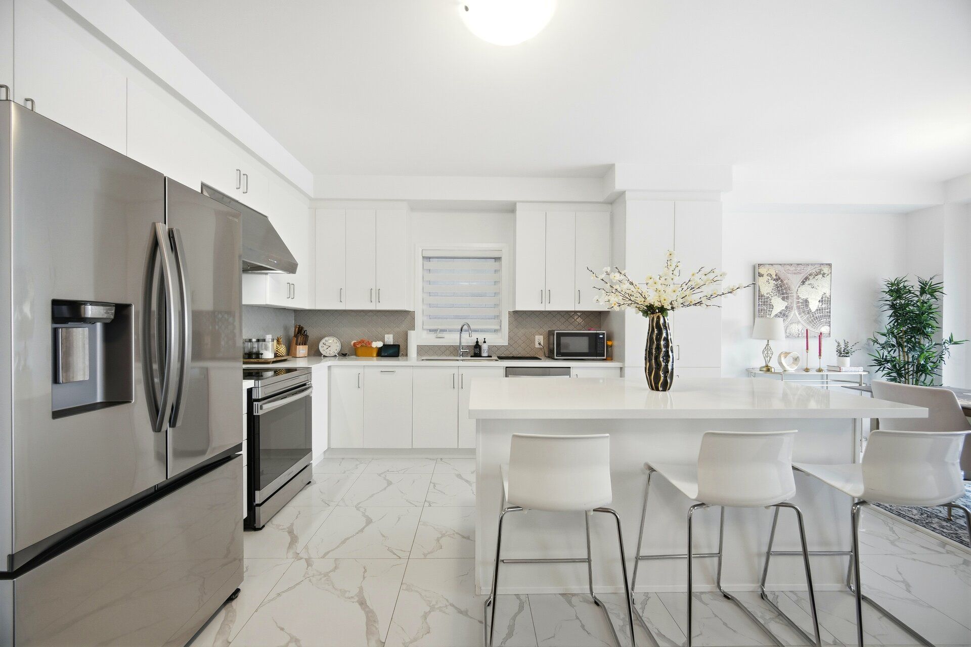 • Modern kitchen equipped with stainless steel appliances and quartz countertops.