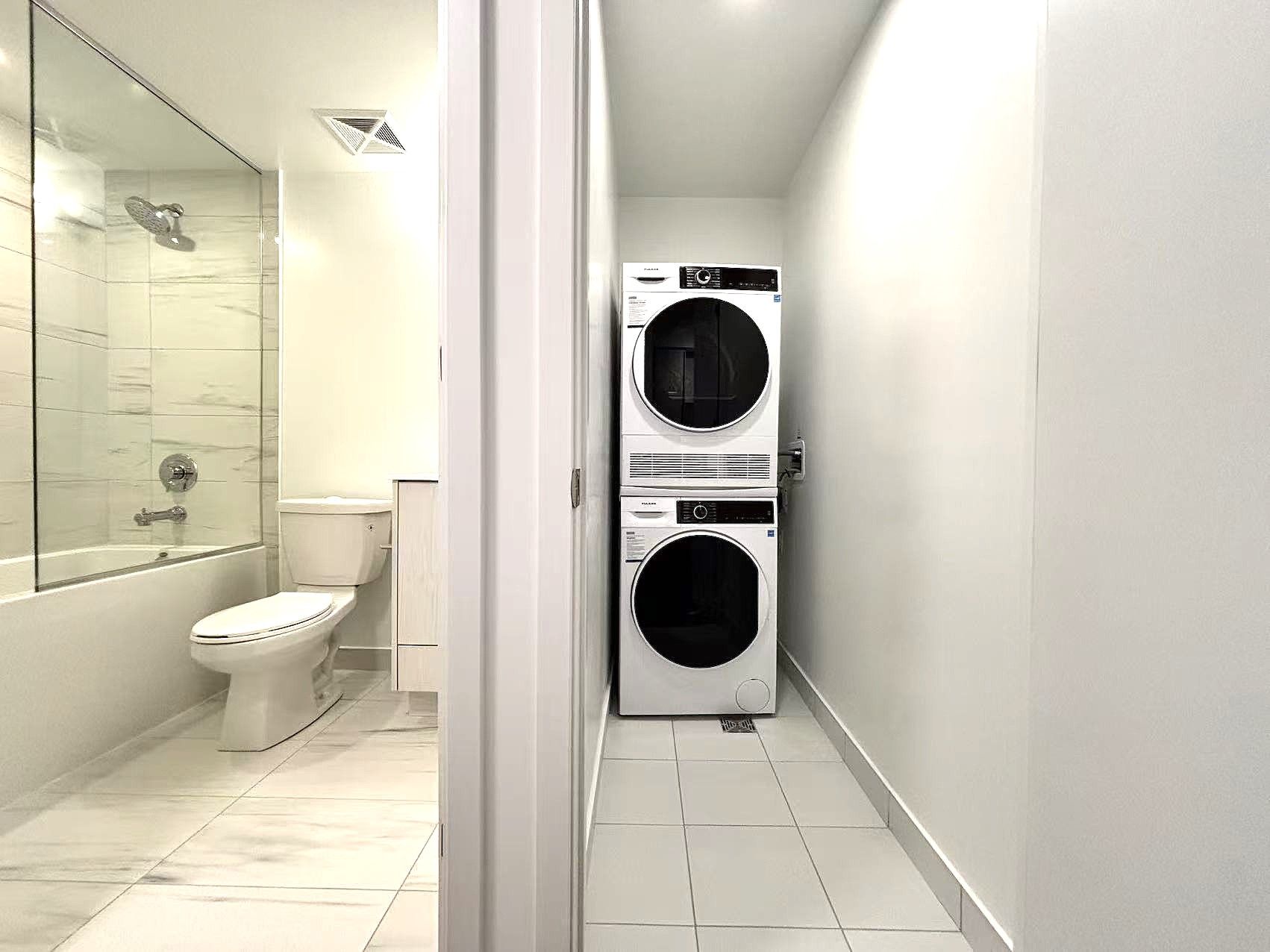 Welcome to this stunning, brand new south-facing 1+1 bedroom suite , offering an abundance of natural sunlight throughout the day. Thoughtfully designed with a functional layout and two full bathrooms, this unit features a spacious private balcony perfect for relaxing or entertaining. The versatile den comes with a sliding door, easily converted to a second bedroom or a quiet home office. The fully enclosed primary bedroom includes its own private ensuite, providing comfort and privacy. Enjoy a bright open-concept living and dining area, complemented by a modern kitchen with quality finishes and ample storage. Floor-to-ceiling windows enhance the airy feel of the space, and ensuite laundry adds everyday convenience. Situated in a highly sought-after downtown location, with no frills conveniently located downstairs and just steps to george brown college, st. Lawrence market, public transit, restaurants, shops, and beautiful waterfront trails. An ideal home for professionals or students seeking style and convenience in the heart of the city.