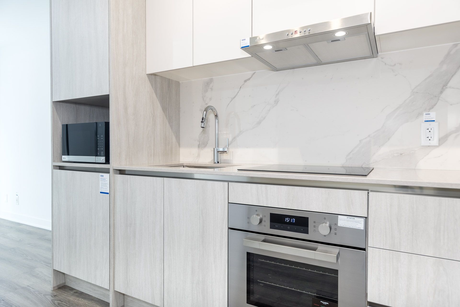 • Modern kitchen with integrated appliances and quartz countertops.