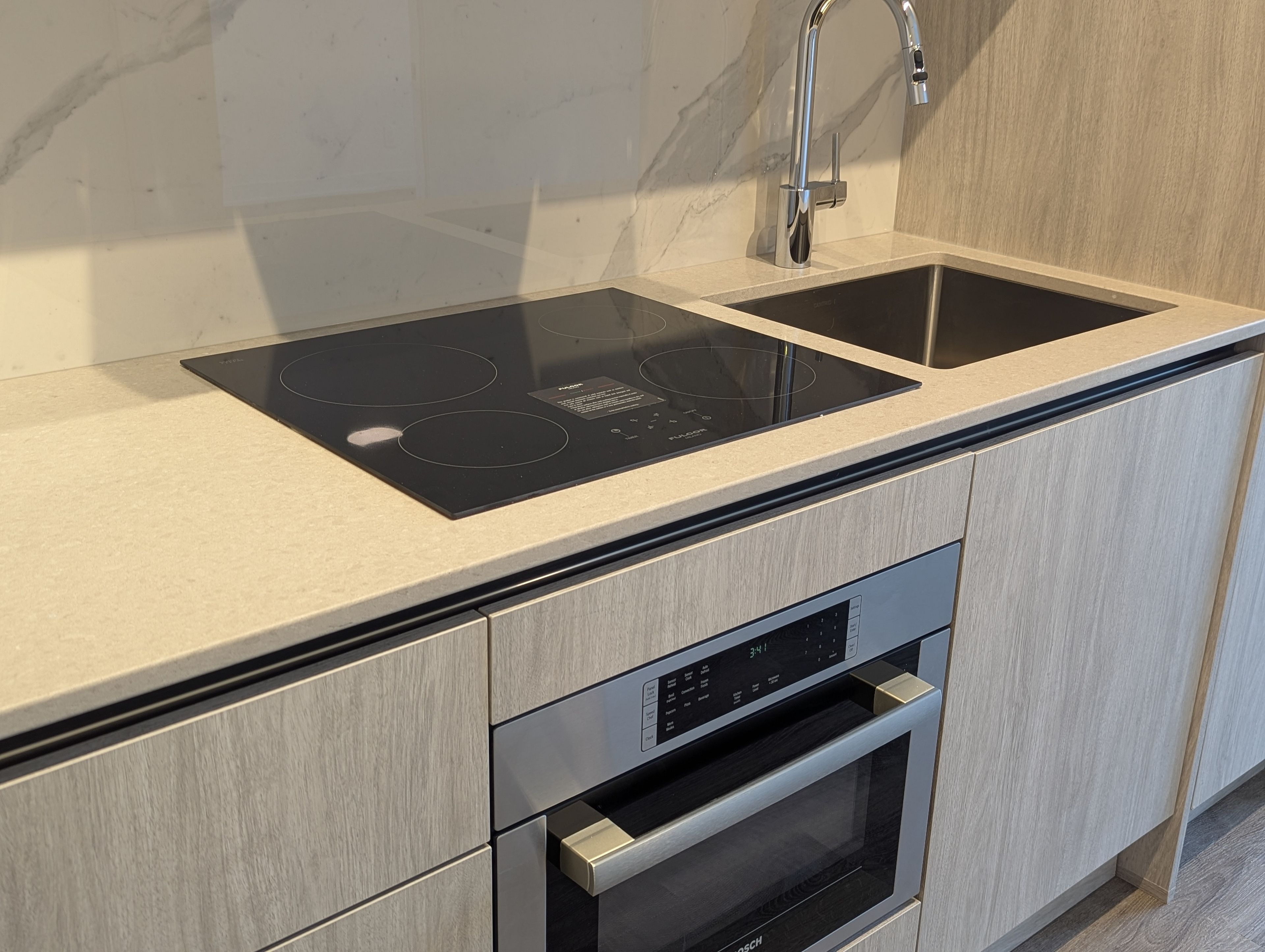 • Modern kitchen featuring integrated appliances and sleek quartz countertops.