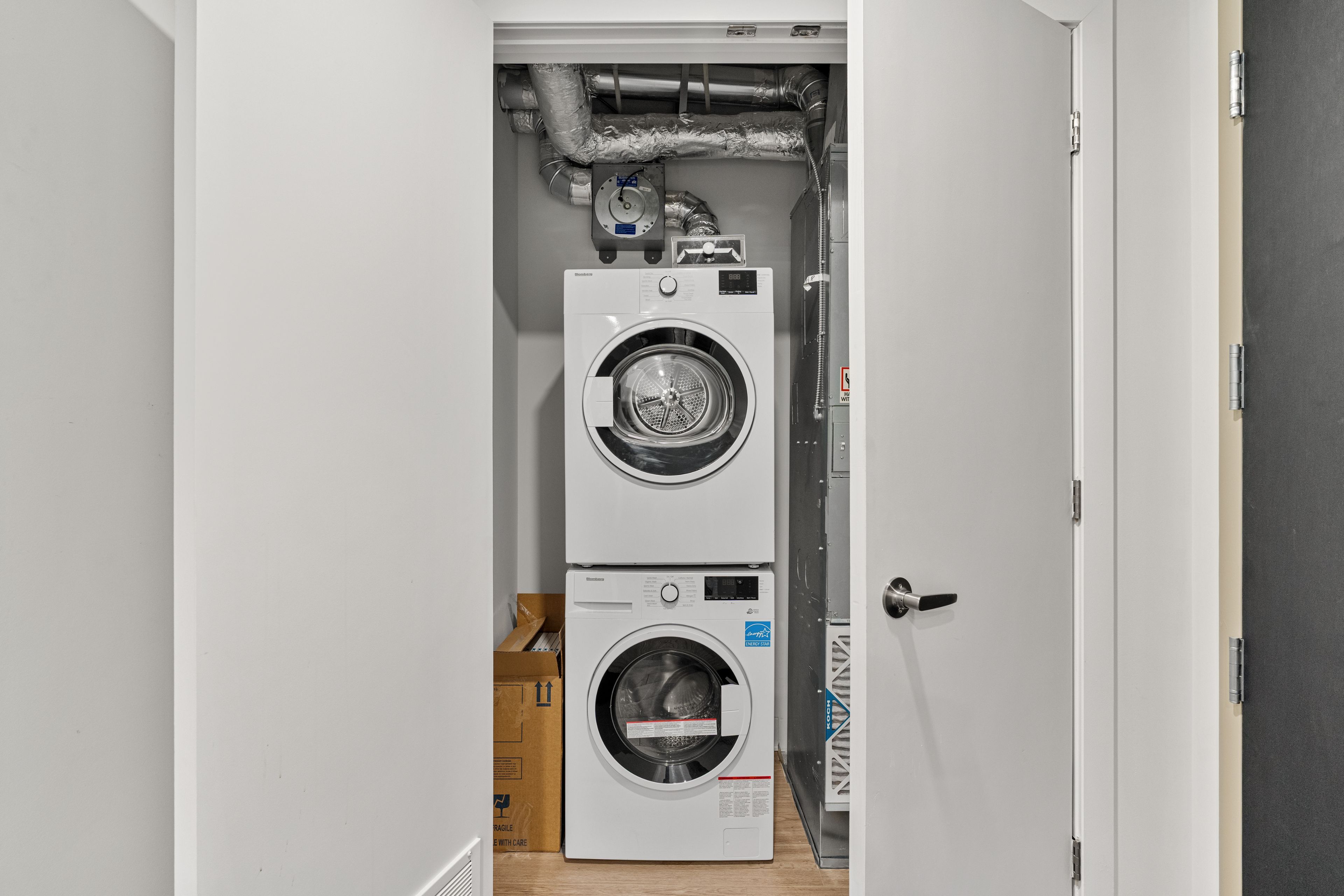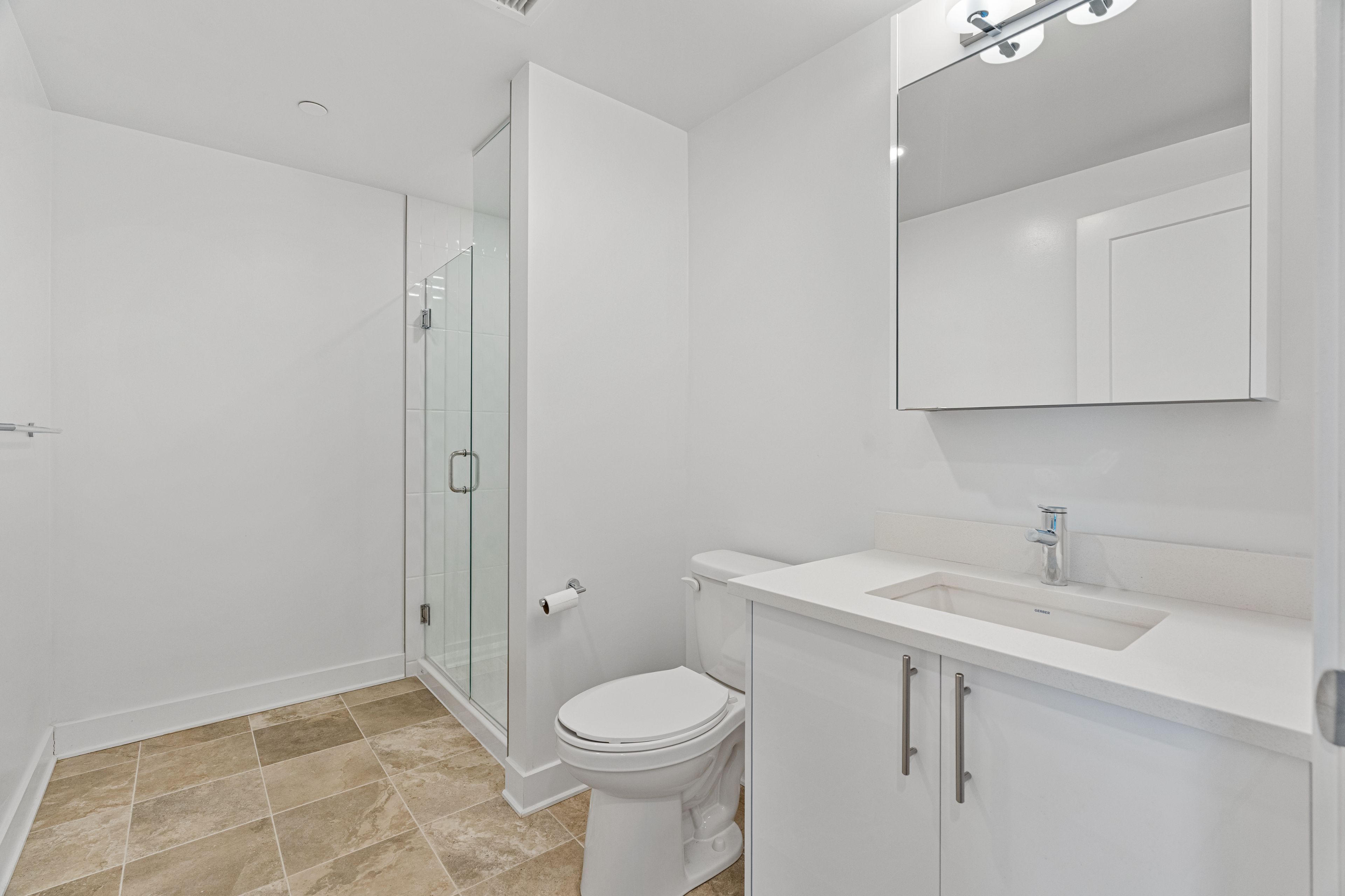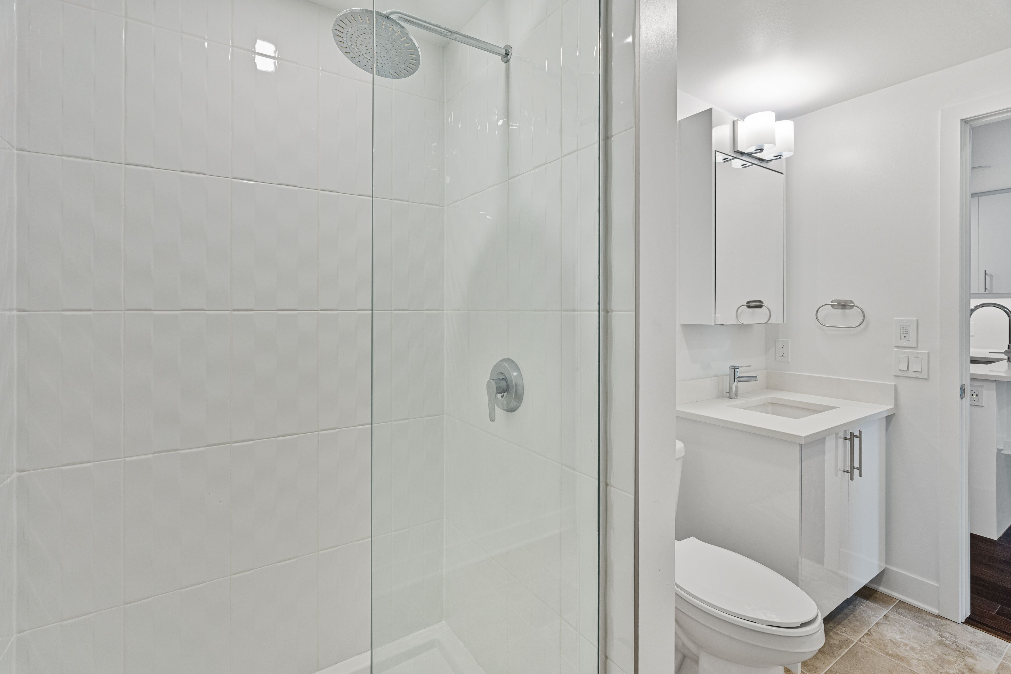 • In-unit laundry and contemporary glass-enclosed shower for convenience.
