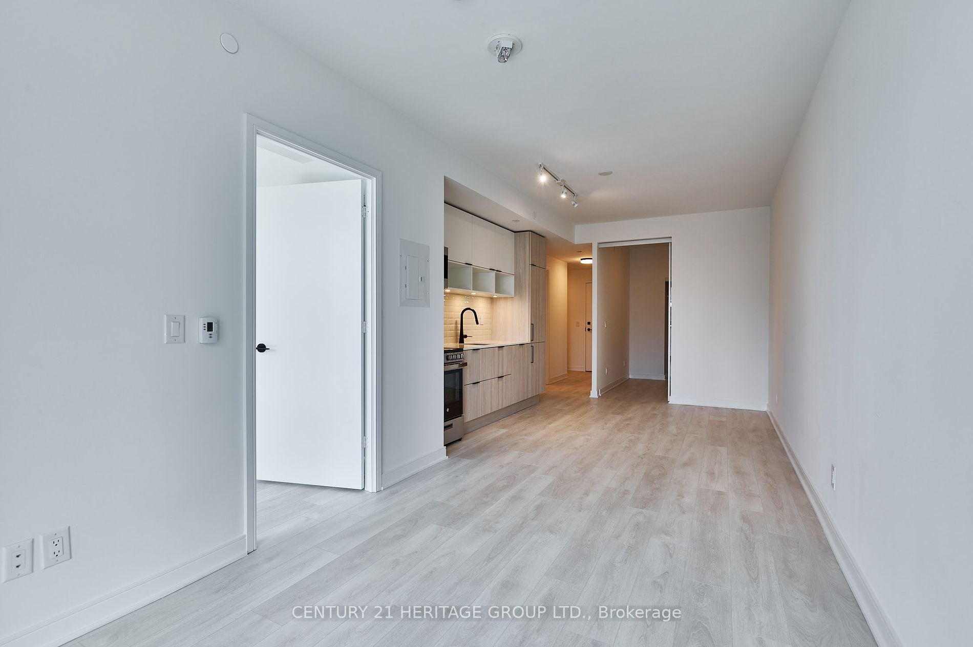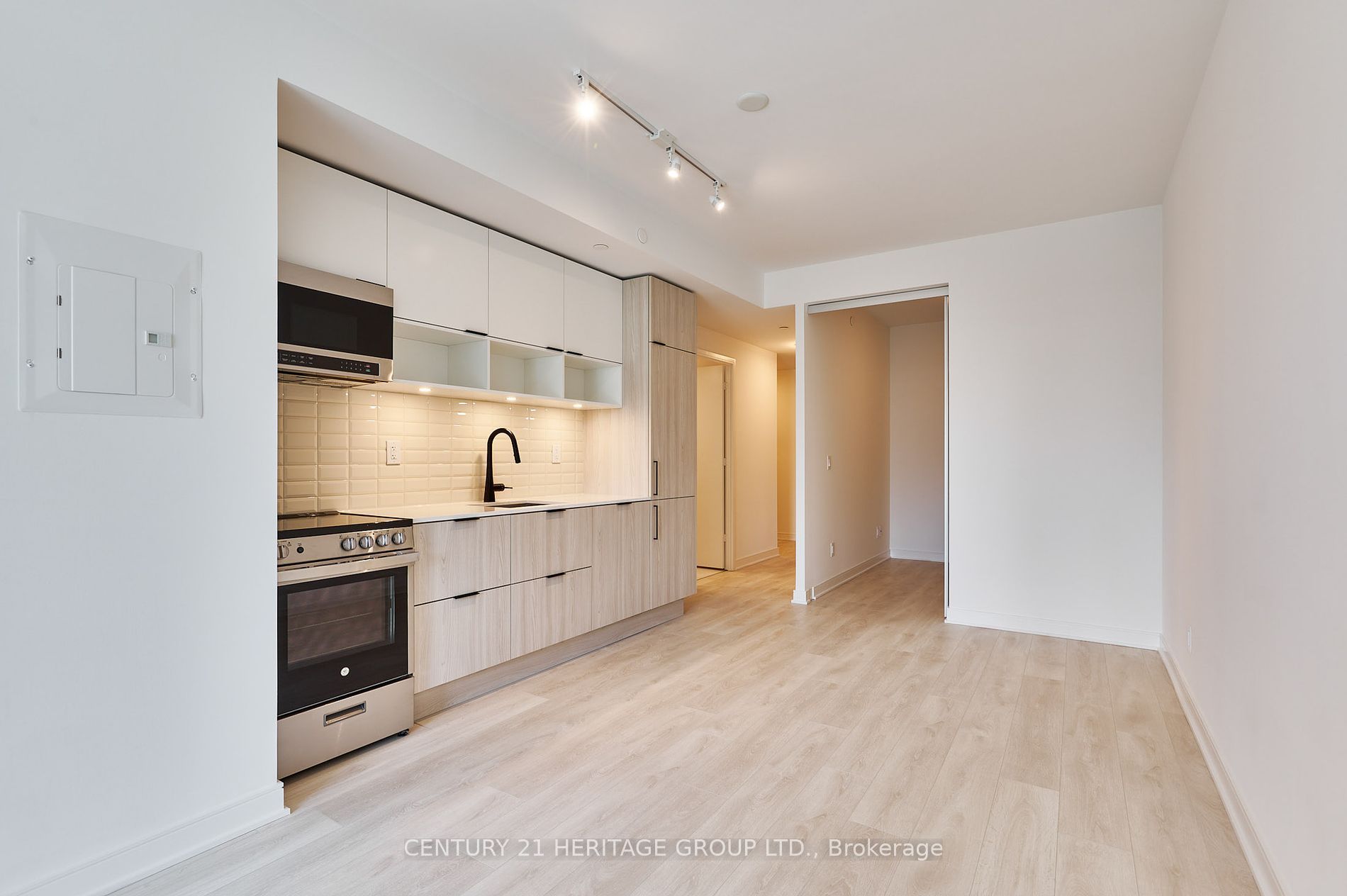 • Modern open concept layout with built-in appliances and hardwood floors.