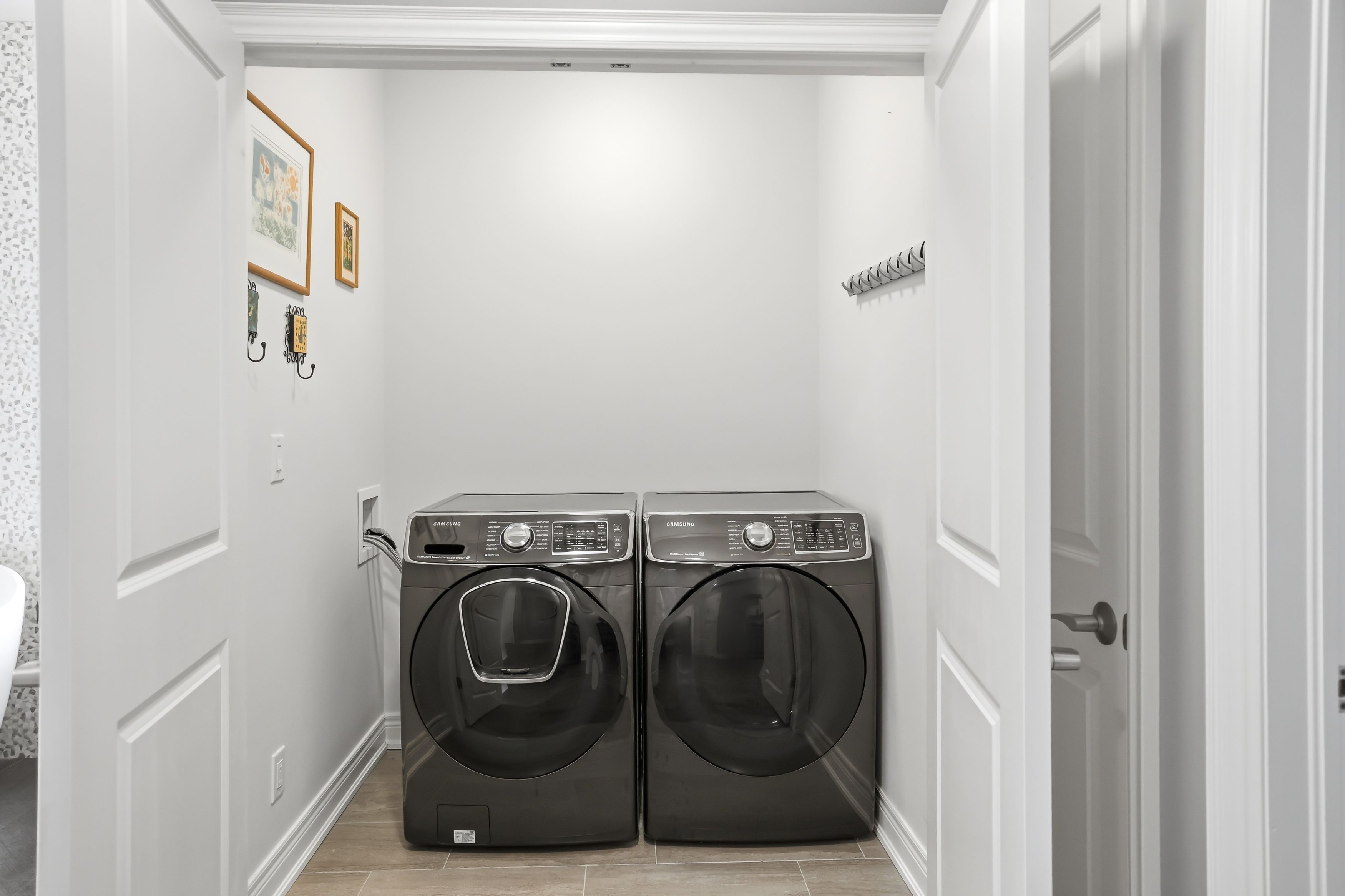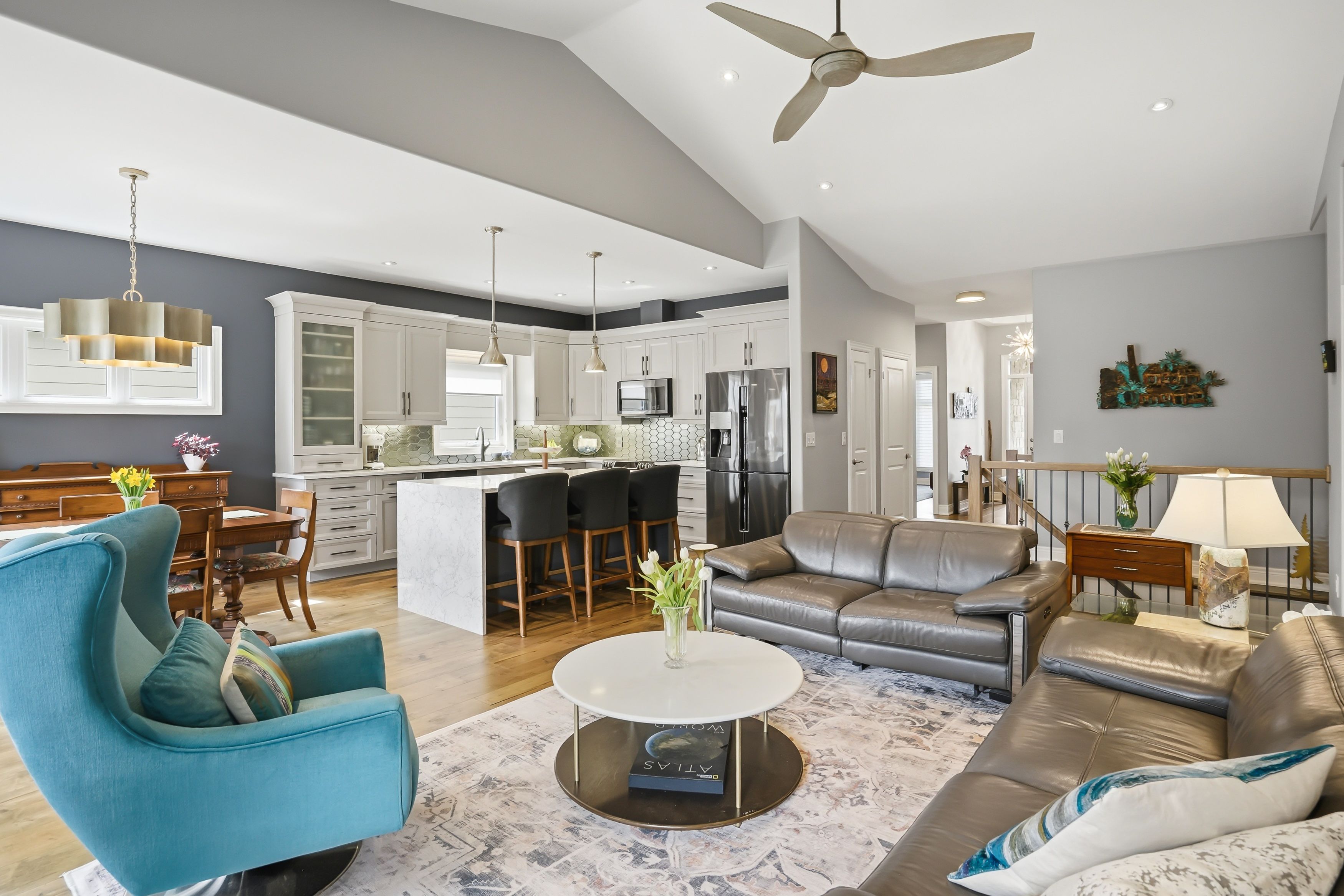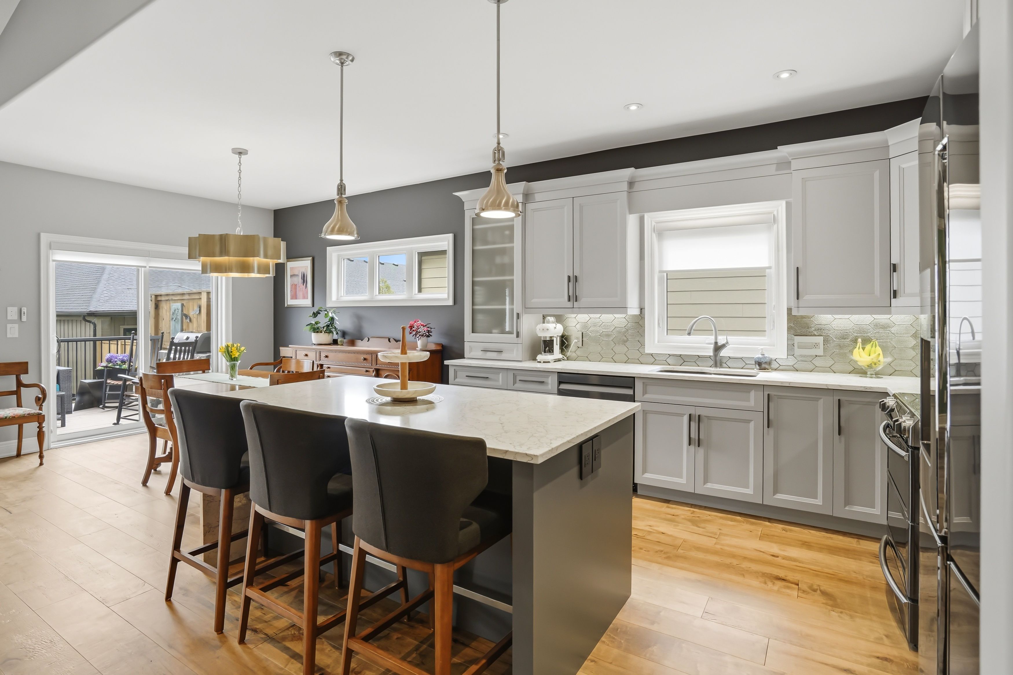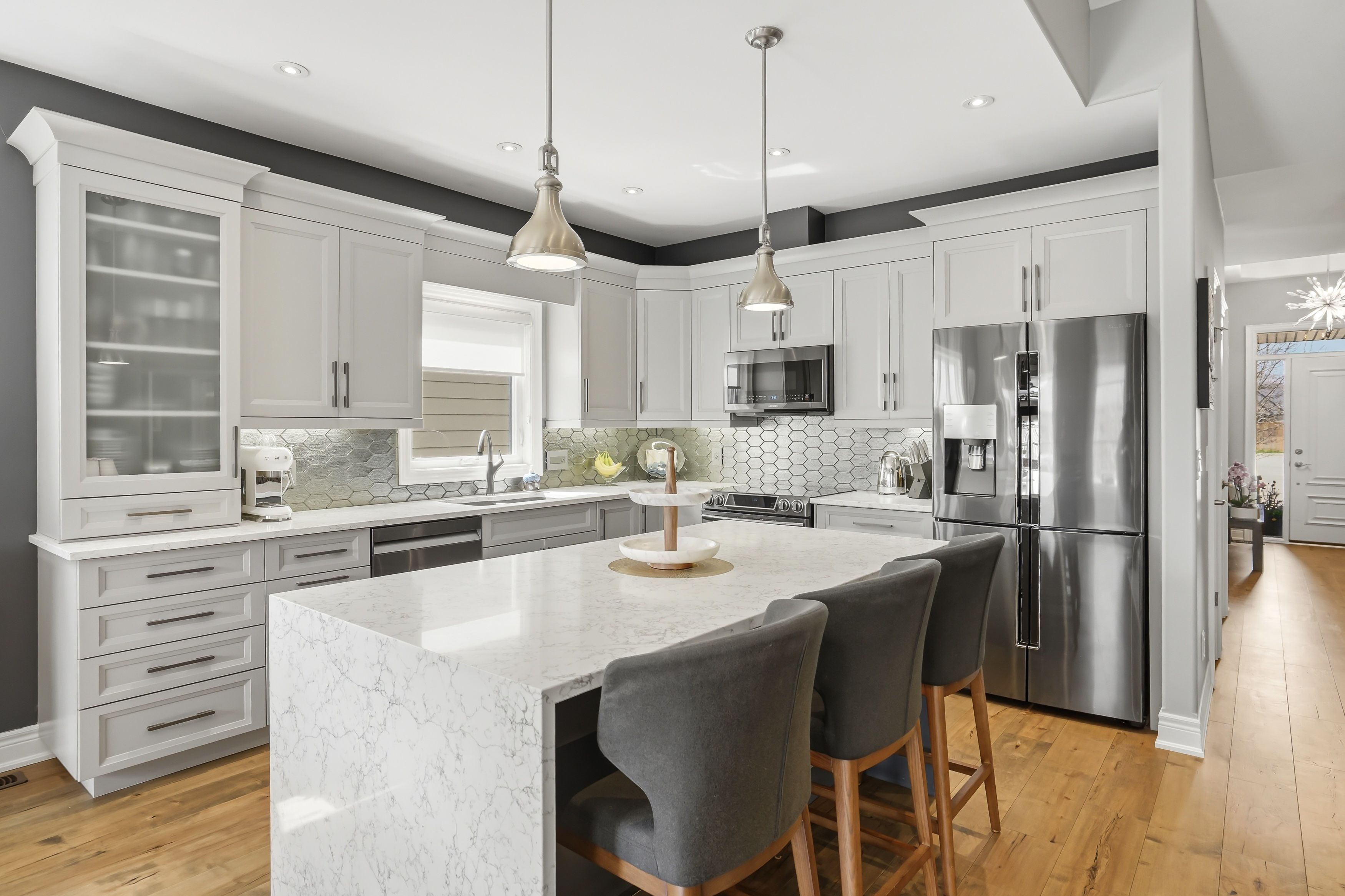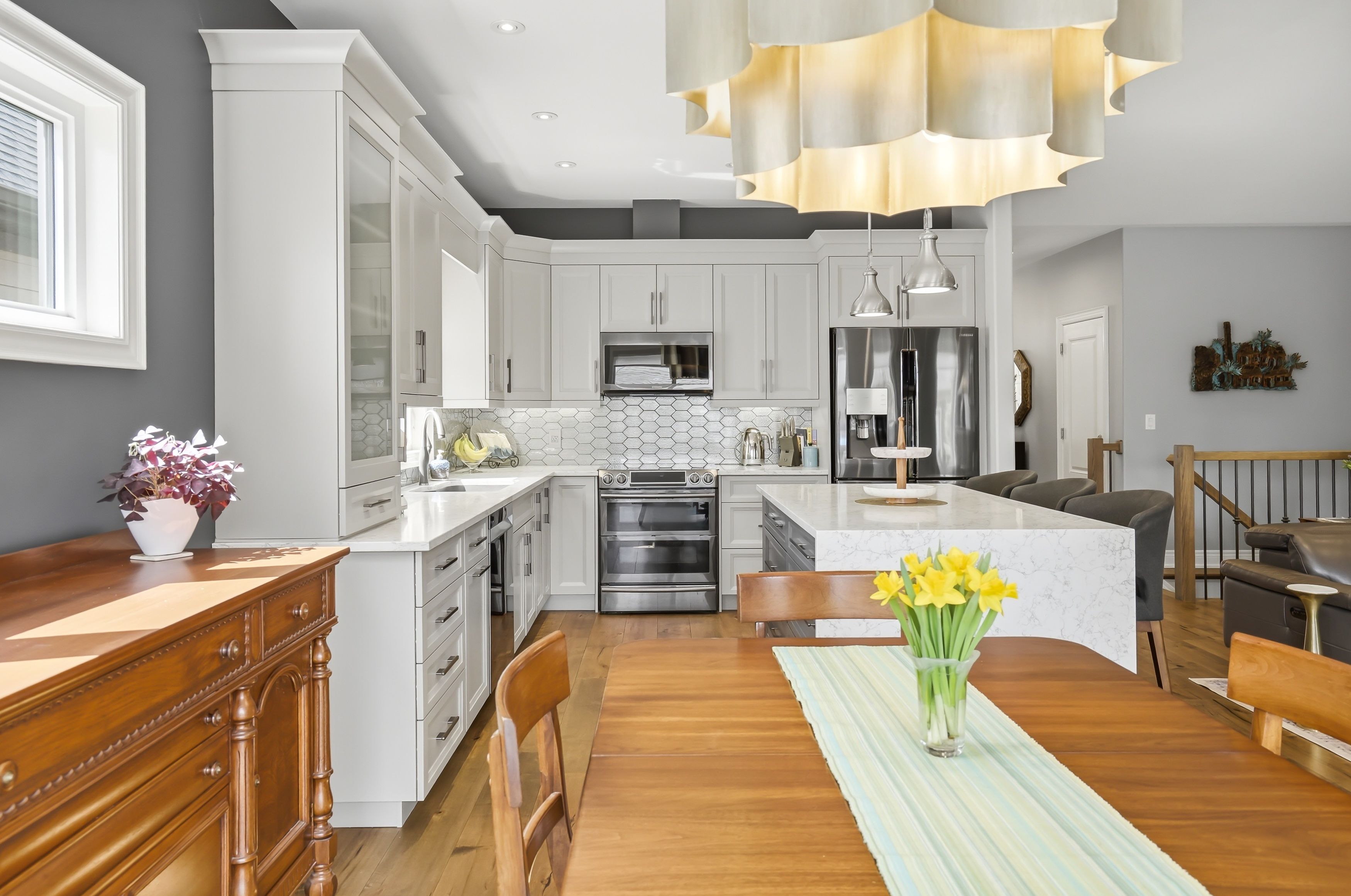 • Extended kitchen featuring quartz counters and high-end Samsung appliances.