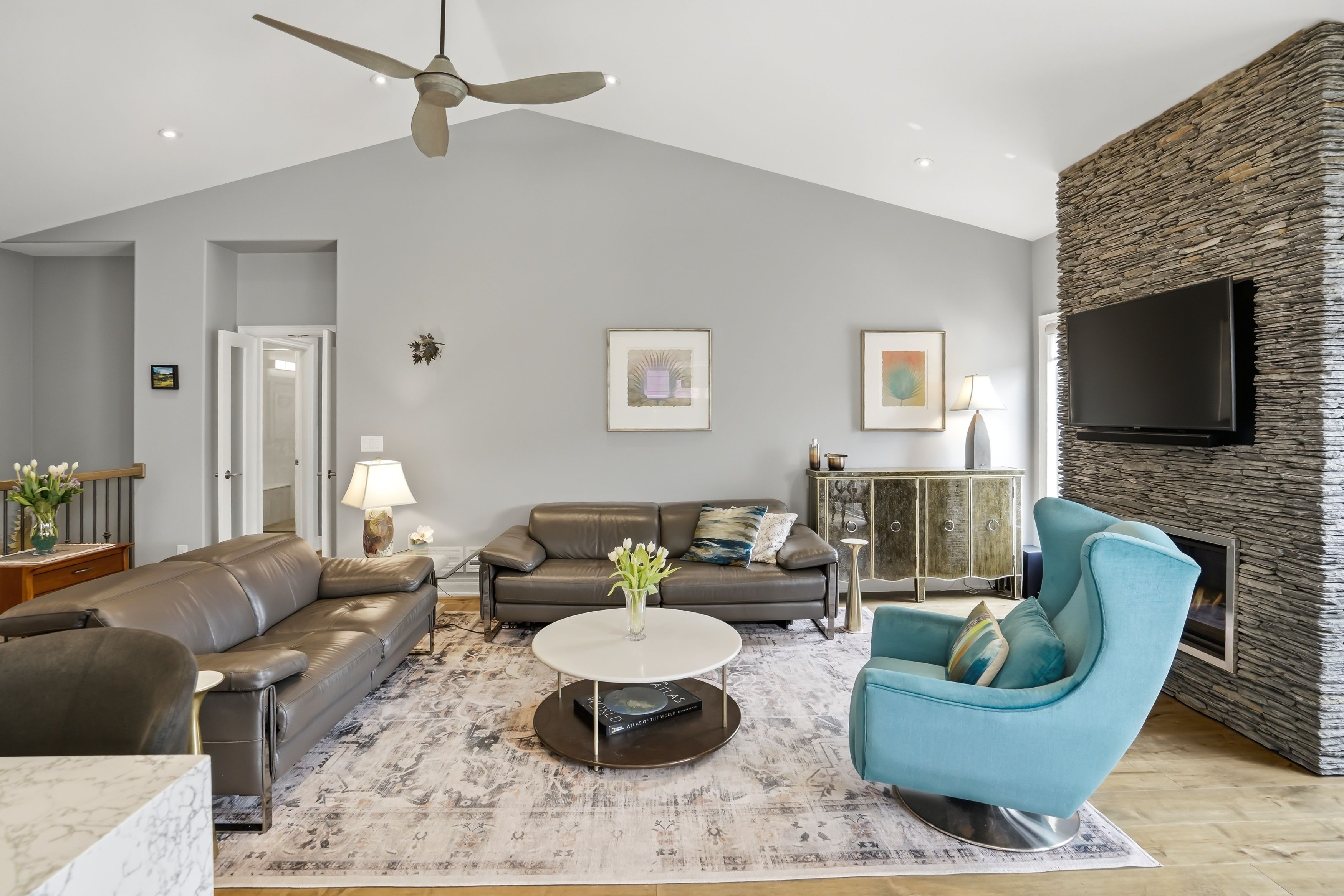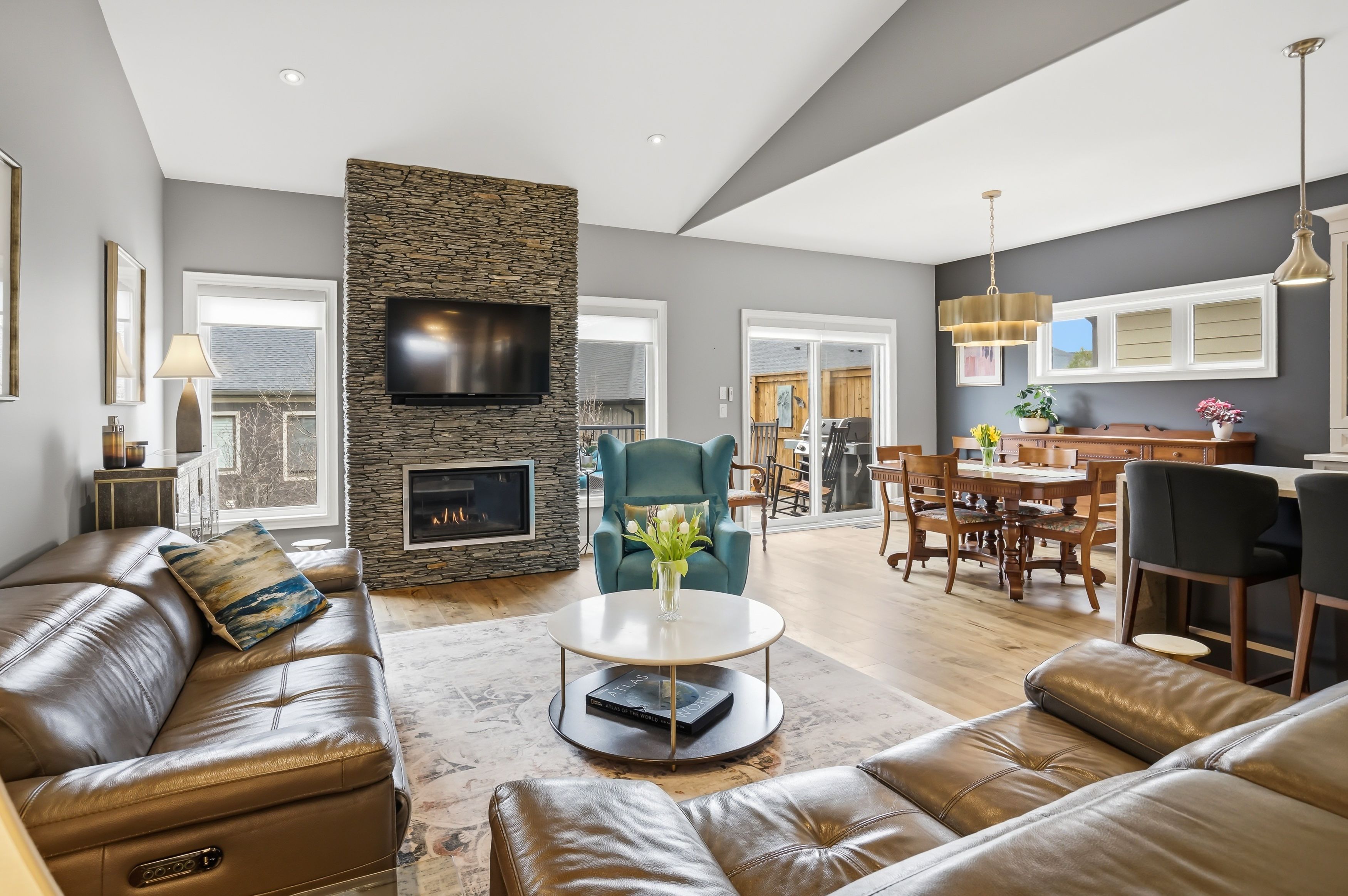 • Spacious living room with vaulted ceilings and a stone gas fireplace.