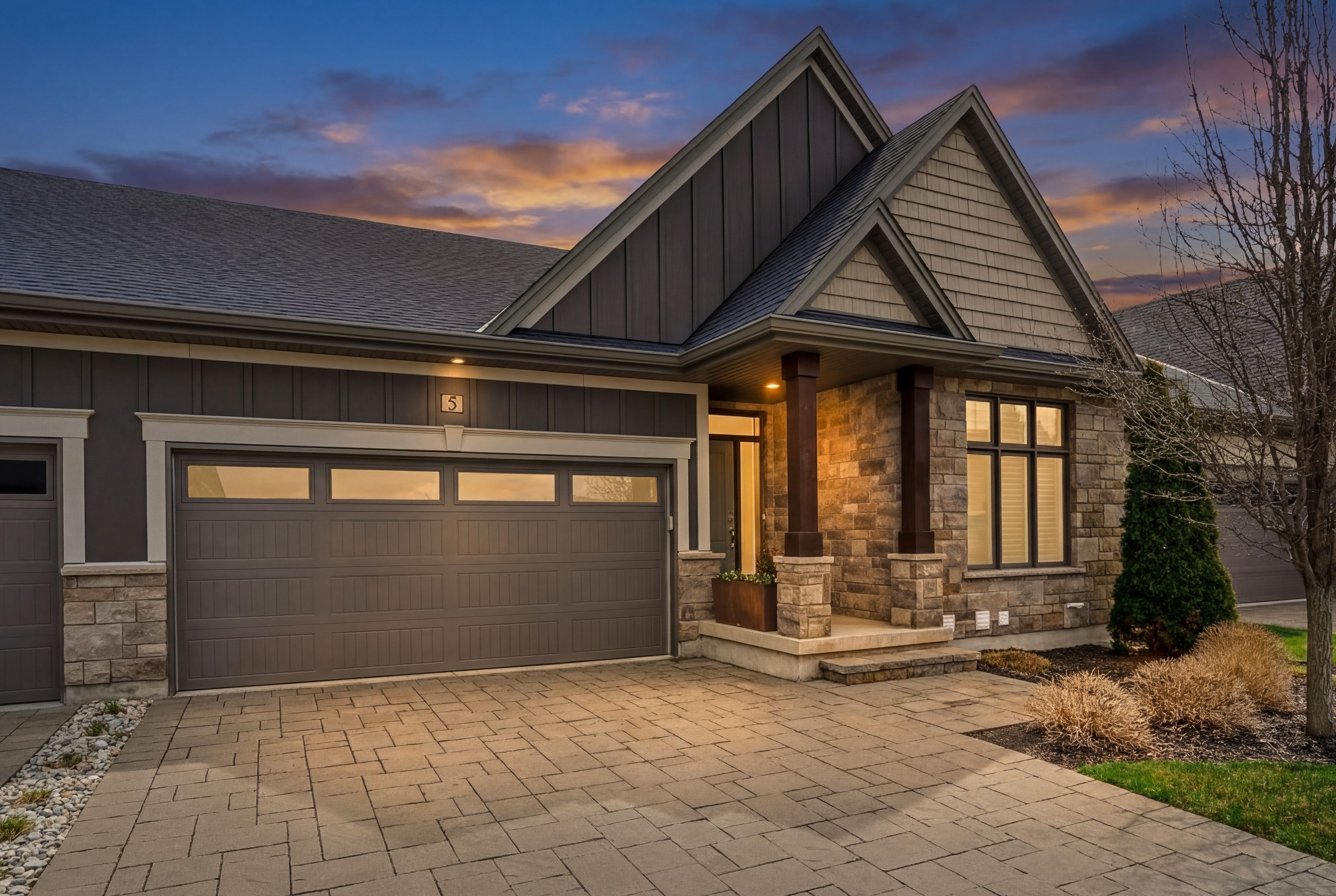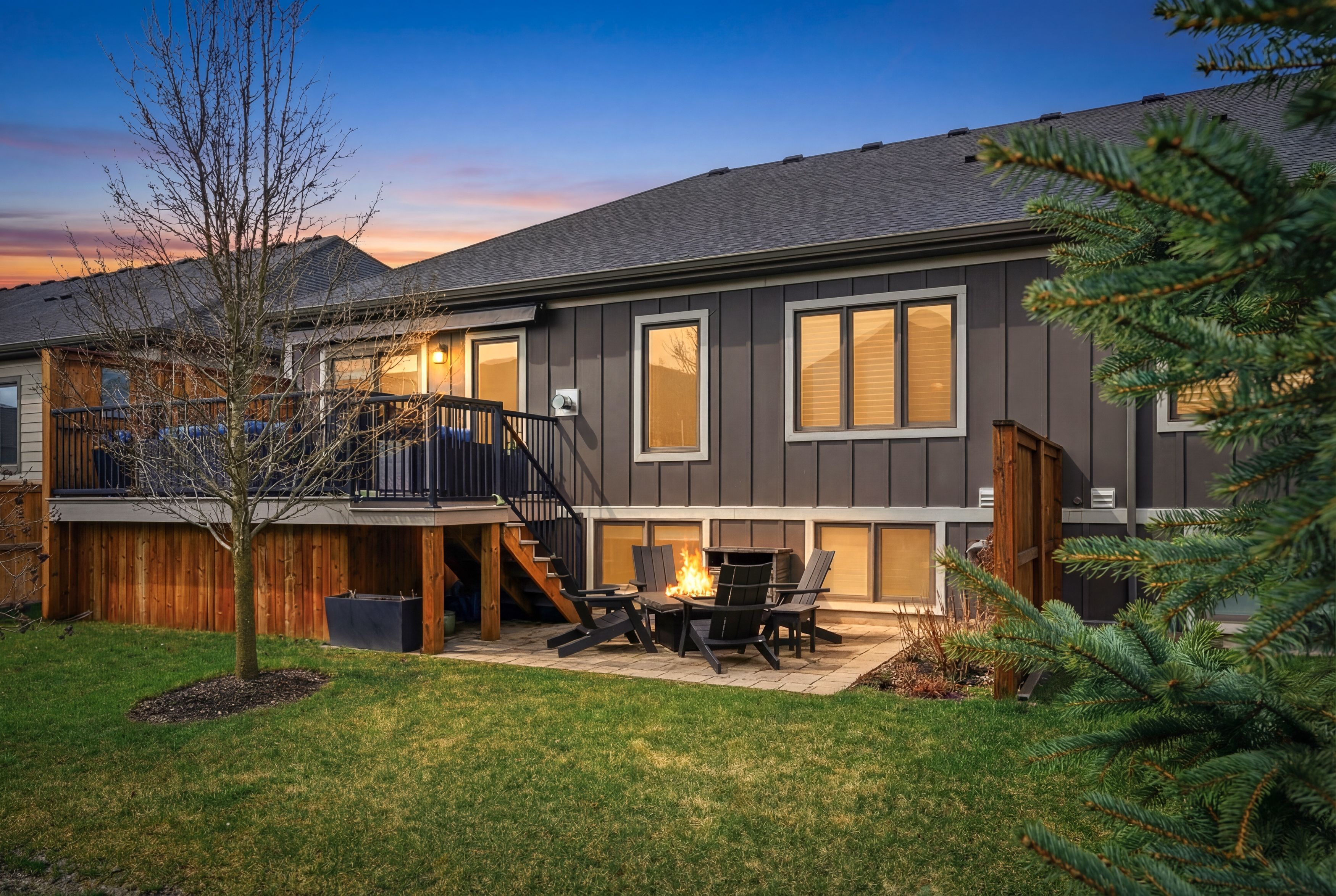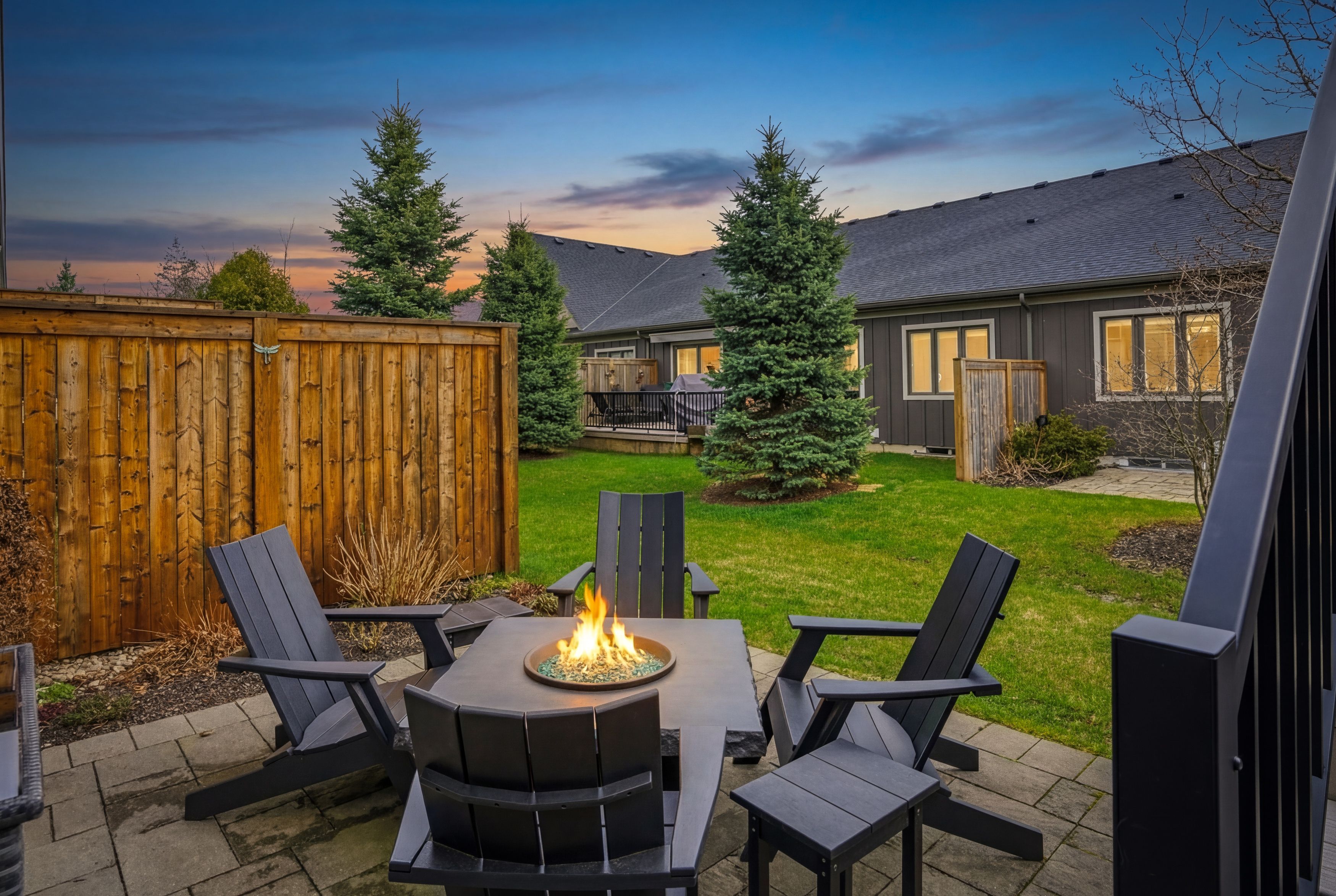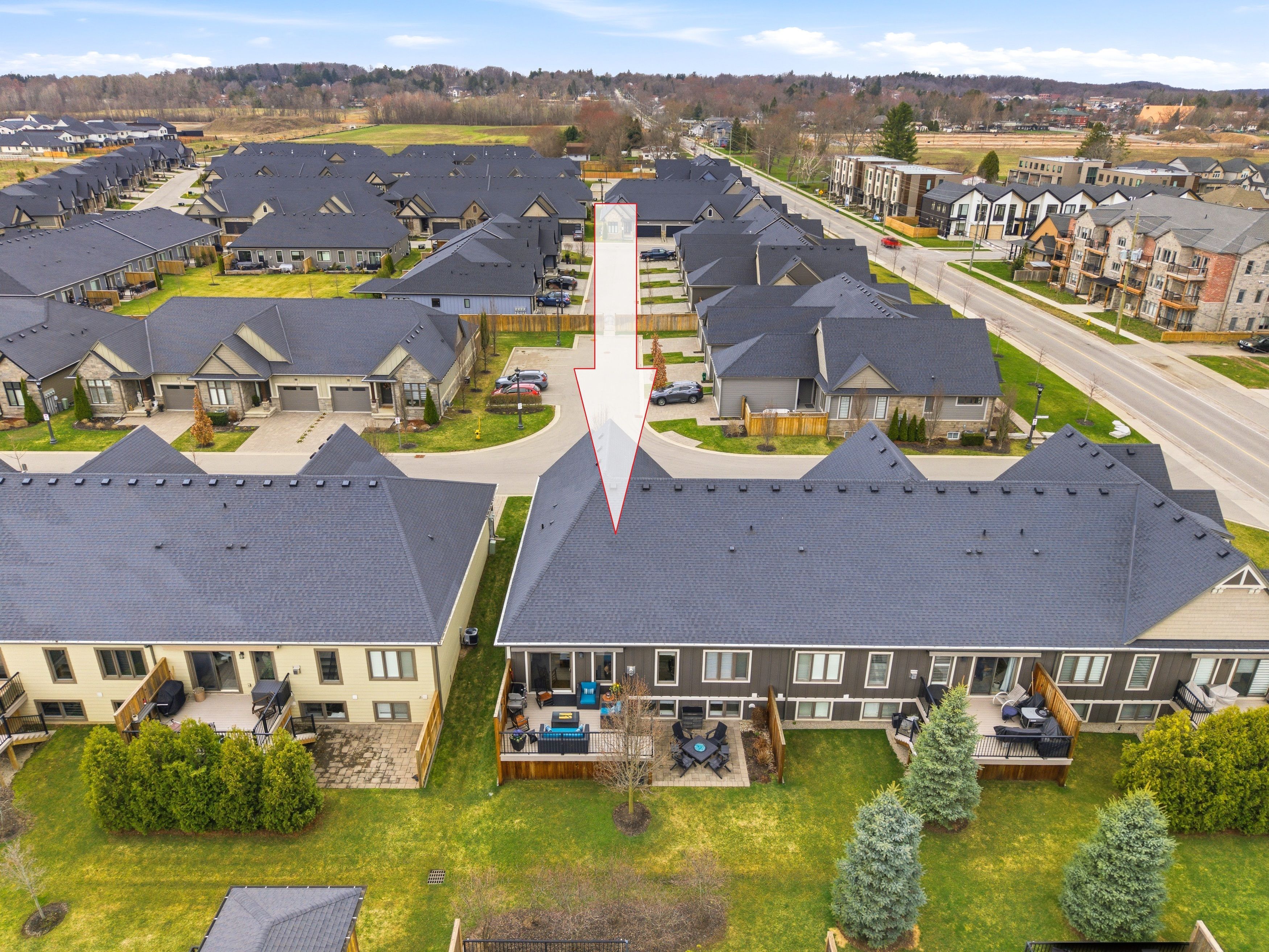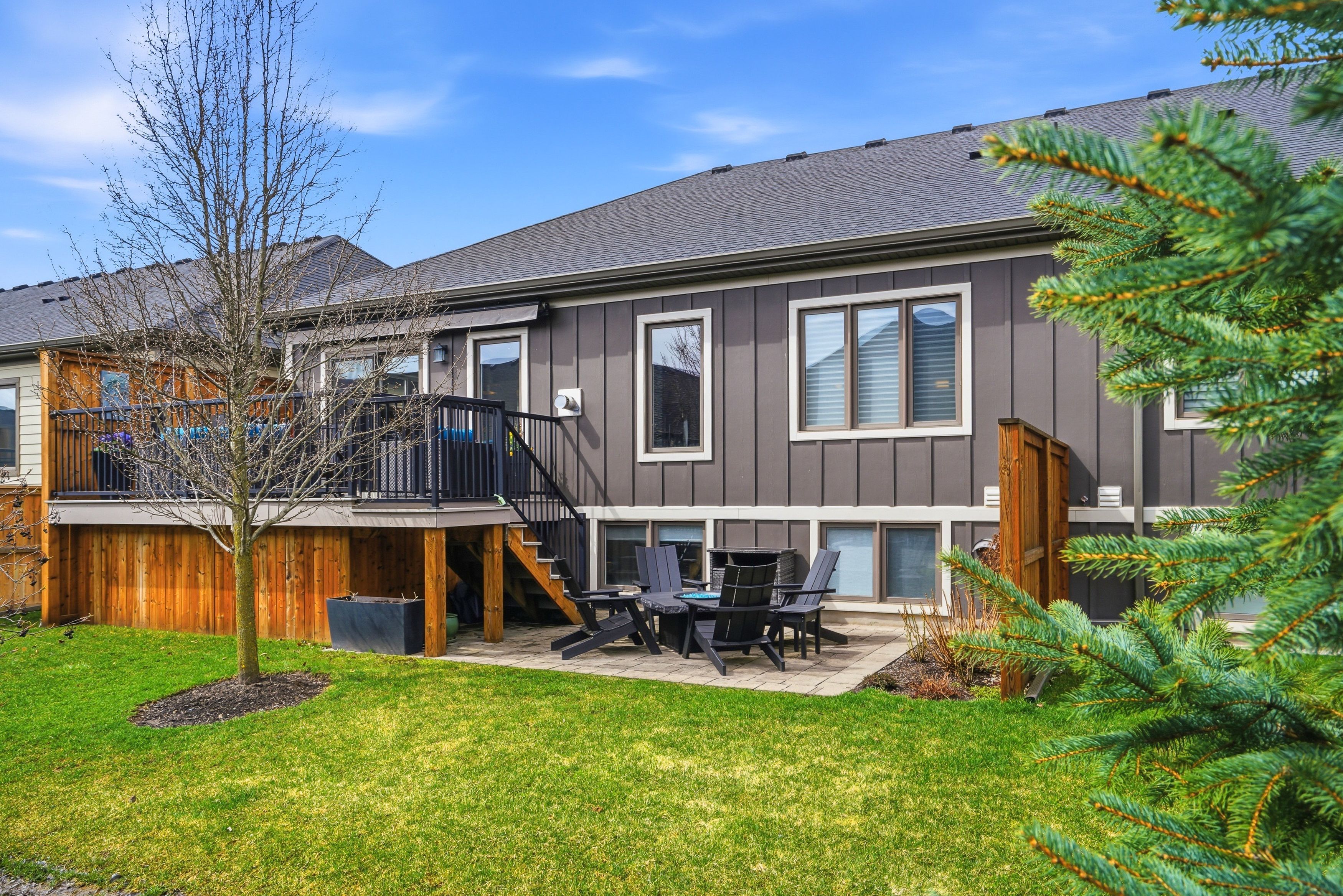 Beautifully upgraded end unit bungalow townhome by grey forest homes in sought-after fonthill. A covered porch leads into a bright foyer with coffered 10 foot ceilings, while the main floor showcases impressive 9 to 12 ft ceiling heights, wide plank engineered hardwood, high-end ceiling fans and light fixtures, and dual-function sheer blinds throughout. The front hall offers direct access into the double car garage with insulated door and liftmaster opener. The guest bedroom, currently used as an office, features a cathedral ceiling and transom windows. Nearby is a stunningly upgraded 3pc bath with freestanding soaker tub, beautiful floor-to-ceiling tiled feature walls, and waterfall-edge vanity, along with a convenient oversized laundry closet. The living room impresses with vaulted ceilings, pot lighting, and a floor-to-ceiling stone gas fireplace. The extended kitchen features quartz counters, a waterfall island, tiled backsplash, valance lighting, and upgraded samsung graphite appliances. Step out from the dining area to a 16x12 composite deck with power awning and gas bbq line, overlooking a lower patio area. The primary suite offers coffered ceilings, walk-in closet, and a private ensuite with quartz counters, towel storage shelving, and a glass/tiled shower with bench. An open railing staircase leads to a bright lower level featuring oversized windows, luxury vinyl plank flooring, a huge family room with home office area, a large 3rd bedroom with double closet, 3pc bath with step-in shower, and a storage room. Includes 200amp service, c/a, hrv and superior wood i-beam floor joists. Enjoy a "lock & leave" lifestyle with low-maintenance living and a minimal condo fee covering landscaping and snow removal - offering strong value compared to traditional condo fees. Visitor parking is conveniently located across from the home. A rare blend of quality construction, thoughtful upgrades, and easy living in one of niagara's most desirable small town feel communities!