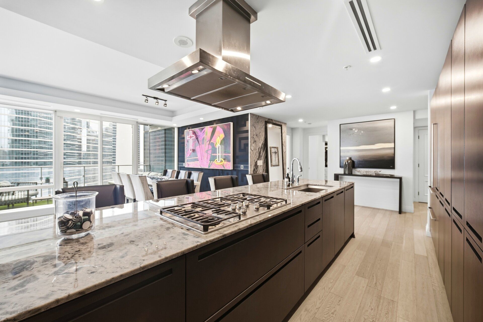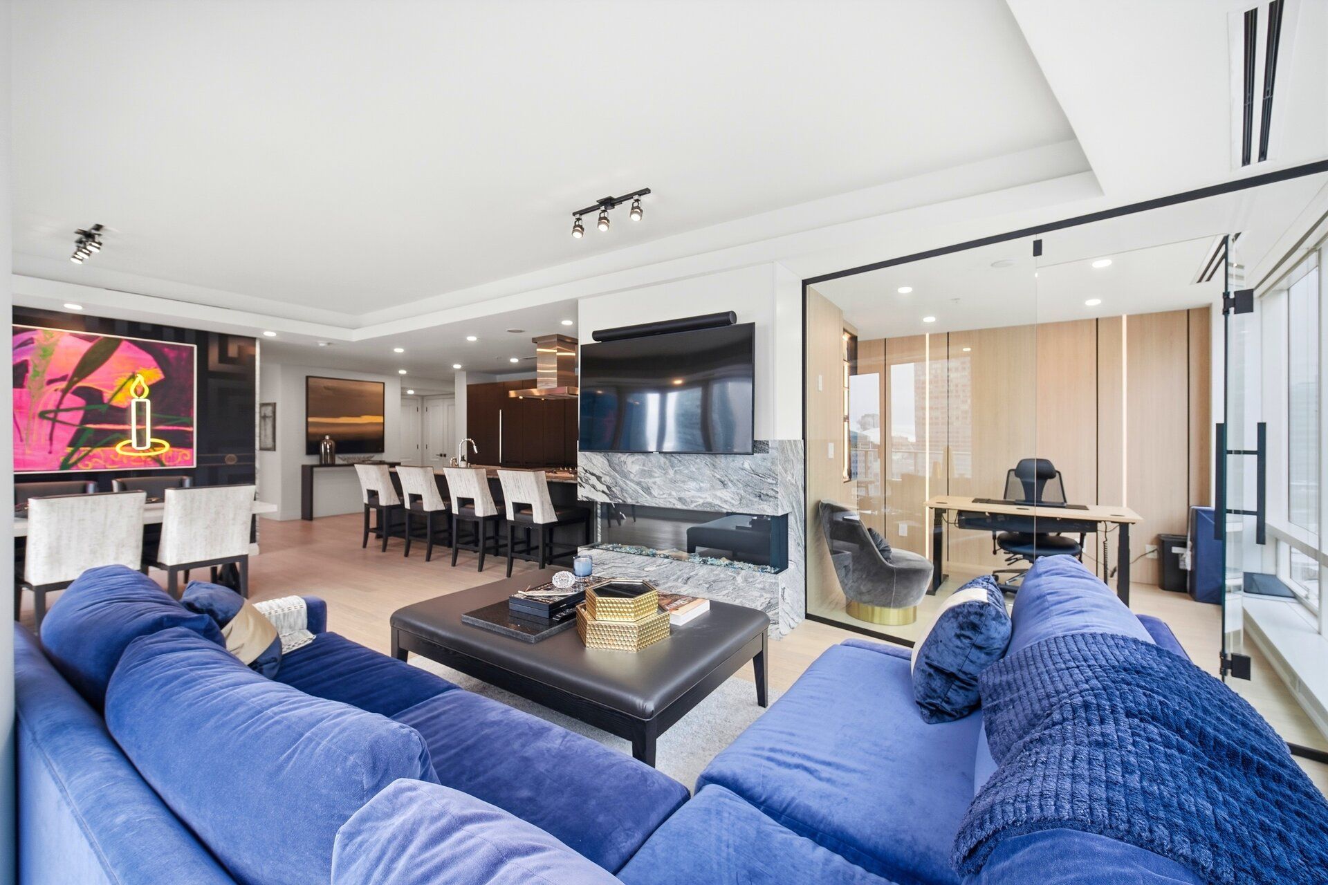 Shangri-la hotel & residences in the heart of toronto's financial and entertainment districts. This extensively upgraded 1,683 sq ft south-east corner suite offers 2 bedrooms + enclosed den and 2. 5 baths with breathtaking, unobstructed views of the cn tower, toronto skyline, and the vibrant core of the city. Featuring brand new hardwood flooring throughout, a custom-built bar seamlessly integrated into the designer boffi kitchen with bespoke shelving, and premium miele& sub-zero appliances. The large primary bedroom showcases a custom-built walk-in closet and a stunning 5-piece ensuite finished in carrara marble countertops and floors, complete with a full soaker tub and separate glass-enclosed shower. Each bedroom features its own privateensuite bath, offering elevated comfort and privacy. The den is enclosed with sleek glass doors, creating a fully separate executive office or optional third bedroom. The dining room is elevated with custom versace wallpaper, while the living area is anchored by a statement marble fireplace. Residents enjoy 24-hour concierge, valet, doorman service, and access to five-star hotel amenities including lobby bar, full-service spa, fitness centre, yoga & spin studios, indoor pool, hot tub, and in-suite hotel services.