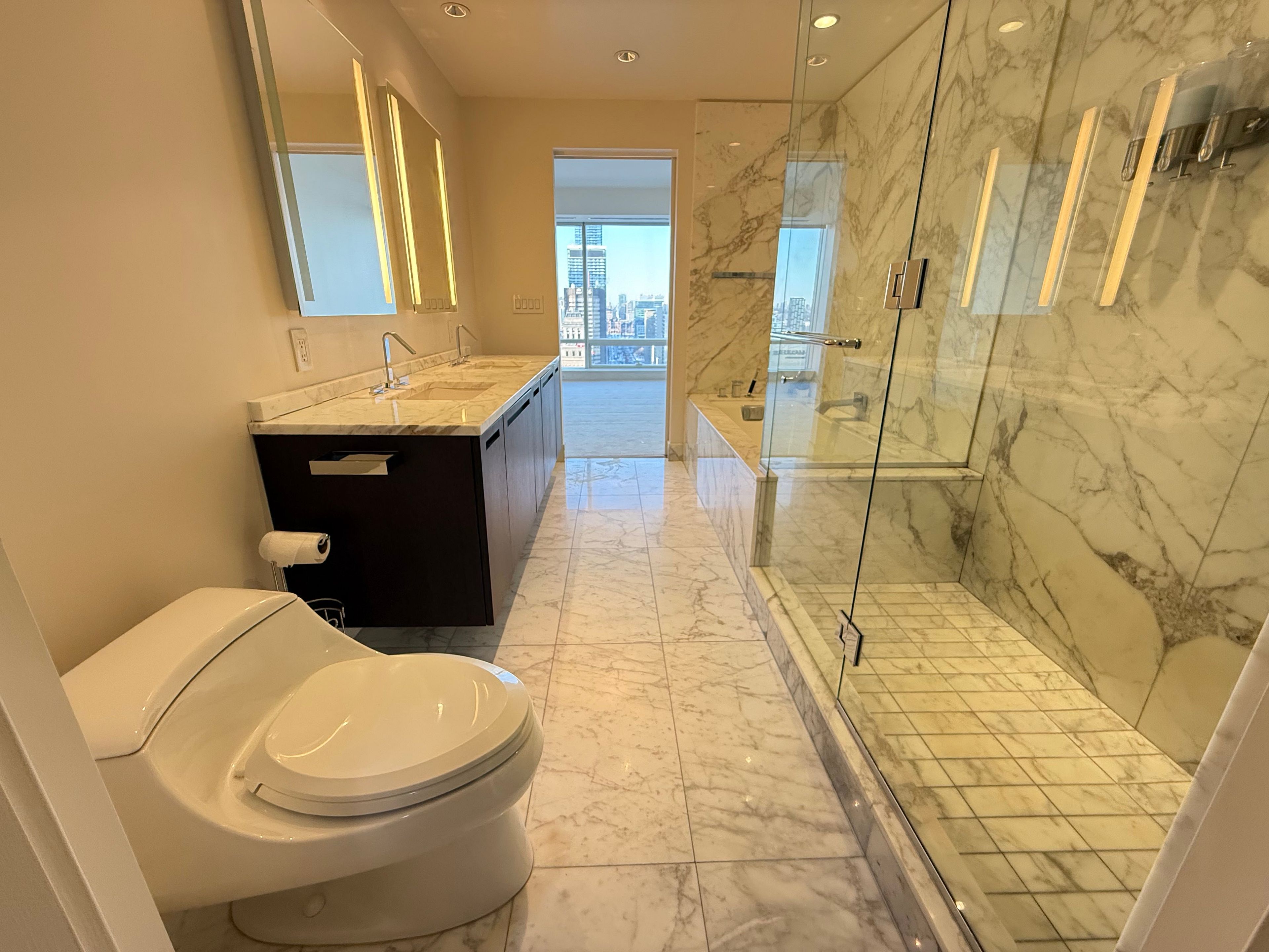 • Spacious corner suite with stunning city views through large windows.