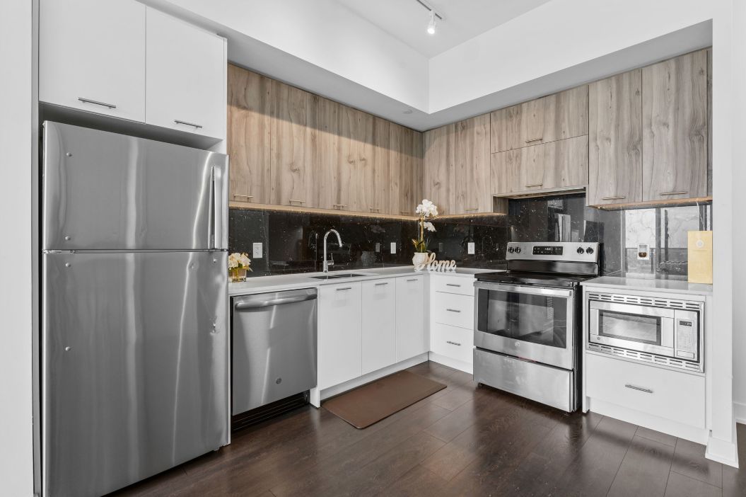 • Sleek kitchen equipped with quartz counters and stainless steel appliances.