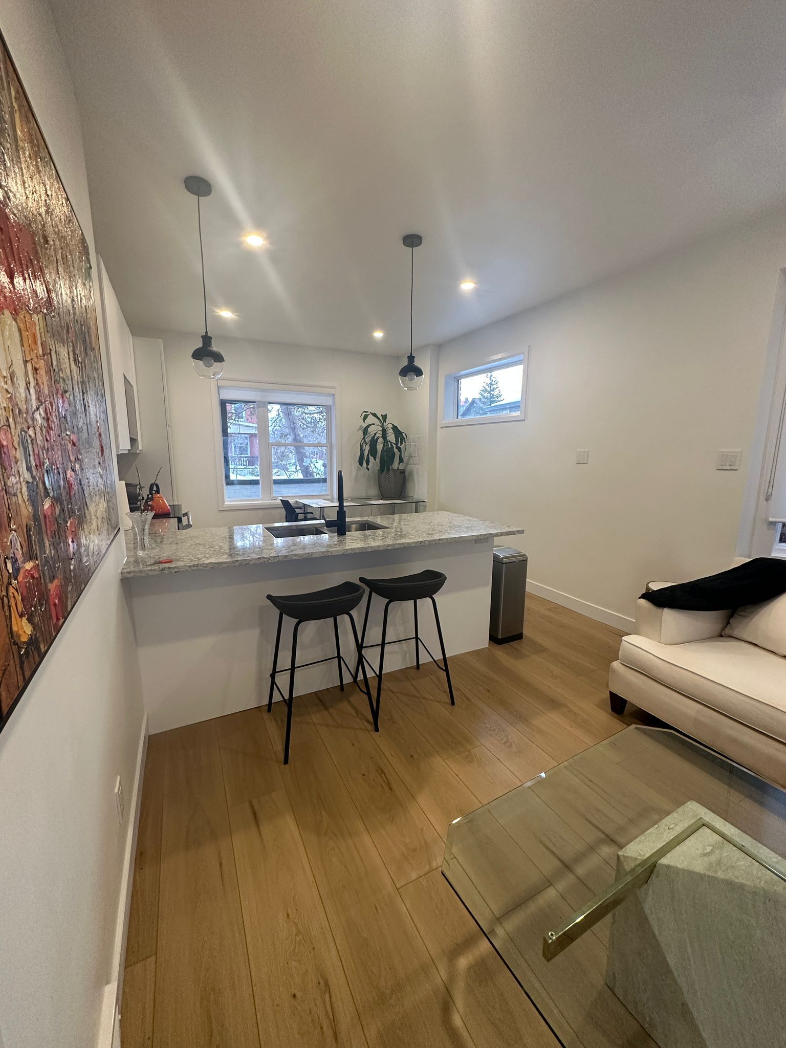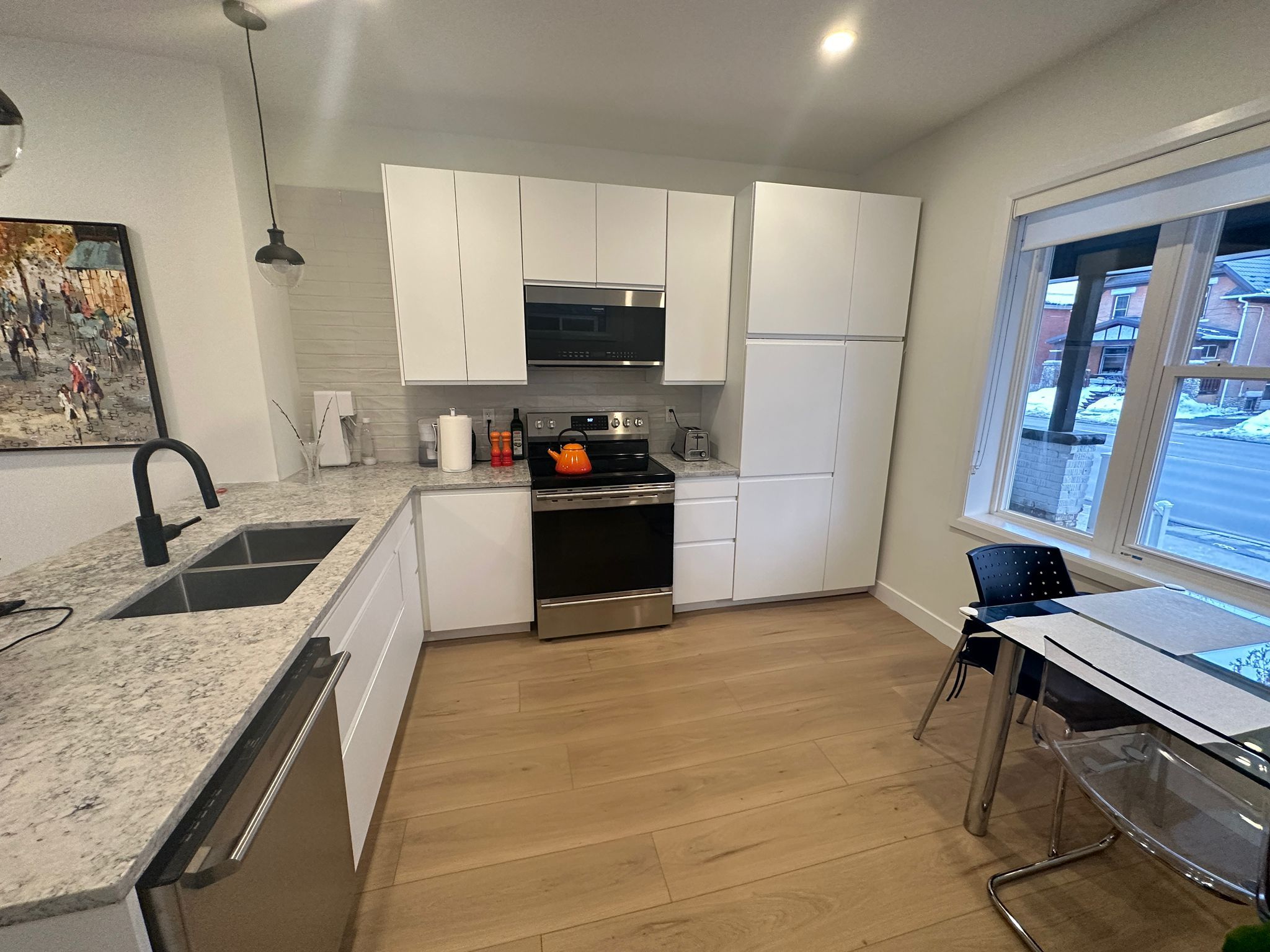 Discover modern city living at its finest in this beautifully renovated and fully furnished 1-bedroom, 1-bath apartment located at 180 weber st e in the heart of kitchener. Thoughtfully designed with style and comfort in mind, this stunning unit features a sleek built-in kitchen that blends seamlessly into the living space, highlighted by elegant stone countertops, a stylish backsplash, and premium finishes. The open-concept layout is complemented by light wood vinyl laminate flooring and pot lights with dimmers, creating a warm and inviting ambiance. The living room and bedroom come fully furnished with tasteful, contemporary décor, offering a move-in-ready experience perfect for professionals or couples. Enjoy the convenience of a brand-new ensuite bathroom with a modern stand-up shower, showcasing quality craftsmanship and attention to detail throughout. A new stackable washer and dryer are included for tenants' use, providing the ultimate in-suite convenience. Step outside onto your private porch - the perfect spot to unwind and enjoy the outdoors in peace and comfort. High-speed internet is included, and the unit comes with one exclusive parking space. Situated just minutes from downtown kitchener, uptown waterloo, and major highways, this apartment offers easy access to shops, restaurants, public transit, and all the amenities of urban living while maintaining a peaceful and private atmosphere. Whether you're commuting, studying, or simply enjoying city life, this apartment delivers the perfect balance of sophistication, functionality, and convenience - a true turnkey home in one of the region's most connected and desirable locations.