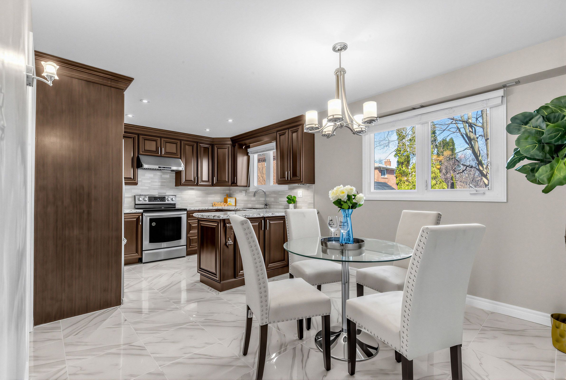 • Majestic backyard with mature trees, perfect for entertaining.