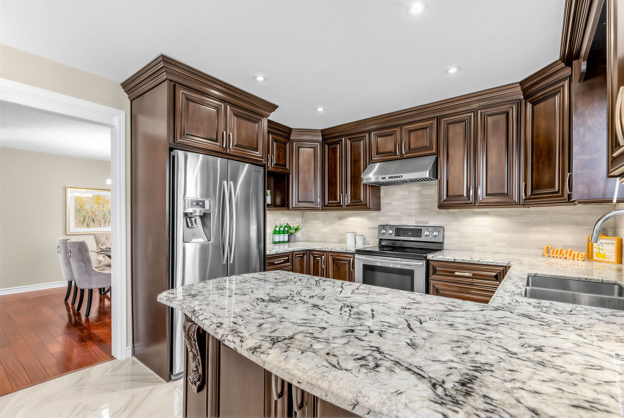 • Elegant kitchen with custom cabinetry and granite countertops.