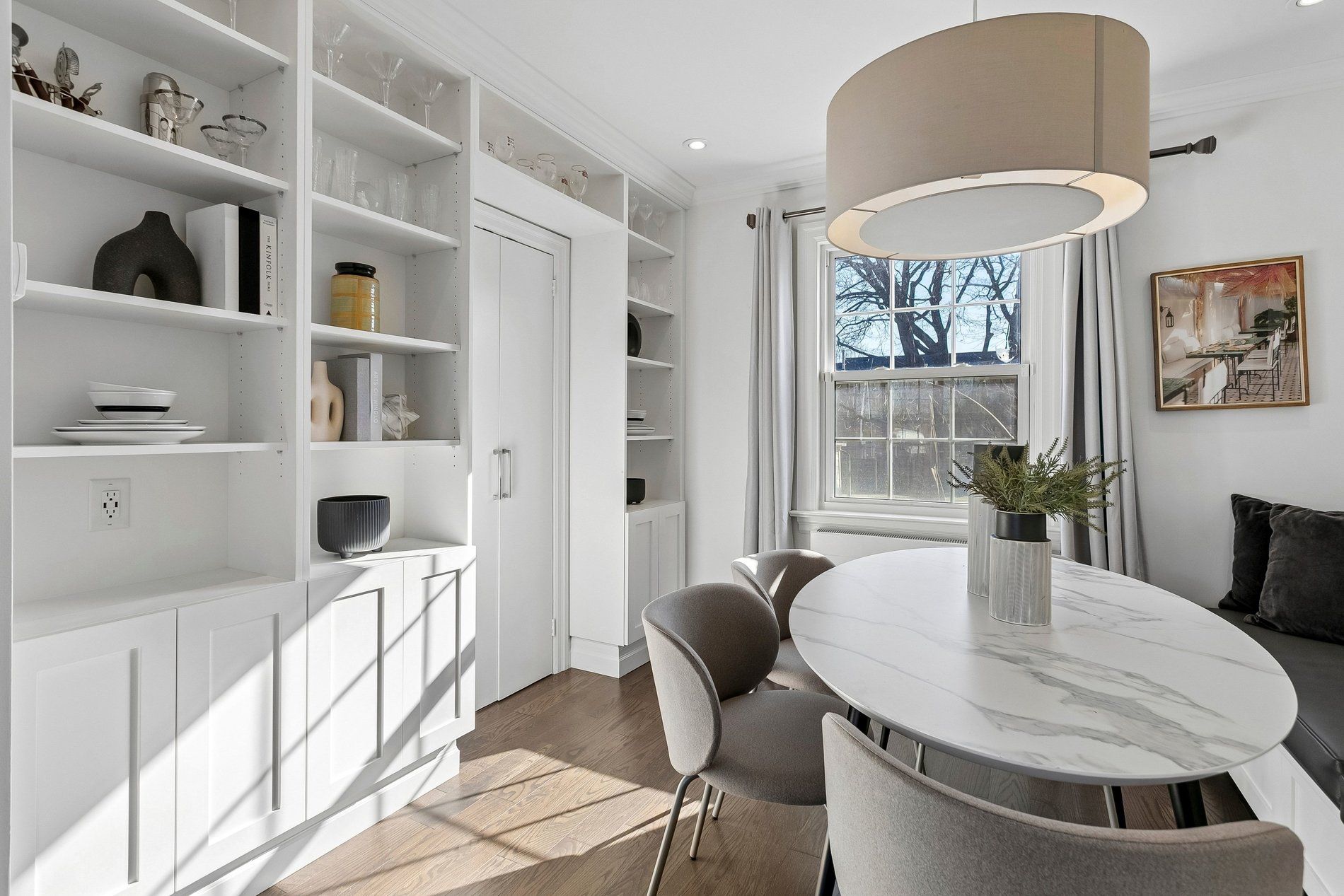 • Spacious main floor with custom cabinetry and hardwood flooring.