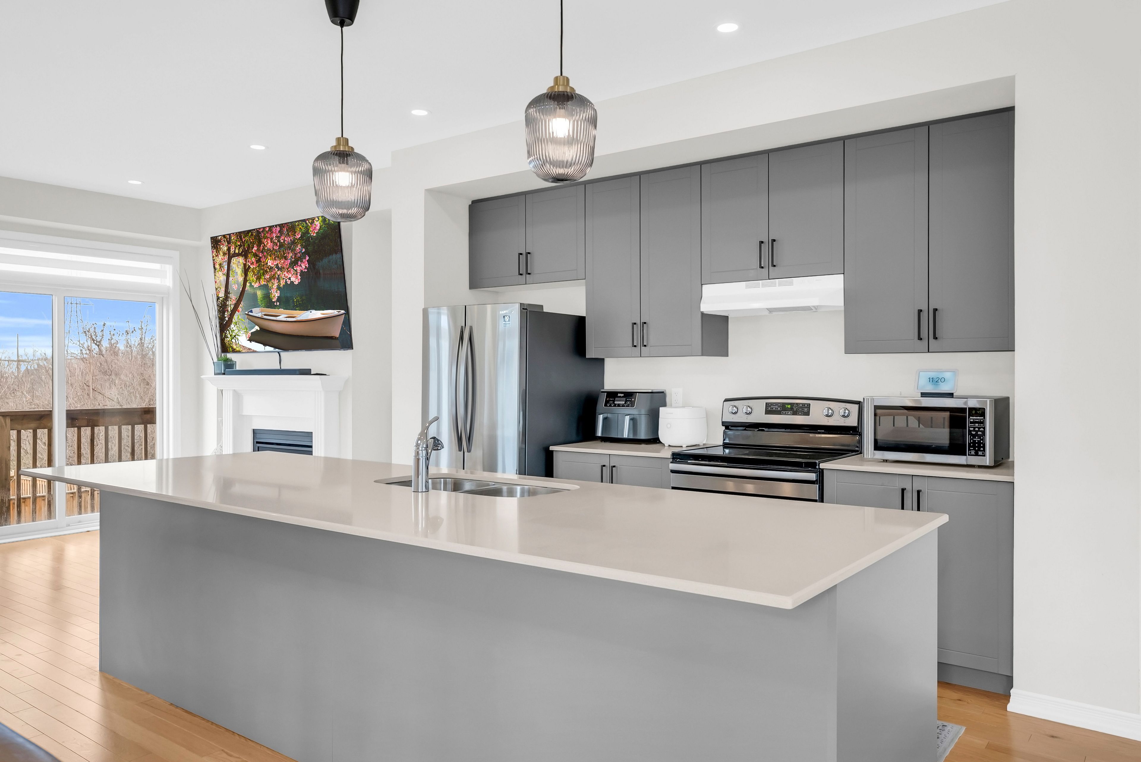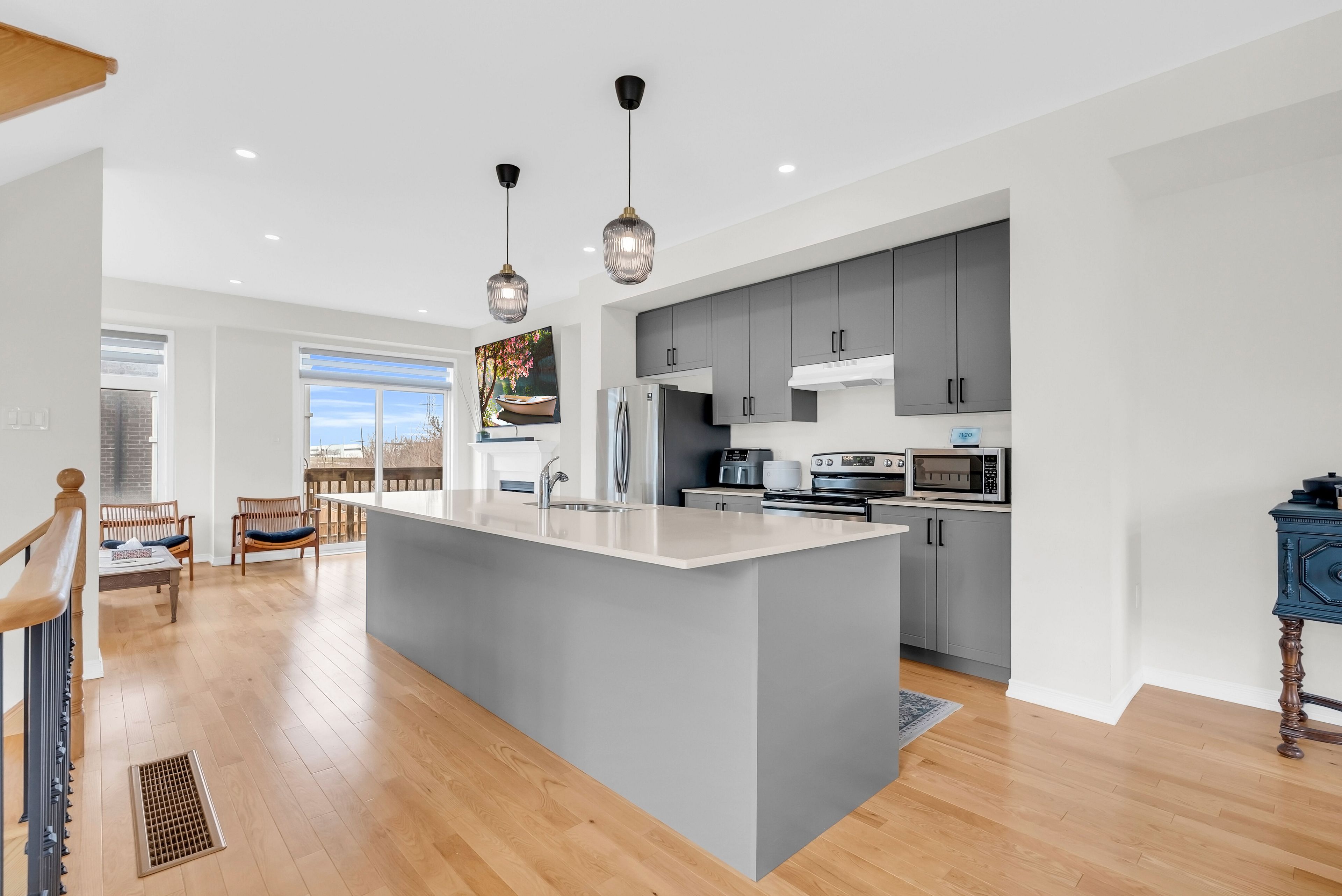 Welcome to this beautifully maintained home nestled in a quiet and family-friendly community! This spacious open concept property showcases modern and elegant finishes throughout, offering both comfort and style. Featuring high ceilings, hardwood floors, and large windows that fill the home with an abundance of natural light. The contemporary kitchen is equipped with stainless steel appliances, a stylish breakfast bar, and ample counter space perfect for everyday living and entertaining. Enjoy generously sized bedrooms, including a primary retreat complete with a walk-in closet and a private ensuite. Additional features include versatile living spaces ideal for a home office or family use. This smart-enabled home comes equipped with a google nest thermostat, three permanently installed security cameras (no monthly fees), and door and motion sensors for added convenience and peace of mind. Conveniently located just minutes from public transit and major highways, and close to shopping, restaurants, parks, and more, this home truly has it all!