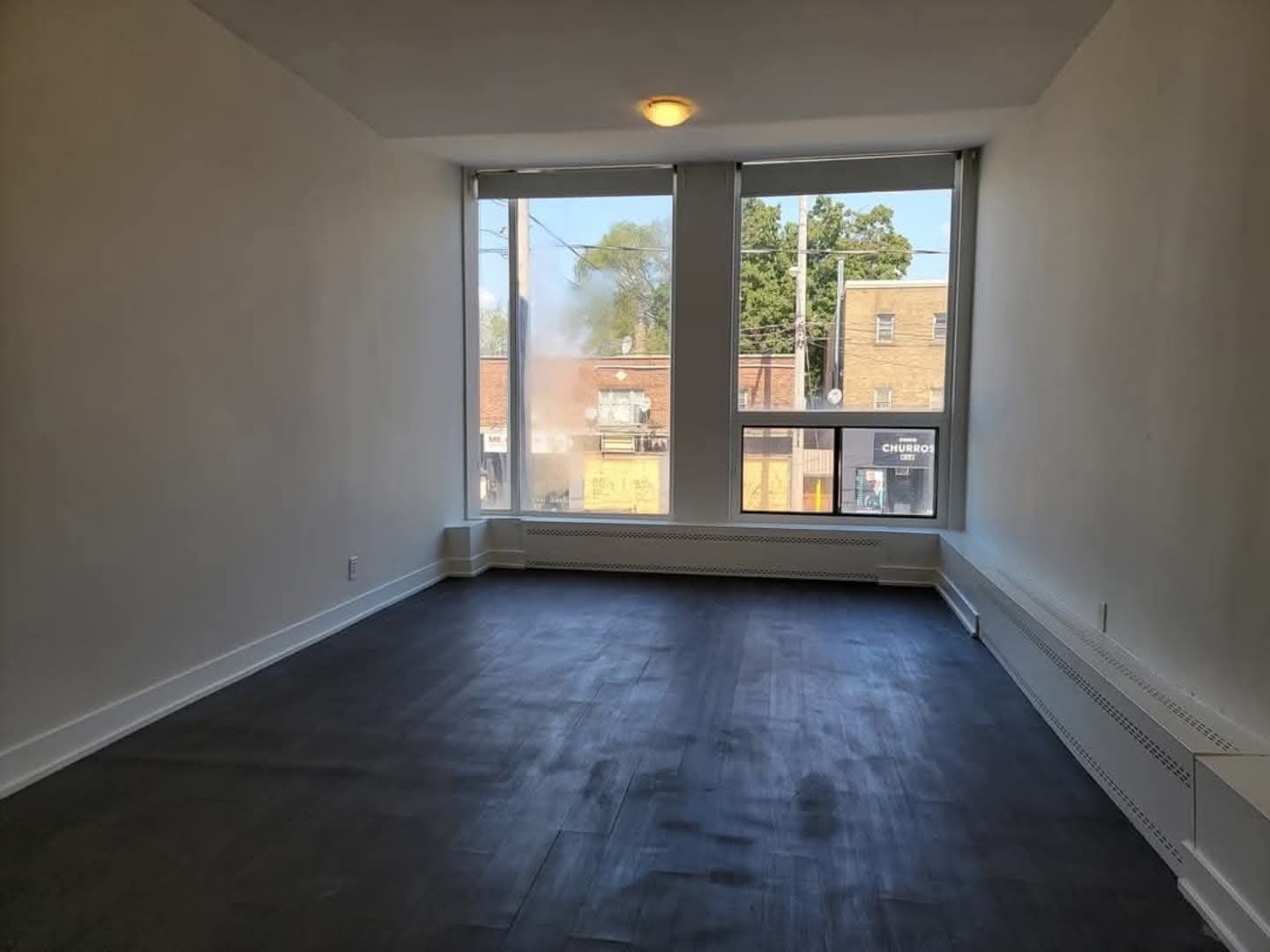 • Open concept bachelor apartment with large windows for natural light.