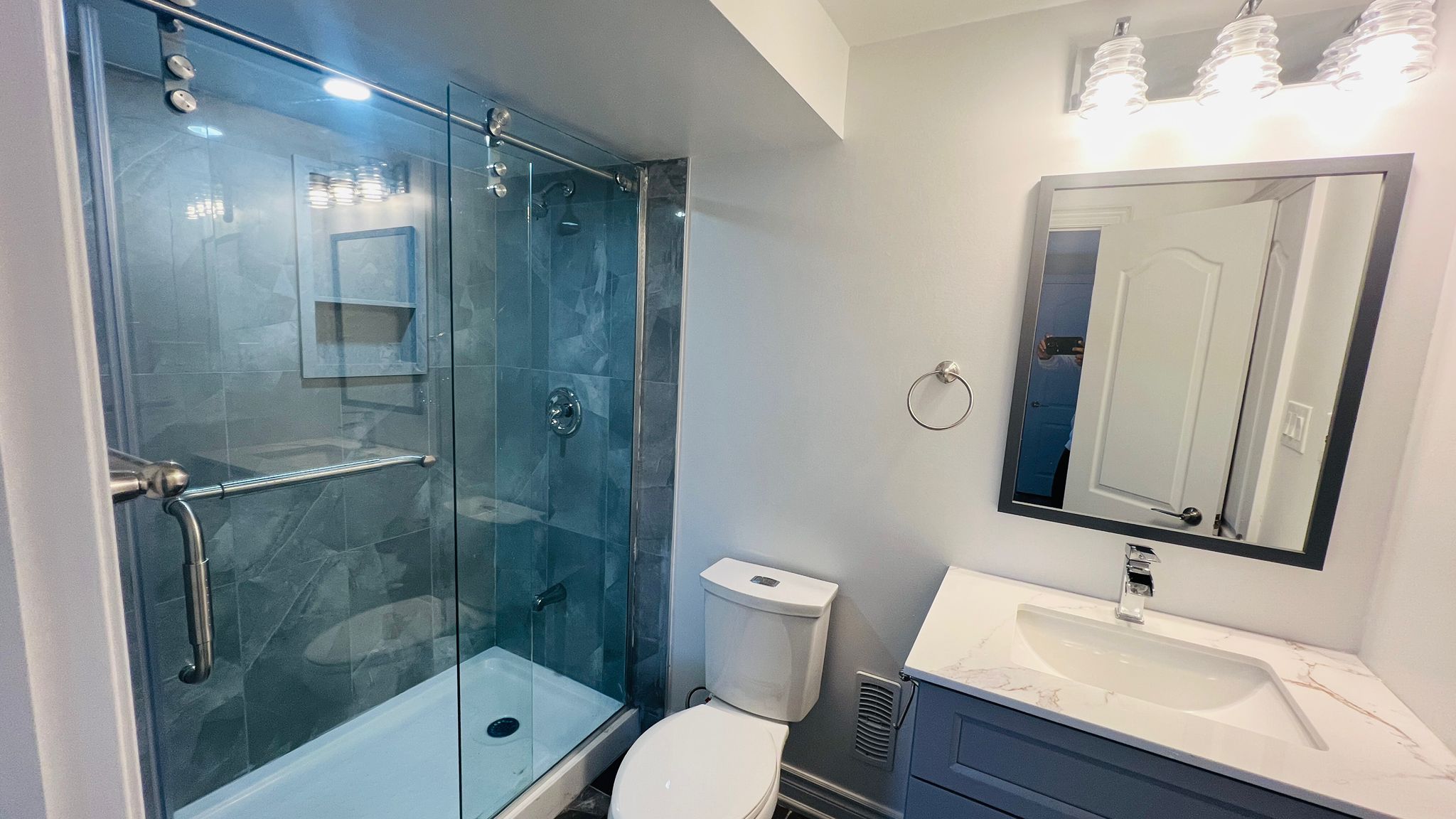 • Stylish bathroom features a glass-enclosed standing shower and stone vanity.