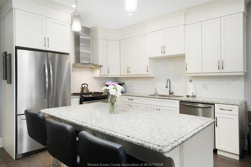 • Well-equipped kitchen with white cabinets, oversized island, and granite countertops.